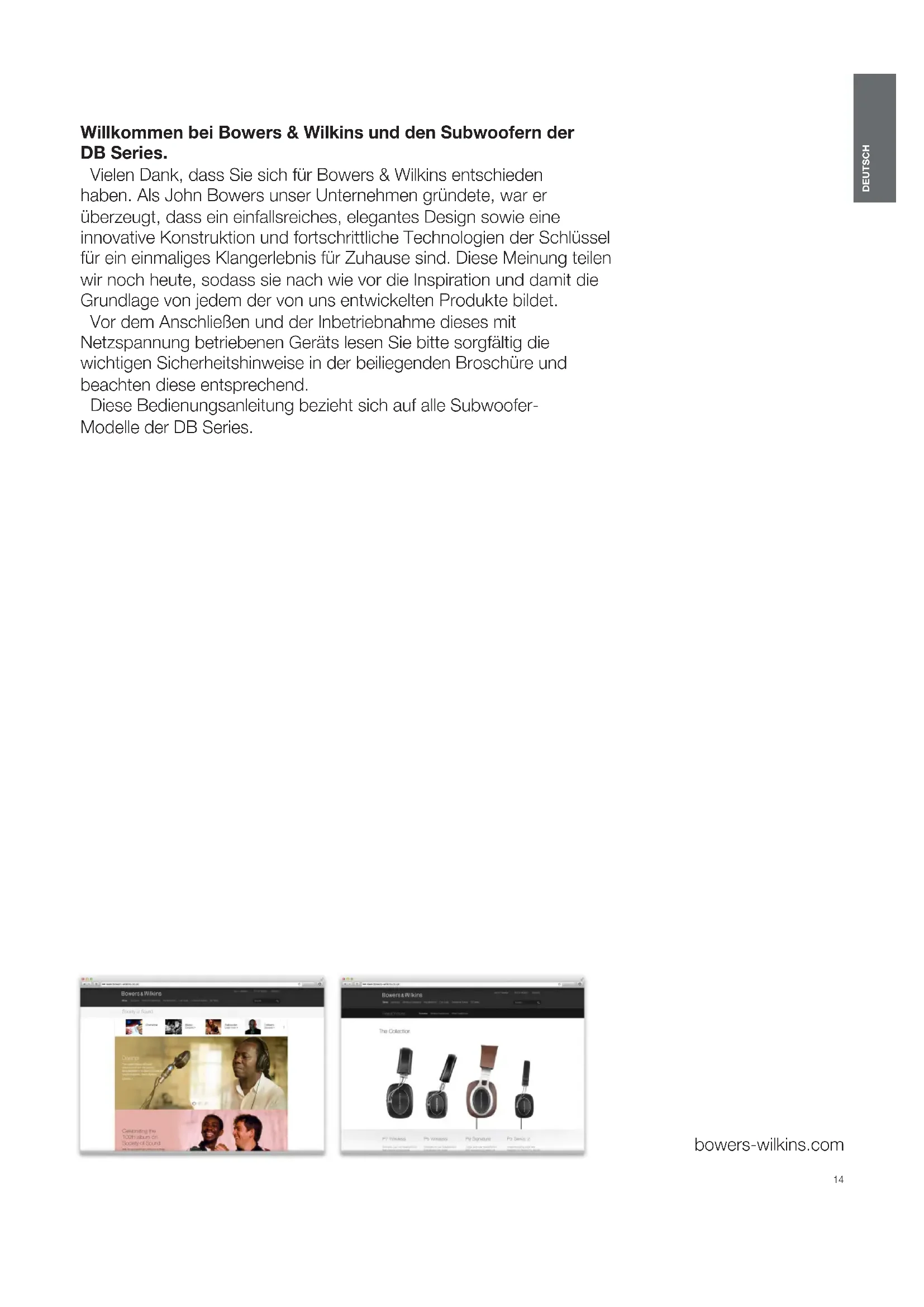 Si vous avez besoin d'aide concernant les caissons de graves DB Series, rendez-vous sur le site d'assistance ici. Page d'accueil Page de conguration de l'entrée14 DEUTSCH bowers-wilkins.com Willkommen bei Bowers & Wilkins und den Subwoofern der DBSeries. Vielen Dank, dass Sie sich für Bowers & Wilkins entschieden haben. Als John Bowers unser Unternehmen gründete, war er überzeugt, dass ein einfallsreiches, elegantes Design sowie eine innovative Konstruktion und fortschrittliche Technologien der Schlüssel für ein einmaliges Klangerlebnis für Zuhause sind. Diese Meinung teilen wir noch heute, sodass sie nach wie vor die Inspiration und damit die Grundlage von jedem der von uns entwickelten Produkte bildet. Vor dem Anschließen und der Inbetriebnahme dieses mit Netzspannung betriebenen Geräts lesen Sie bitte sorgfältig die wichtigen Sicherheitshinweise in der beiliegenden Broschüre und beachten diese entsprechend. Diese Bedienungsanleitung bezieht sich auf alle Subwoofer- Modelle der DBSeries. DEUTSCH Inhalt DEUTSCH 1