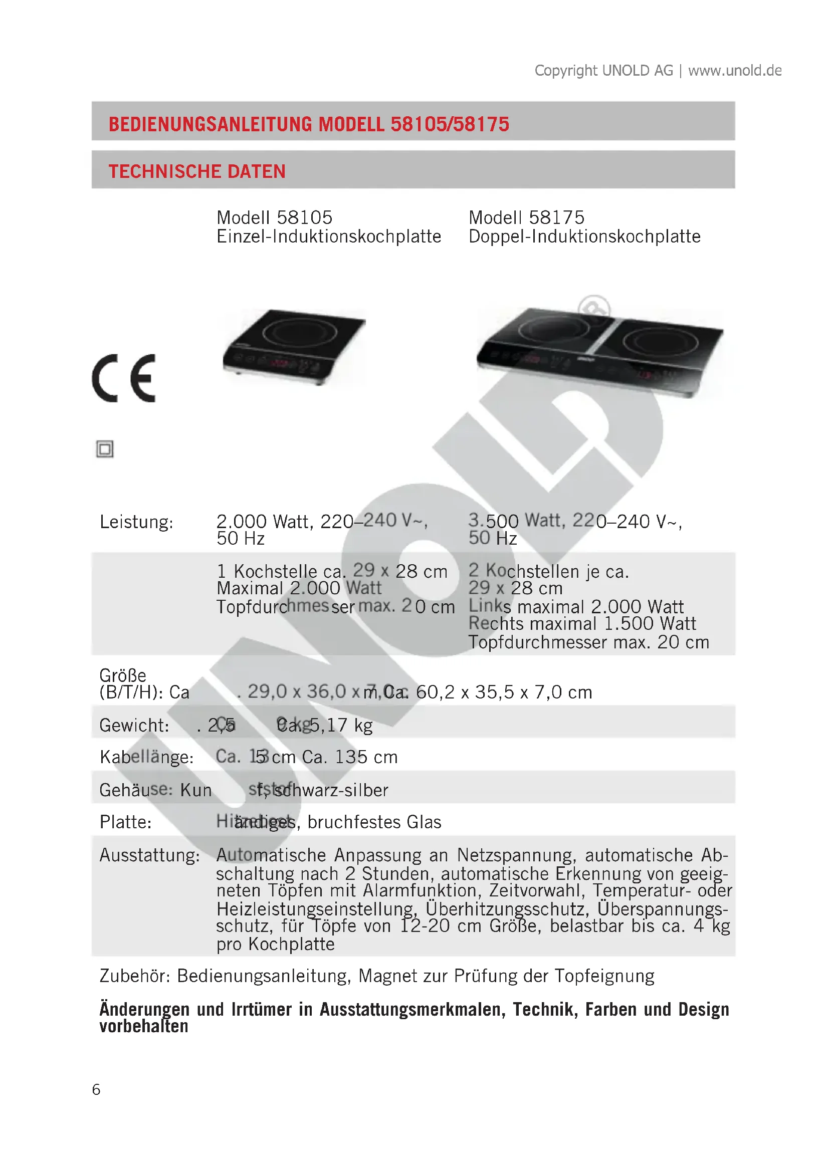 50 Hz 1 Kochstelle ca. 29 x 28 cm Maximal 2.000 Watt Topfdurchmesser max. 20 cm 2 Kochstellen je ca. 29 x 28 cm Links maximal 2.000 Watt Rechts maximal 1.500 Watt Topfdurchmesser max. 20 cm Größe (B/T/H): Ca. 29,0 x 36,0 x 7,0 cm Ca. 60,2 x 35,5 x 7,0 cm Gewicht: Ca. 2,59 kg Ca. 5,17 kg Kabellänge: Ca. 135 cm Ca. 135 cm Gehäuse: Kunststoff, schwarz-silber Platte: Hitzebeständiges, bruchfestes Glas Ausstattung: Automatische Anpassung an Netzspannung, automatische Ab- schaltung nach 2 Stunden, automatische Erkennung von geeig- neten Töpfen mit Alarmfunktion, Zeitvorwahl, Temperatur- oder Heizleistungseinstellung, Überhitzungsschutz, Überspannungs- schutz, für Töpfe von 12-20 cm Größe, belastbar bis ca. 4 kg pro Kochplatte Zubehör: Bedienungsanleitung, Magnet zur Prüfung der Topfeignung Änderungen und Irrtümer in Ausstattungsmerkmalen, Technik, Farben und Design vorbehalten Copyright UNOLD AG | www.unold.de7 SYMBOLERKLÄRUNG Dieses Symbol kennzeichnet eventuelle Gefahren, die Verletzungen nach sich ziehen können oder zu Schäden am Gerät führen. Dieses Symbol weist Sie auf eine eventuelle Verbrennungsgefahr hin. Gehen Sie hier immer besonders achtsam vor. SICHERHEITSHINWEISE Bitte lesen Sie die folgenden Anweisungen und bewahren Sie diese auf.