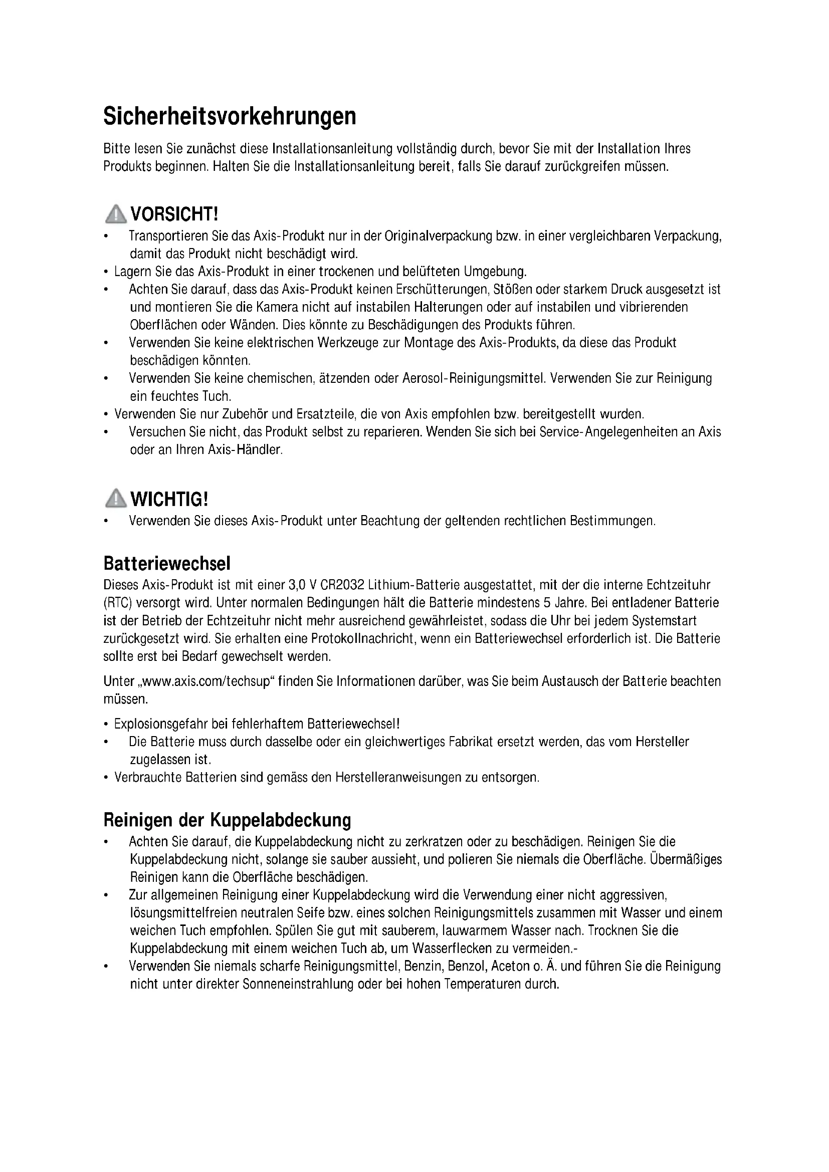 - Verwenden Sie dieses Axis-Produkt unter Beachtung der geltenden rechtlichen Bestimmungen. Batteriewechsel Dieses Axis-Produkt ist mit einer 3,0 V CR2032 Lithium-Batterie ausgestattet, mit der die interne Echtzeituhr (RTC) versorgt wird. Unter normalen Bedingungen hält die Batterie mindestens 5 Jahre. Bei entladener Batterie ist der Betrieb der Echtzeituhr nicht mehr ausreichend gewährleistet, sodass die Uhr bei jedem Systemstart zurückgesetzt wird. Sie erhalten eine Protokollnachricht, wenn ein Batteriewechsel erforderlich ist. Die Batterie sollte erst bei Bedarf gewechselt werden. Unter „www.axis.com/techsup“ finden Sie Informationen darüber, was Sie beim Austausch der Batterie beachten müssen.