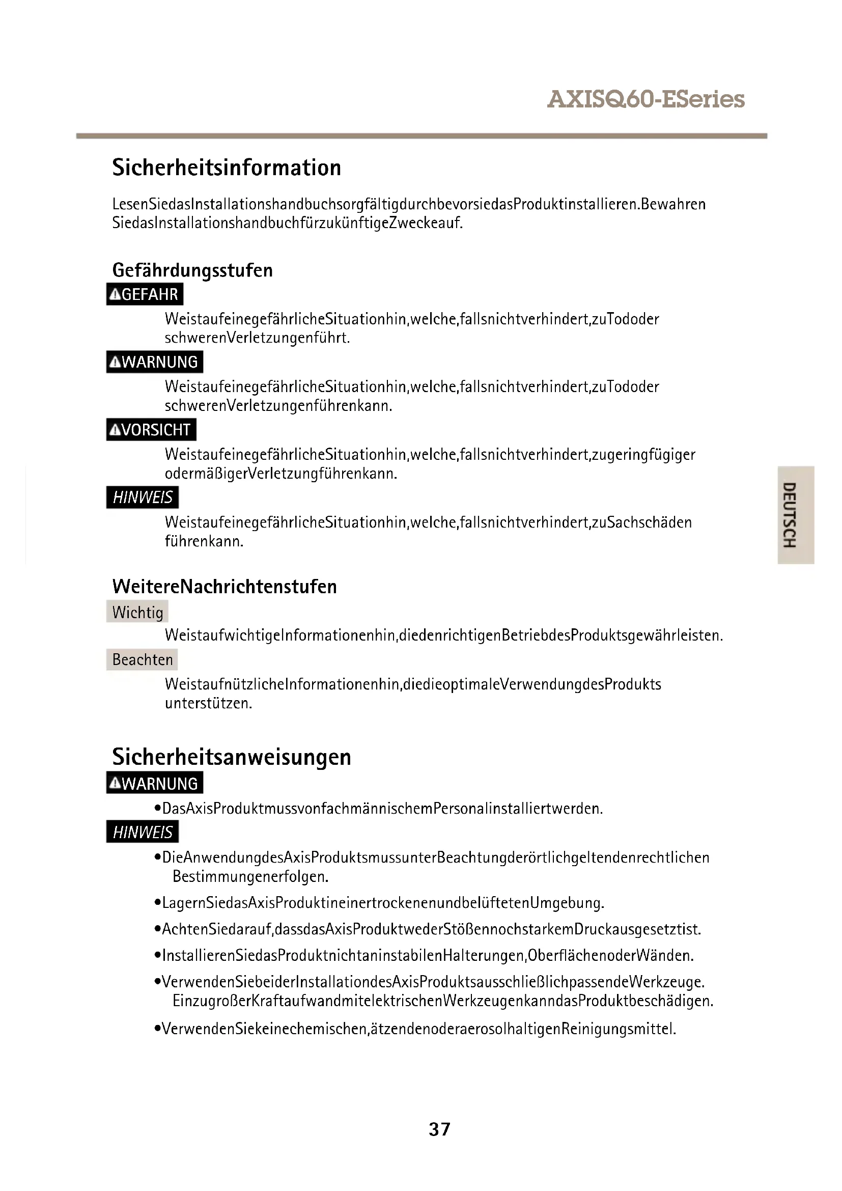 VIS VIS VIS Utilisezunesourced'alimentationlimitée(LPS)conformeauxexigencesdeTrèsbasse tensiondesécurité(TBTS)dontlapuissancedesortienominaleestlimitéeà≤100Woudont lecourantdesortienominalestlimitéà≤5A.Axisrecommanded'utiliserl'injecteurfourni. ProduitInjecteurdepuissanceHigh PoEAxis1port(inclus) InjecteurdepuissanceHigh PoE+Axis1port AXISQ6052-E AXISQ6054-E AXISQ6055-E 100à240VCA,max.74WIEEE802.3at,Type2Classe4 100–240VCA,max37W 36AXISQ60-ESeries Sicherheitsinformation LesenSiedasInstallationshandbuchsorgfältigdurchbevorsiedasProduktinstallieren.Bewahren SiedasInstallationshandbuchfürzukünftigeZweckeauf. Gefährdungsstufen GEFAHR WeistaufeinegefährlicheSituationhin,welche,fallsnichtverhindert,zuTododer schwerenVerletzungenführt. WARNUNG WeistaufeinegefährlicheSituationhin,welche,fallsnichtverhindert,zuTododer schwerenVerletzungenführenkann. VORSICHT WeistaufeinegefährlicheSituationhin,welche,fallsnichtverhindert,zugeringfügiger odermäßigerVerletzungführenkann. HINWEIS HINWEIS HINWEIS WeistaufeinegefährlicheSituationhin,welche,fallsnichtverhindert,zuSachschäden führenkann. WeitereNachrichtenstufen Wichtig WeistaufwichtigeInformationenhin,diedenrichtigenBetriebdesProduktsgewährleisten. Beachten WeistaufnützlicheInformationenhin,diedieoptimaleVerwendungdesProdukts unterstützen. Sicherheitsanweisungen WARNUNG