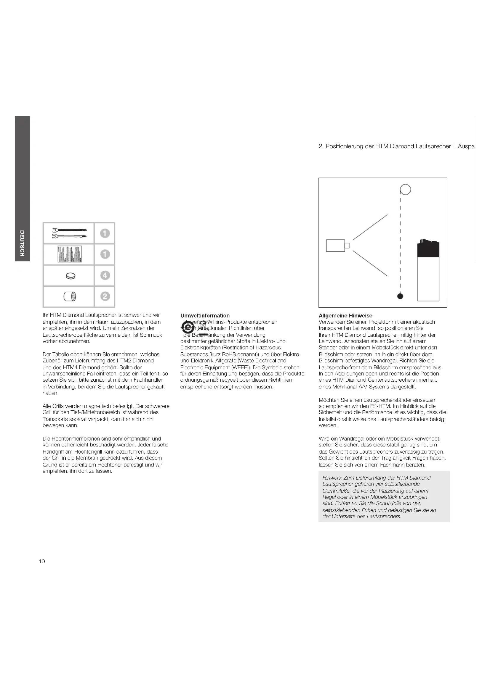 Ihr HTM Diamond Lautsprecher ist schwer und wir empfehlen, ihn in dem Raum auszupacken, in dem er später eingesetzt wird. Um ein Zerkratzen der Lautsprecheroberäche zu vermeiden, ist Schmuck vorher abzunehmen. Der Tabelle oben können Sie entnehmen, welches Zubehör zum Lieferumfang des HTM2 Diamond und des HTM4 Diamond gehört. Sollte der unwahrscheinliche Fall eintreten, dass ein Teil fehlt, so setzen Sie sich bitte zunächst mit dem Fachhändler in Verbindung, bei dem Sie die Lautsprecher gekauft haben. Alle Grills werden magnetisch befestigt. Der schwerere Grill für den Tief-/Mitteltonbereich ist während des Transports separat verpackt, damit er sich nicht bewegen kann. Die Hochtonmembranen sind sehr empndlich und können daher leicht beschädigt werden. Jeder falsche Handgriff am Hochtongrill kann dazu führen, dass der Grill in die Membran gedrückt wird. Aus diesem Grund ist er bereits am Hochtöner befestigt und wir empfehlen, ihn dort zu lassen. Umweltinformation Bowers & Wilkins-Produkte entsprechen den internationalen Richtlinien über die Beschränkung der Verwendung bestimmter gefährlicher Stoffe in Elektro- und Elektronikgeräten (Restriction of Hazardous Substances (kurz RoHS genannt)) und über Elektro- und Elektronik-Altgeräte (Waste Electrical and Electronic Equipment (WEEE)). Die Symbole stehen für deren Einhaltung und besagen, dass die Produkte ordnungsgemäß recycelt oder diesen Richtlinien entsprechend entsorgt werden müssen. Allgemeine Hinweise Verwenden Sie einen Projektor mit einer akustisch transparenten Leinwand, so positionieren Sie Ihren HTM Diamond Lautsprecher mittig hinter der Leinwand. Ansonsten stellen Sie ihn auf einem Ständer oder in einem Möbelstück direkt unter den Bildschirm oder setzen ihn in ein direkt über dem Bildschirm befestigtes Wandregal. Richten Sie die Lautsprecherfront dem Bildschirm entsprechend aus. In den Abbildungen oben und rechts ist die Position eines HTM Diamond Centerlautsprechers innerhalb eines Mehrkanal-A/V-Systems dargestellt. Möchten Sie einen Lautsprecherständer einsetzen, so empfehlen wir den FS-HTM. Im Hinblick auf die Sicherheit und die Performance ist es wichtig, dass die Installationshinweise des Lautsprecherständers befolgt werden. Wird ein Wandregal oder ein Möbelstück verwendet, stellen Sie sicher, dass diese stabil genug sind, um das Gewicht des Lautsprechers zuverlässig zu tragen. Sollten Sie hinsichtlich der Tragfähigkeit Fragen haben, lassen Sie sich von einem Fachmann beraten. Hinweis: Zum Lieferumfang der HTM Diamond Lautsprecher gehören vier selbstklebende Gummifüße, die vor der Platzierung auf einem Regal oder in einem Möbelstück anzubringen sind. Entfernen Sie die Schutzfolie von den selbstklebenden Füßen und befestigen Sie sie an der Unterseite des Lautsprechers.11 DEUTSCH