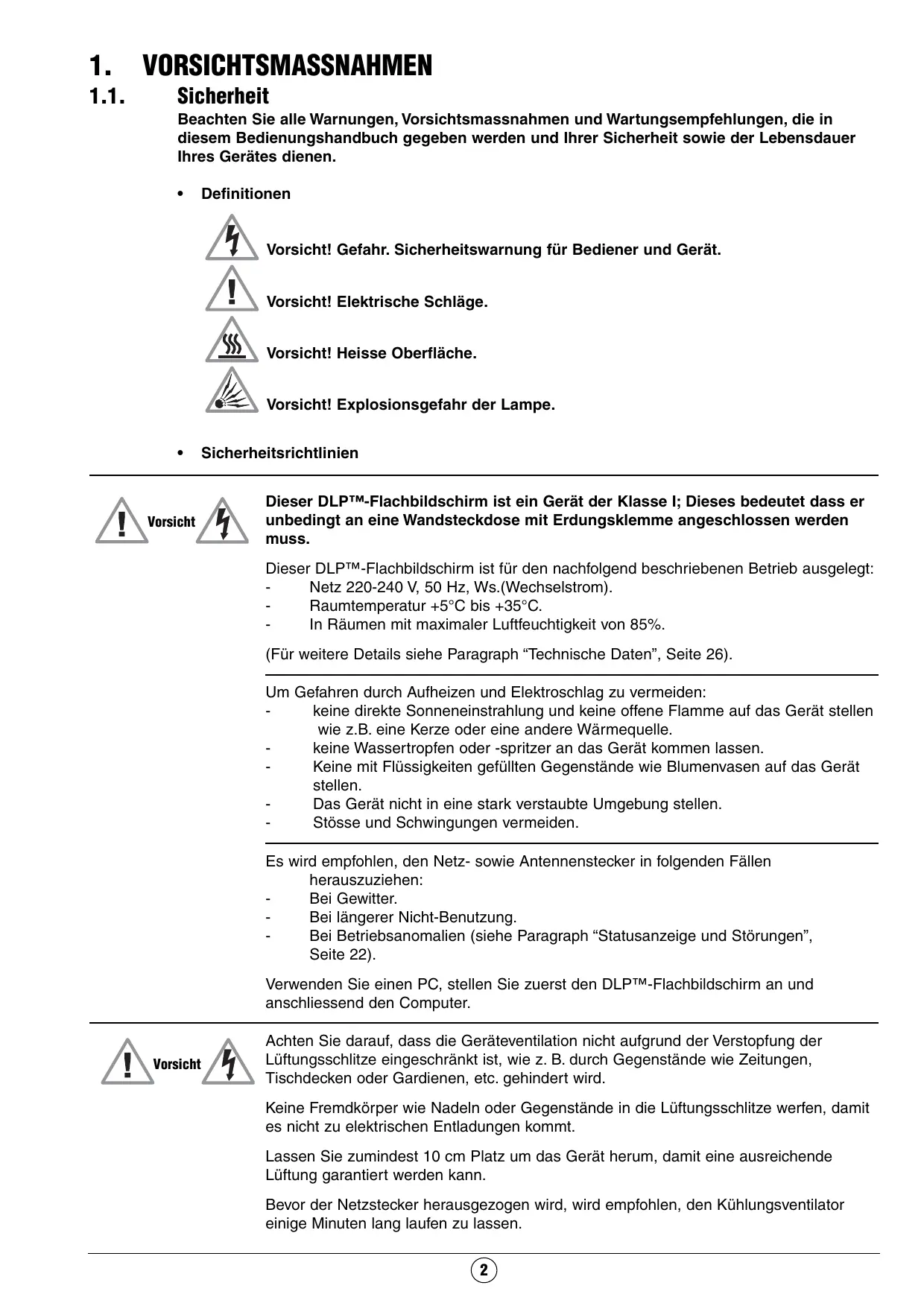 Afin d'éviter des décharges électriques, ne pas introduire, par les grilles d'aérations, de corps étrangers tels que par exemple : aiguilles, pièces de monnaies ou autres. Laisser un espace libre d'au moins 10 cm autour de l'appareil pour une aération suffisante. Avant de débrancher le cordon secteur, il est recommandé de laisser les ventilateurs de refroidissement fonctionner quelques minutes. 2