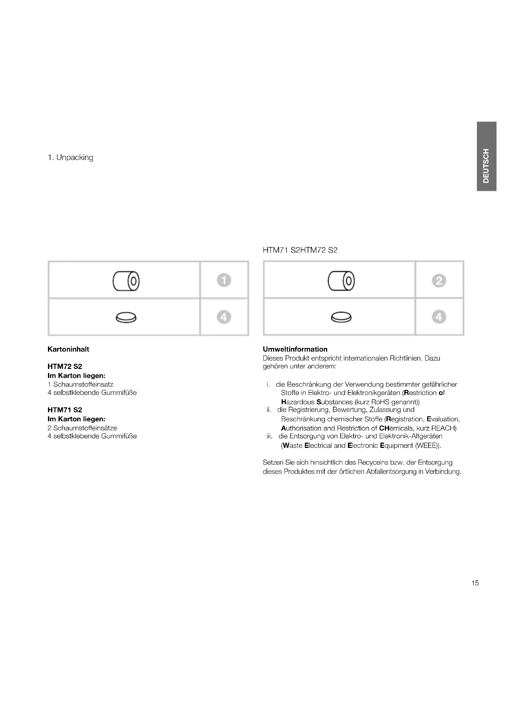 Kartoninhalt HTM72S2 Im Karton liegen: 1 Schaumstoffeinsatz 4 selbstklebende Gummifüße HTM71S2 Im Karton liegen: 2 Schaumstoffeinsätze 4 selbstklebende Gummifüße Umweltinformation Dieses Produkt entspricht internationalen Richtlinien. Dazu gehören unter anderem: