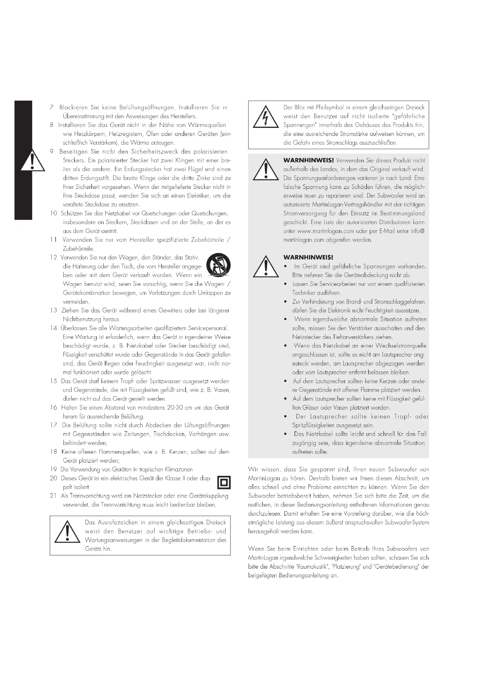 - À l’aide de l’appli, ajustez les réglages suivants : o Volume (niveau) : réglez le niveau à -10dB et augmentez-le jusqu’à ce que le son ait des graves profondes et étendues. o Phase : commencez avec 90° (avec polarité inversée allumée). o Niveau 20–30 Hz : commencez avec 0dB. o Filtre de passe basse : réglez plus bas que l’extrémité inférieure de la plage de réponse de fréquence de vos enceintes principales. Si vous n’êtes pas certain de la réponse de basse fréquence de votre enceinte principale, commencez avec un réglage de 35 Hz. Etape 6: Ecoutez et Profitez. Sicherheitshinweise und Installation (Deutsch/German) Wichtige Sicherheitsanweisungen 1 Lesen Sie diese Anweisungen. 2 Bewahren Sie diese Anweisungen auf. 3 Beachten Sie alle Warnungen. 4 Befolgen Sie alle Anweisungen. 5 Verwenden Sie dieses Gerät nicht in der Nähe von Wasser. 6 Reinigen Sie nur mit einem trockenen Tuch.7 Blockieren Sie keine Belüftungsöffnungen. Installieren Sie in Übereinstimmung mit den Anweisungen des Herstellers. 8 Installieren Sie das Gerät nicht in der Nähe von Wärmequellen wie Heizkörpern, Heizregistern, Öfen oder anderen Geräten (ein- schließlich Verstärkern), die Wärme erzeugen. 9 Beseitigen Sie nicht den Sicherheitszweck des polarisierten Steckers. Ein polarisierter Stecker hat zwei Klingen mit einer bre- iter als die andere. Ein Erdungsstecker hat zwei Flügel und einen dritten Erdungsstift. Die breite Klinge oder die dritte Zinke sind zu Ihrer Sicherheit vorgesehen. Wenn der mitgelieferte Stecker nicht in Ihre Steckdose passt, wenden Sie sich an einen Elektriker, um die veraltete Steckdose zu ersetzen. 10 Schützen Sie das Netzkabel vor Quetschungen oder Quetschungen, insbesondere an Steckern, Steckdosen und an der Stelle, an der es aus dem Gerät austritt. 11 Verwenden Sie nur vom Hersteller spezifizierte Zubehörteile / Zubehörteile. 12 Verwenden Sie nur den Wagen, den Ständer, das Stativ, die Halterung oder den Tisch, die vom Hersteller angege- ben oder mit dem Gerät verkauft wurden. Wenn ein Wagen benutzt wird, seien Sie vorsichtig, wenn Sie die Wagen- / Gerätekombination bewegen, um Verletzungen durch Umkippen zu vermeiden. 13 Ziehen Sie das Gerät während eines Gewitters oder bei längerer Nichtbenutzung heraus. 14 Überlassen Sie alle Wartungsarbeiten qualifiziertem Servicepersonal. Eine Wartung ist erforderlich, wenn das Gerät in irgendeiner Weise beschädigt wurde, z. B. Netzkabel oder Stecker beschädigt sind, Flüssigkeit verschüttet wurde oder Gegenstände in das Gerät gefallen sind, das Gerät Regen oder Feuchtigkeit ausgesetzt war, nicht nor- mal funktioniert oder wurde gelöscht. 15 Das Gerät darf keinem Tropf- oder Spritzwasser ausgesetzt werden und Gegenstände, die mit Flüssigkeiten gefüllt sind, wie z. B. Vasen, dürfen nicht auf das Gerät gestellt werden. 16 Halten Sie einen Abstand von mindestens 20-30 cm um das Gerät herum für ausreichende Belüftung. 17 Die Belüftung sollte nicht durch Abdecken der Lüftungsöffnungen mit Gegenständen wie Zeitungen, Tischdecken, Vorhängen usw. behindert werden; 18 Keine offenen Flammenquellen, wie z. B. Kerzen, sollten auf dem Gerät platziert werden; 19 Die Verwendung von Geräten in tropischen Klimazonen 20 Dieses Gerät ist ein elektrisches Gerät der Klasse II oder dop- pelt isoliert 21 Als Trennvorrichtung wird ein Netzstecker oder eine Gerätekupplung verwendet, die Trennvorrichtung muss leicht bedienbar bleiben. Das Ausrufezeichen in einem gleichseitigen Dreieck weist den Benutzer auf wichtige Betriebs- und Wartungsanweisungen in der Begleitdokumentation des Geräts hin. Der Blitz mit Pfeilsymbol in einem gleichseitigen Dreieck weist den Benutzer auf nicht isolierte "gefährliche Spannungen" innerhalb des Gehäuses des Produkts hin, die eine ausreichende Stromstärke aufweisen können, um die Gefahr eines Stromschlags auszuschließen. WARNHINWEIS! Verwenden Sie dieses Produkt nicht außerhalb des Landes, in dem das Original verkauft wird. Die Spannungsanforderungen variieren je nach Land. Eine falsche Spannung kann zu Schäden führen, die möglich- erweise teuer zu reparieren sind. Der Subwoofer wird an autorisierte MartinLogan-Vertragshändler mit der richtigen Stromversorgung für den Einsatz im Bestimmungsland geschickt. Eine Liste der autorisierten Distributoren kann unter www.martinlogan.com oder per E-Mail unter info@ martinlogan.com abgerufen werden. WARNHINWEIS!