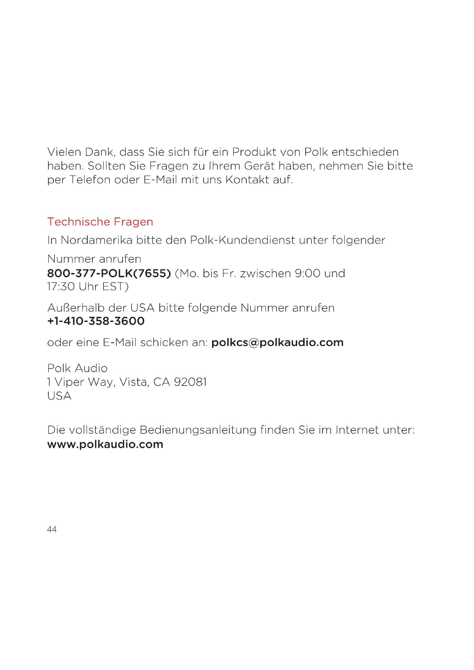 u ordenador y seleccione MagniFi Mini. La LED será azul fijo cuando el Bluetooth esté conectado. Nota: para tomar el control cuando otro dispositivo esté conectado, pulse el botón Bluetooth. Cómo oir su TV de nuevo: Cuando haya acabado con el Bluetooth, apriete el botón de fuente en la barra de sonido o el mando a distancia (TV ARC, ÓPT, AUX).44 Vielen Dank, dass Sie sich für ein Produkt von Polk entschieden haben. Sollten Sie Fragen zu Ihrem Gerät haben, nehmen Sie bitte per Telefon oder E-Mail mit uns Kontakt auf. Technische Fragen In Nordamerika bitte den Polk-Kundendienst unter folgender Nummer anrufen 800-377-POLK(7655) (Mo. bis Fr. zwischen 9:00 und 17:30UhrEST) Außerhalb der USA bitte folgende Nummer anrufen +1-410-358-3600 oder eine E-Mail schicken an: polkcs@polkaudio.com Polk Audio 1 Viper Way, Vista, CA 92081 USA Die vollständige Bedienungsanleitung finden Sie im Internet unter: www.polkaudio.com45 LIEFERUMFANG Soundbar Fernbedienung Batterie Drahtloser Subwoofer Soundbar elektrische anschlusskabel 6’ (1,8m) Optisches Verbindungskabel 6,5' (2m) HDMI-Kabel 6' (1,8m) AUX-Kabel Literatur Subwoofer elektrische anschlusskabel Soundbar Stromversorgung AAA AAA de46 So schließen Sie Ihr MagniFiMini an Ihren Fernseher an Befindet sich an Ihrem Fernsehgerät ein HDMI-Eingang mit der BeschriftungARC? Verwenden Sie das mitgelieferte HDMI-Kabel, um die Soundbar an Ihren Fernseher anzuschließen. Verwenden Sie das mitgelieferte optischeKabel, um die Soundbar an Ihren Fernseher anzuschließen. JA NEIN TV ARC 5V 500mA TV ARC 5V 500mA