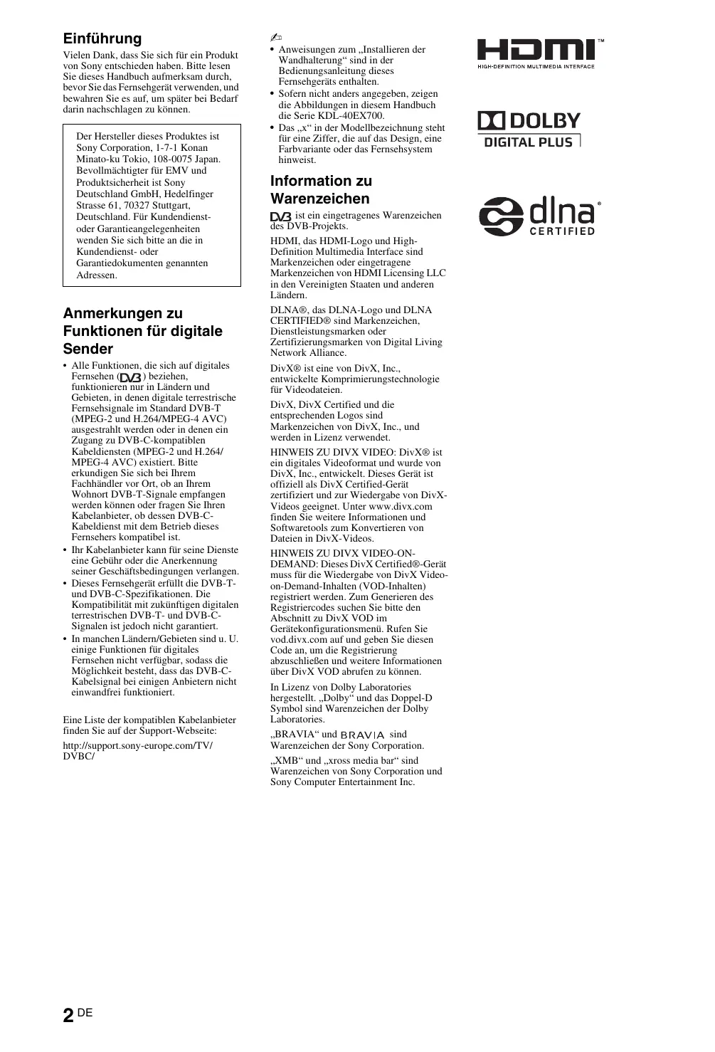 - Das „x“ in der Modellbezeichnung steht für eine Ziffer, die auf das Design, eine Farbvariante oder das Fernsehsystem hinweist. Information zu Warenzeichen ist ein eingetragenes Warenzeichen des DVB-Projekts. HDMI, das HDMI-Logo und HighDefinition Multimedia Interface sind Markenzeichen oder eingetragene Markenzeichen von HDMI Licensing LLC in den Vereinigten Staaten und anderen Ländern. DLNA®, das DLNA-Logo und DLNA CERTIFIED® sind Markenzeichen, Dienstleistungsmarken oder Zertifizierungsmarken von Digital Living Network Alliance. DivX® ist eine von DivX, Inc., entwickelte Komprimierungstechnologie für Videodateien. DivX, DivX Certified und die entsprechenden Logos sind Markenzeichen von DivX, Inc., und werden in Lizenz verwendet. HINWEIS ZU DIVX VIDEO: DivX® ist ein digitales Videoformat und wurde von DivX, Inc., entwickelt. Dieses Gerät ist offiziell als DivX Certified-Gerät zertifiziert und zur Wiedergabe von DivXVideos geeignet. Unter www.divx.com finden Sie weitere Informationen und Softwaretools zum Konvertieren von Dateien in DivX-Videos. HINWEIS ZU DIVX VIDEO-ONDEMAND: Dieses DivX Certified®-Gerät muss für die Wiedergabe von DivX Videoon-Demand-Inhalten (VOD-Inhalten) registriert werden. Zum Generieren des Registriercodes suchen Sie bitte den Abschnitt zu DivX VOD im Gerätekonfigurationsmenü. Rufen Sie vod.divx.com auf und geben Sie diesen Code an, um die Registrierung abzuschließen und weitere Informationen über DivX VOD abrufen zu können. In Lizenz von Dolby Laboratories hergestellt. „Dolby“ und das Doppel-D Symbol sind Warenzeichen der Dolby Laboratories. „BRAVIA“ und sind Warenzeichen der Sony Corporation. „XMB“ und „xross media bar“ sind Warenzeichen von Sony Corporation und Sony Computer Entertainment Inc. Inhaltsverzeichnis Überprüfen des Zubehörs ..............................................................................................................3 Einsetzen von Batterien in die Fernbedienung ..............................................................................3 Aufstellung und Grundeinstellungen Befestigen des Tischständers (außer beim Modell KDL-60EX70x)...............................................4 Anschließen einer Antenne/einer Set-Top-Box/eines Recorders (z. B. DVD-Recorder) ...............4 Anbringen einer Kippsicherung für das Fernsehgerät ...................................................................5 Bündeln der Kabel .........................................................................................................................5 Durchführen der anfänglichen Grundeinstellungen .......................................................................6 Abnehmen des Tischständers vom Fernsehgerät .........................................................................6 Fernsehen So sehen Sie fern ..........................................................................................................................7 So verwenden Sie die Funktionen des Fernsehgeräts ..................................................................7 So verwenden Sie i-Manual ...........................................................................................................8 Zusatzinformationen Störungsbehebung.........................................................................................................................9 Technische Daten ........................................................................................................................10 Montieren des Zubehörs (Wandhalterung) ..................................................................................13 Tabelle der Fernsehgeräte-Installationsabmessungen................................................................14 Zeichnung/Tabelle der Schrauben- und Hakenpositionen...........................................................15 Sicherheitsinformationen .............................................................................................................16 Sicherheitsmaßnahmen ...............................................................................................................17