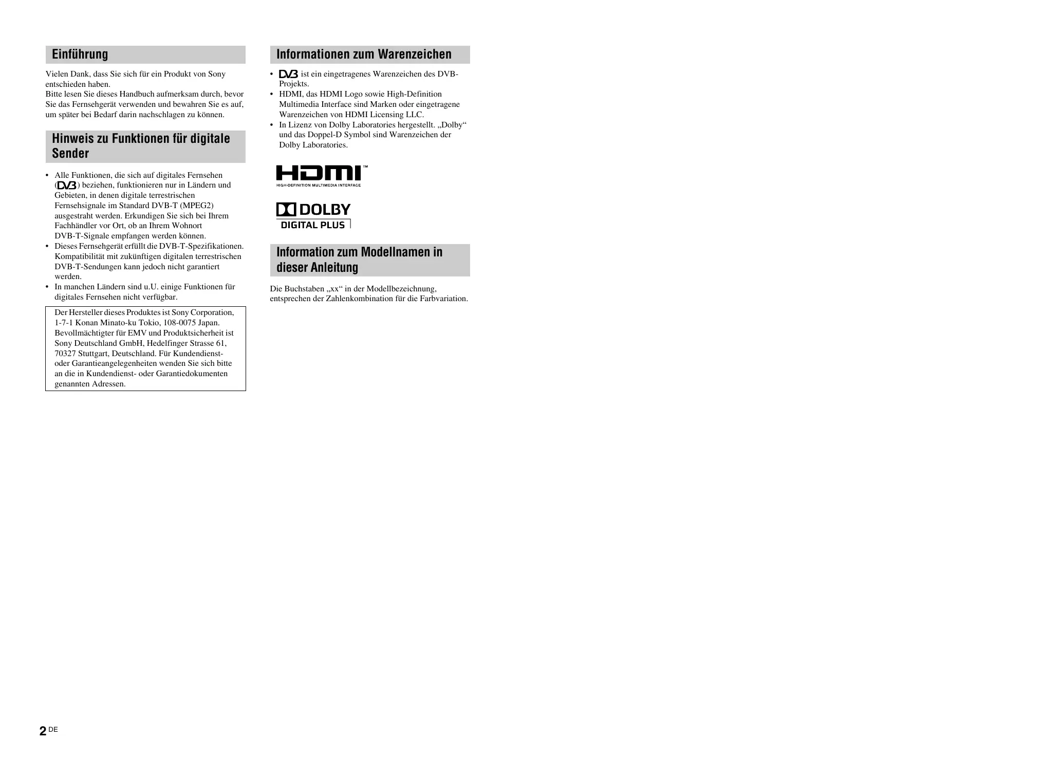 Hinweis zu Funktionen für digitale Sender • Alle Funktionen, die sich auf digitales Fernsehen ( ) beziehen, funktionieren nur in Ländern und Gebieten, in denen digitale terrestrischen Fernsehsignale im Standard DVB-T (MPEG2) ausgestraht werden. Erkundigen Sie sich bei Ihrem Fachhändler vor Ort, ob an Ihrem Wohnort DVB-T-Signale empfangen werden können. • Dieses Fernsehgerät erfüllt die DVB-T-Spezifikationen. Kompatibilität mit zukünftigen digitalen terrestrischen DVB-T-Sendungen kann jedoch nicht garantiert werden. • In manchen Ländern sind u.U. einige Funktionen für digitales Fernsehen nicht verfügbar. Der Hersteller dieses Produktes ist Sony Corporation, 1-7-1 Konan Minato-ku Tokio, 108-0075 Japan. Bevollmächtigter für EMV und Produktsicherheit ist Sony Deutschland GmbH, Hedelfinger Strasse 61, 70327 Stuttgart, Deutschland. Für Kundendienstoder Garantieangelegenheiten wenden Sie sich bitte an die in Kundendienst- oder Garantiedokumenten genannten Adressen.