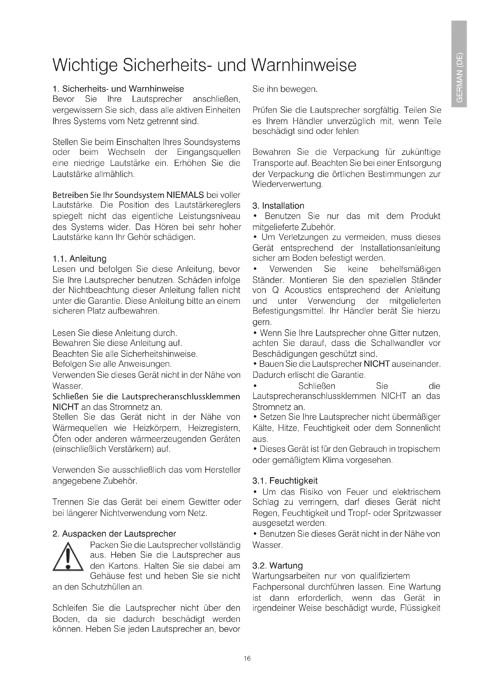 - Benutzen Sie dieses Gerät nicht in der Nähe von Wasser. 3.2. Wartung Wartungsarbeiten nur von qualiziertem Fachpersonal durchführen lassen. Eine Wartung ist dann erforderlich, wenn das Gerät in irgendeiner Weise beschädigt wurde, Flüssigkeit Wichtige Sicherheits- und Warnhinweise16 17 oder Gegenstände in das Gerät gelangt sind, das Gerät Regen oder Feuchtigkeit ausgesetzt war, nicht normal funktioniert oder heruntergefallen ist 4.0. Symbole, die auf diesem Produkt verwendet werden. Warnzeichen Das „Ausrufezeichen“ weist auf Funktionen hin, für die Sie die Gebrauchsanleitung aufmerksam lesen sollten, um Bedienungs- und Wartungsfehler zu vermeiden. Vorsicht: Um einen Stromschlag zu vermeiden, stecken Sie den breiten Kontakt des Stecker in den breiten Schlitz der Steckdose, stecken Sie den Stecker vollständig ein. Symbol für Elektro- und Elektronik-Altgeräte Dieses Symbol zeigt an, dass das Gerät nicht mit dem Haushaltsmüll entsorgt werden darf, sondern an eine entsprechende Sammelstelle zur Wiederverwertung von Elektro- und Elektronik- Altgeräten abgegeben werden muss. Bitte stellen Sie sicher, dass Sie mit Ihren örtlichen Bestimmungen zur Entsorgung von Elektro- und Elektronik- Geräten vertraut sind. GERMAN (DE)18 19 Einführung Vielen Dank, dass Sie sich für Q Acoustics entschieden haben. Dieses Handbuch soll Sie durch die Einrichtung und Installation des Geräts führen und hilft Ihnen dabei, die optimale Leistung Ihrer Lautsprecher zu erreichen. Bitte lesen Sie vor der Einrichtung und Verwendung diese Anleitung sowie die wichtigen Sicherheits- und Warnhinweise aufmerksam durch, um einen sicheren und zufriedenstellenden Betrieb dieses Produkts zu gewährleisten. Q Acoustics 3000i ist eine Lautsprecherserie, die speziell für die hohen Anforderungen passionierter Zweikanalton-Musikliebhaber und anspruchsvoller Filmenthusiasten entwickelt wurde. Die Serie umfasst die folgenden Modelle: 3010i: Kompakte Regallautsprecher mit einem 100-mm-Tieftöner (4,0 Zoll) 3020i: Regallautsprecher mit einem 125-mm-Tieftöner (5,0 Zoll) 3030i: Regallautsprecher mit einem 165-mm-Tieftöner (6,5 Zoll) 3050i: Standlautsprecher mit zwei 165-mm-Tieftönern (6,5 Zoll) 3060S: Aktiv-Subwoofer mit 150 Watt und einem 200-mm-Schallwandler (8,0 Zoll) 3090Ci: Centerlautsprecher mit zwei 100-mm-Tieftönern (4,0 Zoll) Der Lieferumfang umfasst: den/die Lautsprecher und dieses Produkthandbuch. Darüber hinaus umfasst der Lieferumfang für die folgenden Modelle: 3050i: für jeden der Lautsprecher Rückstabilisator, Stifte und Schutzkappen für die Stifte, Inbus- Schlüssel zum Einstellen der Stifte. 3060S: Netzkabel, Stifte und Schutzkappen für die Stifte Kontrollieren Sie das Produkt sorgfältig. Teilen Sie es Ihrem Händler unverzüglich mit, wenn Teile beschädigt sind oder fehlen. Wir wünschen Ihnen viel Freude mit Q Acoustics. GERMAN (DE)18 19 Vorbereitung 3050i – Anbringen des rückwärtigen Stabilisators Schieben Sie die Stifte mit den Sicherungsmuttern bis zur Hälfte in den Sockel und stellen Sie den Lautsprecher wieder aufrecht auf. (Falls Sie einen Holz- oder Steinfußboden haben, stecken Sie vor dem Aufrichten des Lautsprechers die Schutzkappen auf die Stifte.) Schieben Sie bei aufrecht stehendem Lautsprecher den Inbus-Schlüssel von oben in die hinteren Stifte und stellen Sie sie so ein, dass der Lautsprecher eben und stabil steht. Schaumstoffstöpsel Die Lautsprecher der Serie 3000i haben einen Reexkanal auf der Rückseite und funktionieren daher am besten, wenn beim Aufstellen vor einer Wand ein Abstand von ca. 200 mm zwischen der Lautsprecherrückseite und der Wand eingehalten wird. Wenn Sie Ihre Lautsprecher näher an einer Wand/Ecke aufstellen, sollten sie die Schaumstoffstöpsel in die Reexkanäle stecken, um eine übermäßige Bassstärke zu verhindern. Stellen Sie sicher, dass die Stöpsel die Kanäle dicht verschließen, ohne sie jedoch zu weit hineinzuschieben. Sie werden feststellen, dass der Basspegel reduziert wurde, die Tonschärfe und Basserwiedergabe jedoch besser sind. Experimentieren Sie mit kleinen Positionsänderungen, um die Lautsprecheraufstellung und das Klangerlebnis zu optimieren. Die Stifte sind spitz. Gehen Sie mit Vorsicht vor. Stellen Sie einen Lautsprecher mit Stiften niemals dort auf, wo er Beschädigungen verursachen kann. Heben Sie die Lautsprecher beim Transport immer an, schleifen Sie sie niemals über den Boden. Heben Sie die Lautsprecher aus den Kartons. Halten Sie sie dabei am Gehäuse fest, berühren Sie nicht die Schallwandler und heben Sie die Lautsprecher nicht an den Schutzhüllen an. Die Modelle 3050i und 3060S sind schwer. Holen Sie sich erforderlichenfalls Hilfe. Befestigen Sie die Füße mit den mitgelieferten Schrauben, wie abgebildet. GERMAN (DE)20 21 Alle Lautsprecher mit Ausnahme des 3060S können ohne nachteilige Auswirkungen in der Nähe von TV-Bildschirmen betrieben werden. Der 3060S sollte nur in einem Abstand von mindestens 500 mm von TV-Bildschirmen oder anderen magnetempndlichen Geräten betrieben werden. Es kommt zu keinen Auswirkungen auf Plasma- und LCD-Bildschirme. Aufstellung 3010i, 3020i und 3030i Die Modelle 3010i, 3020i und 3030i sollten am besten auf Q-Acoustics-Bodenständern, 3010i und 3020i an der Wand montiert werden. Die einfache Regel bei der Verwendung von Bodenständern ist, dass die Hochtönereinheit sich auf Ohrhöhe eines sitzenden Zuhörers benden sollte. An der Wand angebrachte Lautsprecher können etwas höher montiert werden. Die Lautsprecher sollten dabei nach unten neigen. Auf Ständern montierte Lautsprecher sollten in der gleichen Weise wie Bodenlautsprecher behandelt werden, können jedoch etwas näher an die Wand gestellt werden. Die Aufstellung in einem Regal ist ebenfalls möglich. Bei Ihrem Fachhändler erhalten Sie auf Wunsch speziell zum Anbringen der Modelle Q Acoustics 3010i, 3020i und 3090Ci entwickelte Wandhalter. Bodenständer für die Modelle 3010i, 3020i und 3030i sind ebenfalls erh