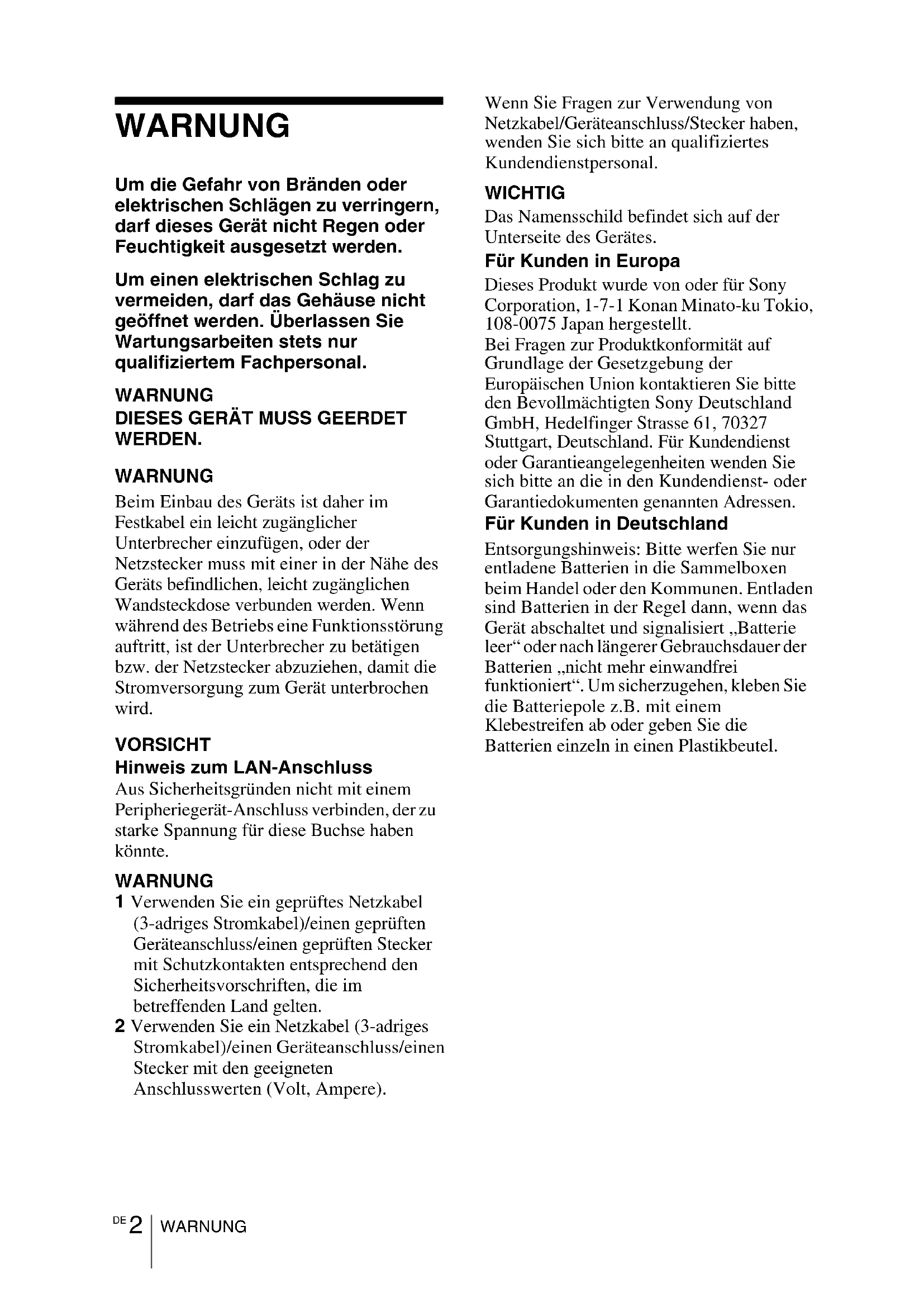 WERDEN. WARNUNG Beim Einbau des Geräts ist daher im Festkabel ein leicht zugänglicher Unterbrecher einzufügen, oder der Netzstecker muss mit einer in der Nähe des Geräts befindlichen, leicht zugänglichen Wandsteckdose verbunden werden. Wenn während des Betriebs eine Funktionsstörung auftritt, ist der Unterbrecher zu betätigen bzw. der Netzstecker abzuziehen, damit die Stromversorgung zum Gerät unterbrochen wird. VORSICHT Hinweis zum LAN-Anschluss Aus Sicherheitsgründen nicht mit einem Peripheriegerät-Anschluss verbinden, der zu starke Spannung für diese Buchse haben könnte. WARNUNG 1 Verwenden Sie ein geprüftes Netzkabel (3-adriges Stromkabel)/einen geprüften Geräteanschluss/einen geprüften Stecker mit Schutzkontakten entsprechend den Sicherheitsvorschriften, die im betreffenden Land gelten. 2 Verwenden Sie ein Netzkabel (3-adriges Stromkabel)/einen Geräteanschluss/einen Stecker mit den geeigneten Anschlusswerten (Volt, Ampere). Wenn Sie Fragen zur Verwendung von Netzkabel/Geräteanschluss/Stecker haben, wenden Sie sich bitte an qualifiziertes Kundendienstpersonal. WICHTIG Das Namensschild befindet sich auf der Unterseite des Gerätes. Für Kunden in Europa Dieses Produkt wurde von oder für Sony Corporation, 1-7-1 Konan Minato-ku Tokio, 108-0075 Japan hergestellt. Bei Fragen zur Produktkonformität auf Grundlage der Gesetzgebung der Europäischen Union kontaktieren Sie bitte den Bevollmächtigten Sony Deutschland GmbH, Hedelfinger Strasse 61, 70327 Stuttgart, Deutschland. Für Kundendienst oder Garantieangelegenheiten wenden Sie sich bitte an die in den Kundendienst- oder Garantiedokumenten genannten Adressen. Für Kunden in Deutschland Entsorgungshinweis: Bitte werfen Sie nur entladene Batterien in die Sammelboxen beim Handel oder den Kommunen. Entladen sind Batterien in der Regel dann, wenn das Gerät abschaltet und signalisiert „Batterie leer“ oder nach längerer Gebrauchsdauer der Batterien „nicht mehr einwandfrei funktioniert“. Um sicherzugehen, kleben Sie die Batteriepole z.B. mit einem Klebestreifen ab oder geben Sie die Batterien einzeln in einen Plastikbeutel.3