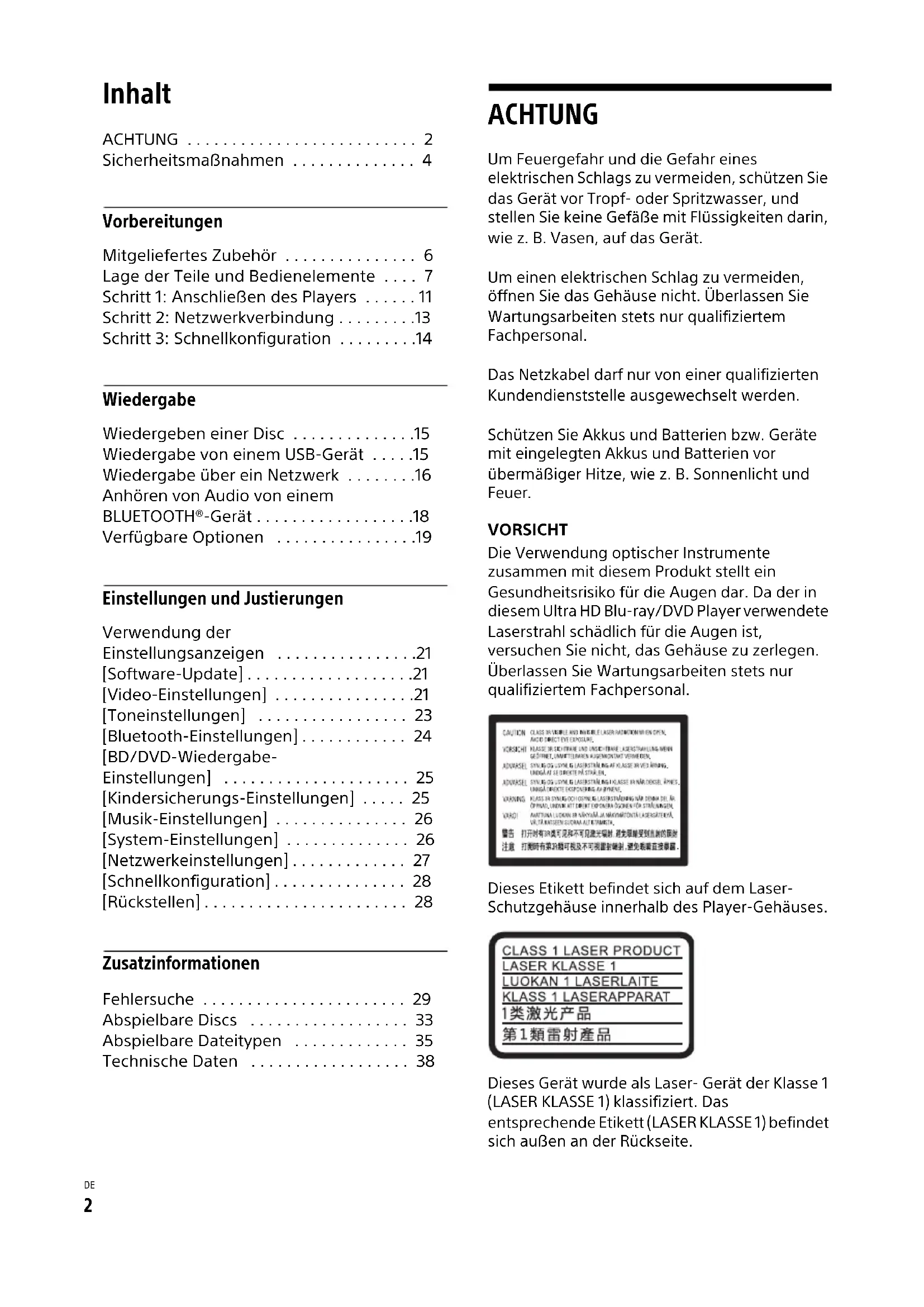 - Technische Daten ACHTUNG Um Feuergefahr und die Gefahr eines elektrischen Schlags zu vermeiden, schützen Sie das Gerät vor Tropf- oder Spritzwasser, und stellen Sie keine Gefäße mit Flüssigkeiten darin, wie z. B. Vasen, auf das Gerät. Um einen elektrischen Schlag zu vermeiden, öffnen Sie das Gehäuse nicht. Überlassen Sie Wartungsarbeiten stets nur qualifiziertem Fachpersonal. Das Netzkabel darf nur von einer qualifizierten Kundendienststelle ausgewechselt werden. Schützen Sie Akkus und Batterien bzw. Geräte mit eingelegten Akkus und Batterien vor übermäßiger Hitze, wie z. B. Sonnenlicht und Feuer. VORSICHT Die Verwendung optischer Instrumente zusammen mit diesem Produkt stellt ein Gesundheitsrisiko für die Augen dar. Da der in diesem Ultra HD Blu-ray/DVD Player verwendete Laserstrahl schädlich für die Augen ist, versuchen Sie nicht, das Gehäuse zu zerlegen. Überlassen Sie Wartungsarbeiten stets nur qualifiziertem Fachpersonal. Dieses Etikett befindet sich auf dem Laser- Schutzgehäuse innerhalb des Player-Gehäuses. Dieses Gerät wurde als Laser- Gerät der Klasse 1 (LASER KLASSE 1) klassifiziert. Das entsprechende Etikett (LASER KLASSE 1) befindet sich außen an der Rückseite.3 UBP-X1000ES 4-697-596-11(2) master page=right p. 38
