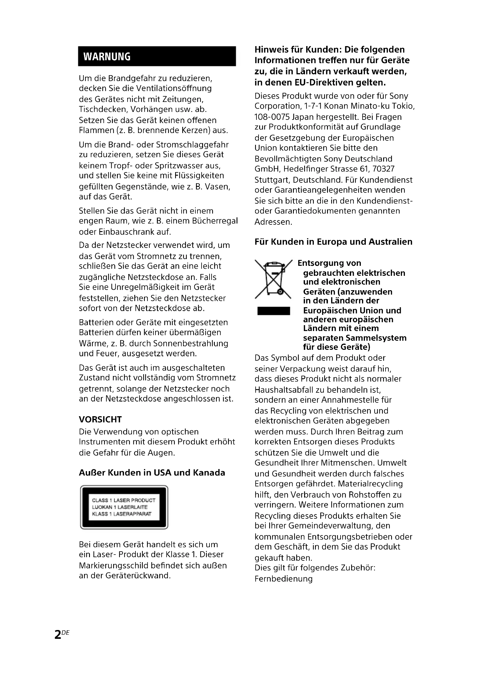 MHC-EC919iP/EC719iP.4-467-786-42(1) WARNUNG Um die Brandgefahr zu reduzieren, decken Sie die Ventilationsönung des Gerätes nicht mit Zeitungen, Tischdecken, Vorhängen usw. ab. Setzen Sie das Gerät keinen oenen Flammen (z. B. brennende Kerzen) aus. Um die Brand- oder Stromschlaggefahr zu reduzieren, setzen Sie dieses Gerät keinem Tropf- oder Spritzwasser aus, und stellen Sie keine mit Flüssigkeiten gefüllten Gegenstände, wie z. B. Vasen, auf das Gerät. Stellen Sie das Gerät nicht in einem engen Raum, wie z. B. einem Bücherregal oder Einbauschrank auf. Da der Netzstecker verwendet wird, um das Gerät vom Stromnetz zu trennen, schließen Sie das Gerät an eine leicht zugängliche Netzsteckdose an. Falls Sie eine Unregelmäßigkeit im Gerät feststellen, ziehen Sie den Netzstecker sofort von der Netzsteckdose ab. Batterien oder Geräte mit eingesetzten Batterien dürfen keiner übermäßigen Wärme, z. B. durch Sonnenbestrahlung und Feuer, ausgesetzt werden. Das Gerät ist auch im ausgeschalteten Zustand nicht vollständig vom Stromnetz getrennt, solange der Netzstecker noch an der Netzsteckdose angeschlossen ist. VORSICHT Die Verwendung von optischen Instrumenten mit diesem Produkt erhöht die Gefahr für die Augen. Außer Kunden in USA und Kanada Bei diesem Gerät handelt es sich um ein Laser- Produkt der Klasse 1. Dieser Markierungsschild bendet sich außen an der Geräterückwand. Hinweis für Kunden: Die folgenden Informationen treen nur für Geräte zu, die in Ländern verkauft werden, in denen EU-Direktiven gelten. Dieses Produkt wurde von oder für Sony Corporation, 1-7-1 Konan Minato-ku Tokio, 108-0075 Japan hergestellt. Bei Fragen zur Produktkonformität auf Grundlage der Gesetzgebung der Europäischen Union kontaktieren Sie bitte den Bevollmächtigten Sony Deutschland GmbH, Hedelnger Strasse 61, 70327 Stuttgart, Deutschland. Für Kundendienst oder Garantieangelegenheiten wenden Sie sich bitte an die in den Kundendienst- oder Garantiedokumenten genannten Adressen. Für Kunden in Europa und Australien Entsorgung von gebrauchten elektrischen und elektronischen Geräten (anzuwenden in den Ländern der Europäischen Union und anderen europäischen Ländern mit einem separaten Sammelsystem für diese Geräte) Das Symbol auf dem Produkt oder seiner Verpackung weist darauf hin, dass dieses Produkt nicht als normaler Haushaltsabfall zu behandeln ist, sondern an einer Annahmestelle für das Recycling von elektrischen und elektronischen Geräten abgegeben werden muss. Durch Ihren Beitrag zum korrekten Entsorgen dieses Produkts schützen Sie die Umwelt und die Gesundheit Ihrer Mitmenschen. Umwelt und Gesundheit werden durch falsches Entsorgen gefährdet. Materialrecycling hilft, den Verbrauch von Rohstoen zu verringern. Weitere Informationen zum Recycling dieses Produkts erhalten Sie bei Ihrer Gemeindeverwaltung, den kommunalen Entsorgungsbetrieben oder dem Geschäft, in dem Sie das Produkt gekauft haben. Dies gilt für folgendes Zubehör: Fernbedienung3