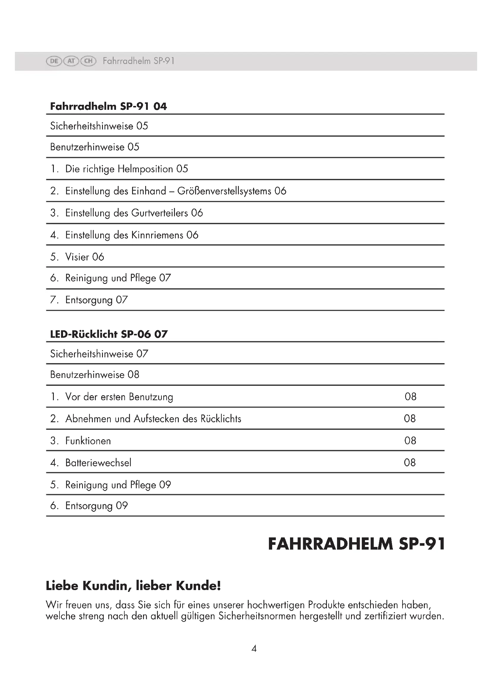 FAHRRADHELM SP-91 Liebe Kundin, lieber Kunde! Wir freuen uns, dass Sie sich für eines unserer hochwertigen Produkte entschieden haben, welche streng nach den aktuell gültigen Sicherheitsnormen hergestellt und zertiziert wurden. Fahrradhelm SP-91 04 Sicherheitshinweise 05 Benutzerhinweise 05