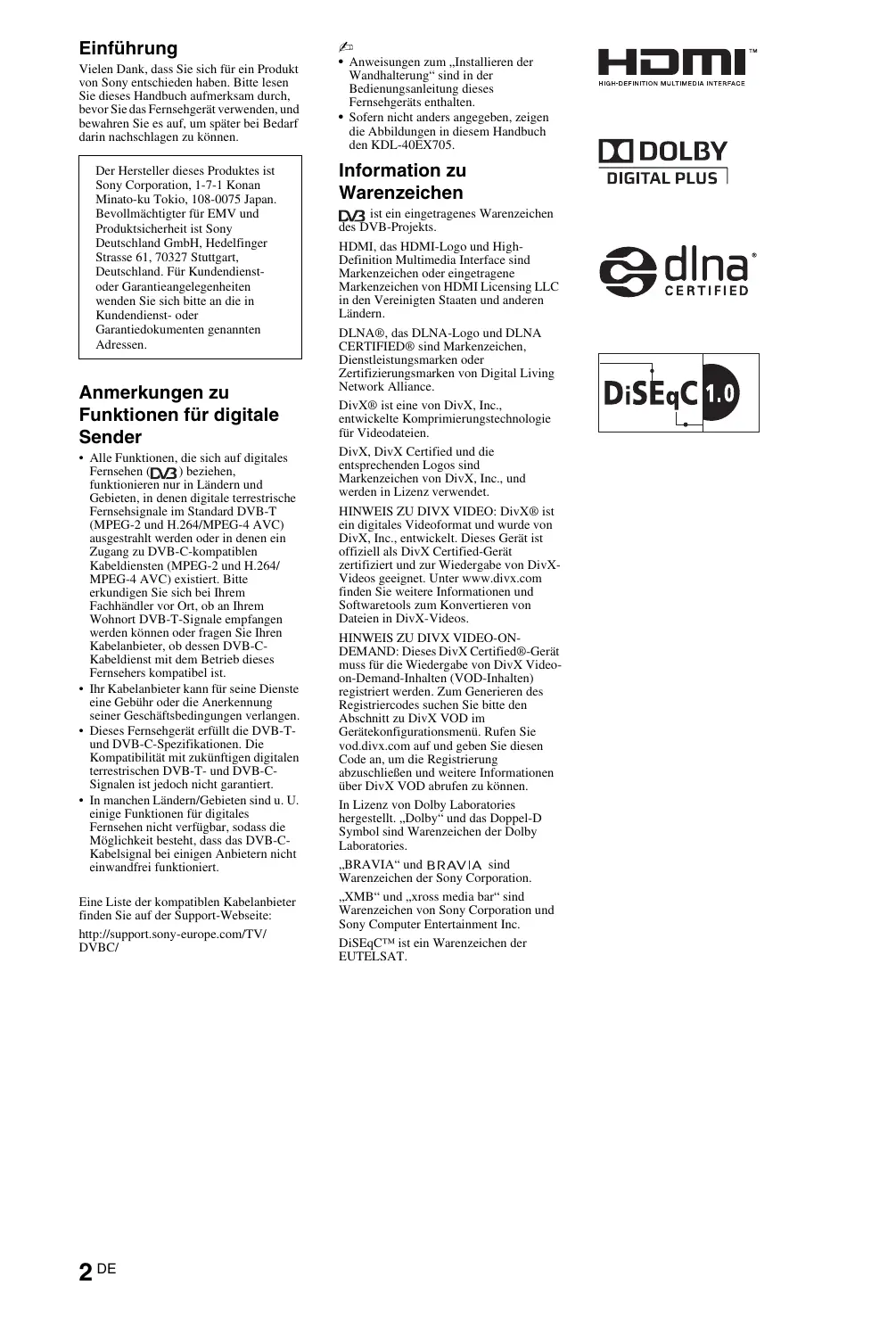 - Sofern nicht anders angegeben, zeigen die Abbildungen in diesem Handbuch den KDL-40EX705. Information zu Warenzeichen ist ein eingetragenes Warenzeichen des DVB-Projekts. HDMI, das HDMI-Logo und HighDefinition Multimedia Interface sind Markenzeichen oder eingetragene Markenzeichen von HDMI Licensing LLC in den Vereinigten Staaten und anderen Ländern. DLNA®, das DLNA-Logo und DLNA CERTIFIED® sind Markenzeichen, Dienstleistungsmarken oder Zertifizierungsmarken von Digital Living Network Alliance. DivX® ist eine von DivX, Inc., entwickelte Komprimierungstechnologie für Videodateien. DivX, DivX Certified und die entsprechenden Logos sind Markenzeichen von DivX, Inc., und werden in Lizenz verwendet. HINWEIS ZU DIVX VIDEO: DivX® ist ein digitales Videoformat und wurde von DivX, Inc., entwickelt. Dieses Gerät ist offiziell als DivX Certified-Gerät zertifiziert und zur Wiedergabe von DivXVideos geeignet. Unter www.divx.com finden Sie weitere Informationen und Softwaretools zum Konvertieren von Dateien in DivX-Videos. HINWEIS ZU DIVX VIDEO-ONDEMAND: Dieses DivX Certified®-Gerät muss für die Wiedergabe von DivX Videoon-Demand-Inhalten (VOD-Inhalten) registriert werden. Zum Generieren des Registriercodes suchen Sie bitte den Abschnitt zu DivX VOD im Gerätekonfigurationsmenü. Rufen Sie vod.divx.com auf und geben Sie diesen Code an, um die Registrierung abzuschließen und weitere Informationen über DivX VOD abrufen zu können. In Lizenz von Dolby Laboratories hergestellt. „Dolby“ und das Doppel-D Symbol sind Warenzeichen der Dolby Laboratories. „BRAVIA“ und sind Warenzeichen der Sony Corporation. „XMB“ und „xross media bar“ sind Warenzeichen von Sony Corporation und Sony Computer Entertainment Inc. DiSEqC™ ist ein Warenzeichen der EUTELSAT. Inhaltsverzeichnis Überprüfen des Zubehörs ..............................................................................................................3 Einsetzen von Batterien in die Fernbedienung ..............................................................................3 Aufstellung und Grundeinstellungen Befestigen des Tischständers (außer beim Modell KDL-60EX705)...............................................4 Anschließen einer Antenne/einer Set-Top-Box/eines Recorders (z. B. DVD-Recorder) ...............4 Anbringen einer Kippsicherung für das Fernsehgerät ...................................................................5 Bündeln der Kabel .........................................................................................................................5 Durchführen der anfänglichen Grundeinstellungen .......................................................................5 Abnehmen des Tischständers vom Fernsehgerät .........................................................................7 Fernsehen So sehen Sie fern ..........................................................................................................................8 So verwenden Sie die Funktionen des Fernsehgeräts ..................................................................8 So verwenden Sie i-Manual ...........................................................................................................9 Zusatzinformationen Störungsbehebung.......................................................................................................................10 Technische Daten ........................................................................................................................12 Montieren des Zubehörs (Wandhalterung) ..................................................................................15 Tabelle der Fernsehgeräte-Installationsabmessungen................................................................16 Zeichnung/Tabelle der Schrauben- und Hakenpositionen...........................................................17 Sicherheitsinformationen .............................................................................................................18 Sicherheitsmaßnahmen ...............................................................................................................19