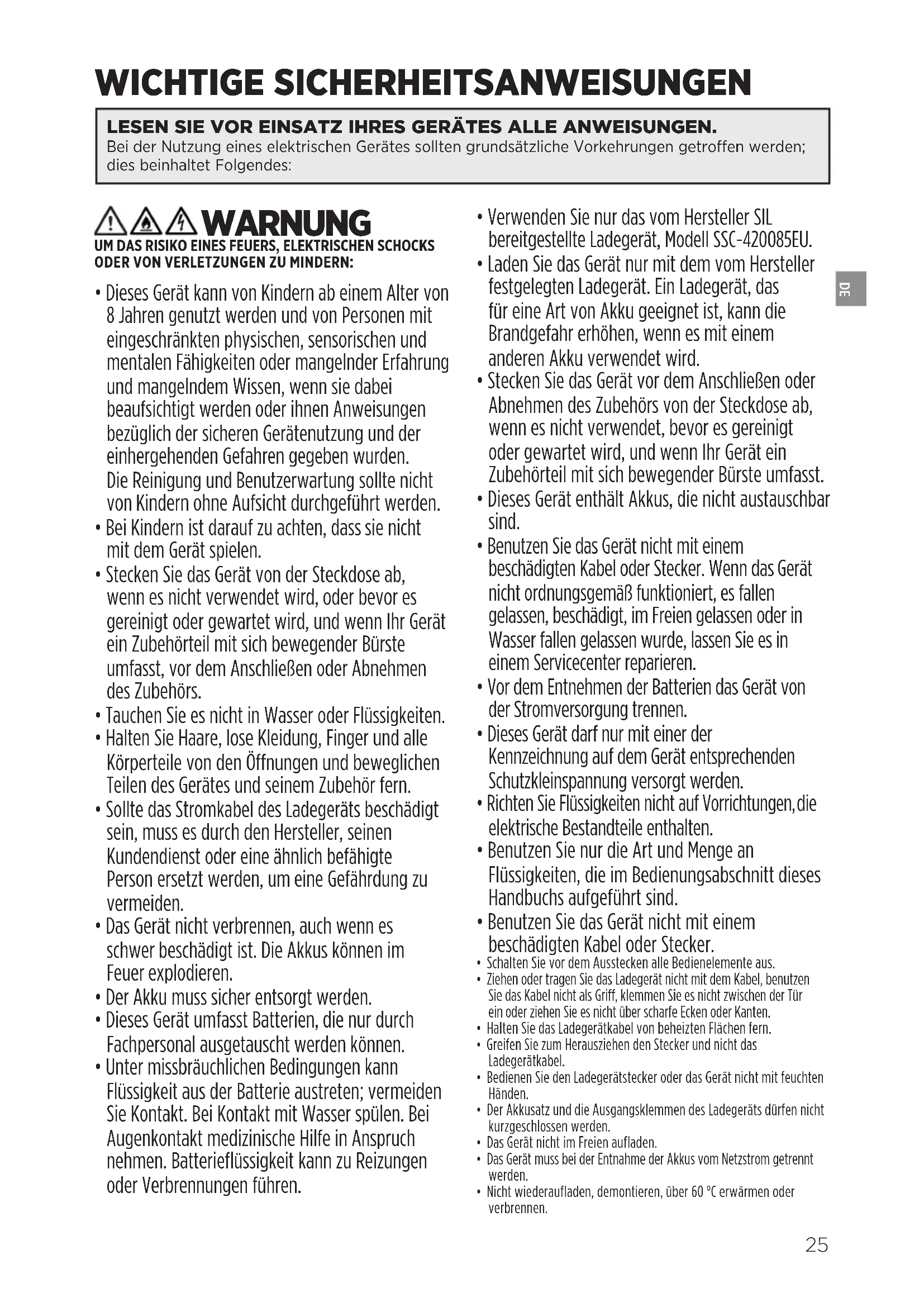 - Verwenden Sie nur das vom Hersteller SIL bereitgestellte Ladegerät, Modell SSC-420085EU.