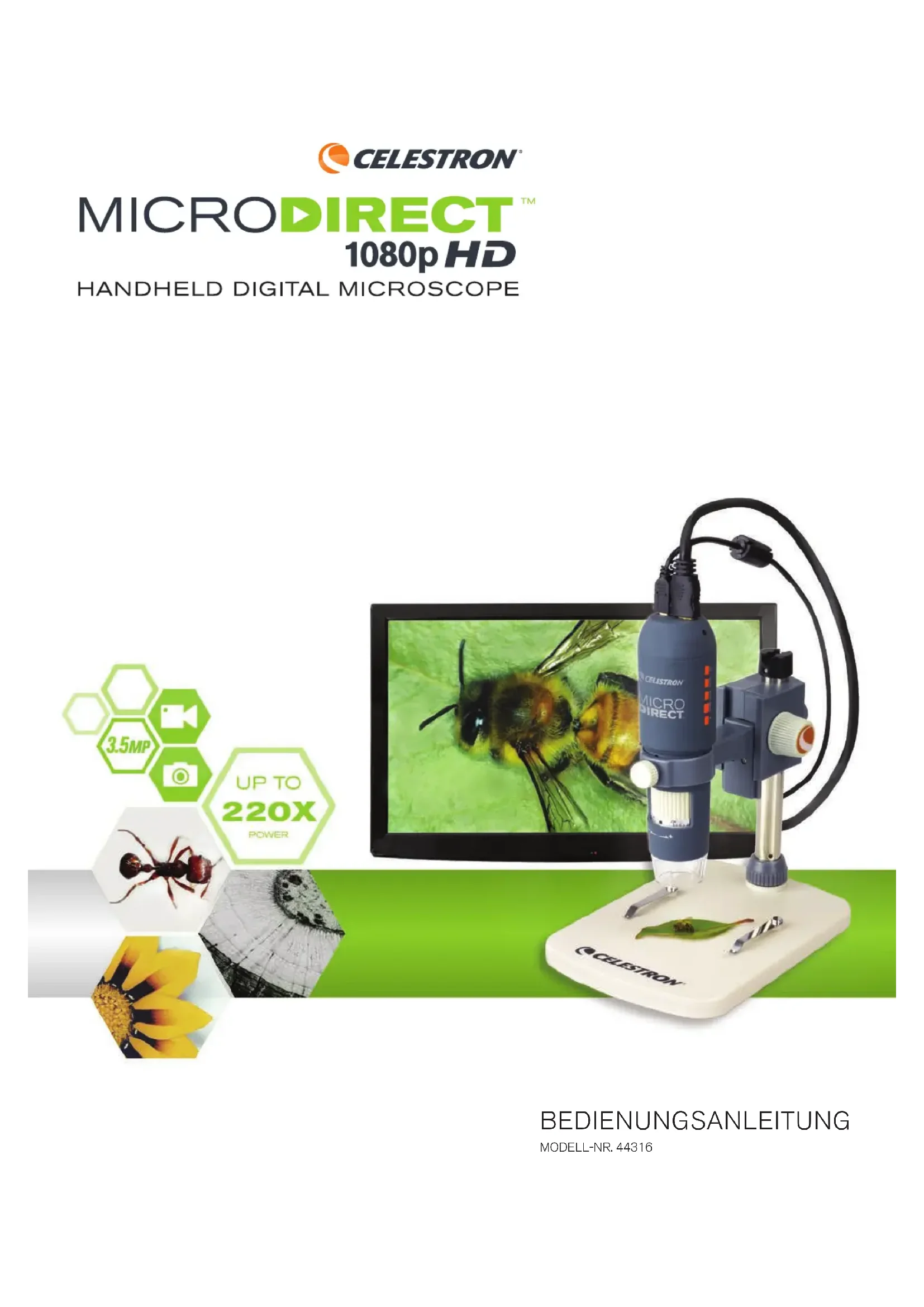 Laden Sie die Anleitung für Ihr Mikroskop kostenlos im PDF-Format! Finden Sie Ihr Handbuch MicroDirect - CELESTRON und nehmen Sie Ihr elektronisches Gerät wieder in die Hand. Auf dieser Seite sind alle Dokumente veröffentlicht, die für die Verwendung Ihres Geräts notwendig sind. MicroDirect von der Marke CELESTRON.