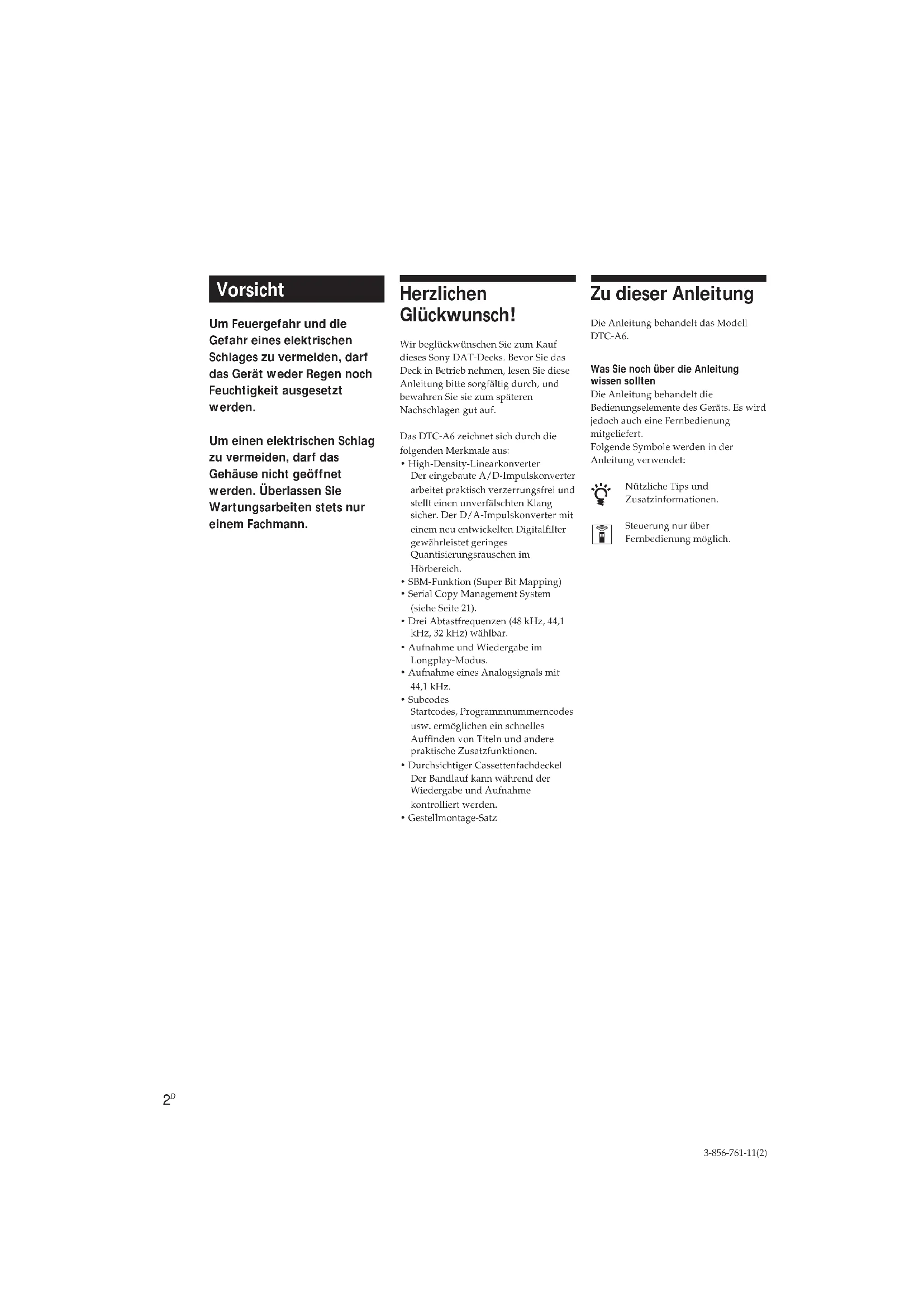 3-856-761-11(2) Vorsicht Um Feuergefahr und die Gefahr eines elektrischen Schlages zu vermeiden, darf das Gerät weder Regen noch Feuchtigkeit ausgesetzt werden. Um einen elektrischen Schlag zu vermeiden, darf das Gehäuse nicht geöffnet werden. Überlassen Sie Wartungsarbeiten stets nur einem Fachmann. Zu dieser Anleitung Die Anleitung behandelt das Modell DTC-A6. Was Sie noch über die Anleitung wissen sollten Die Anleitung behandelt die Bedienungselemente des Geräts. Es wird jedoch auch eine Fernbedienung mitgeliefert. Folgende Symbole werden in der Anleitung verwendet: