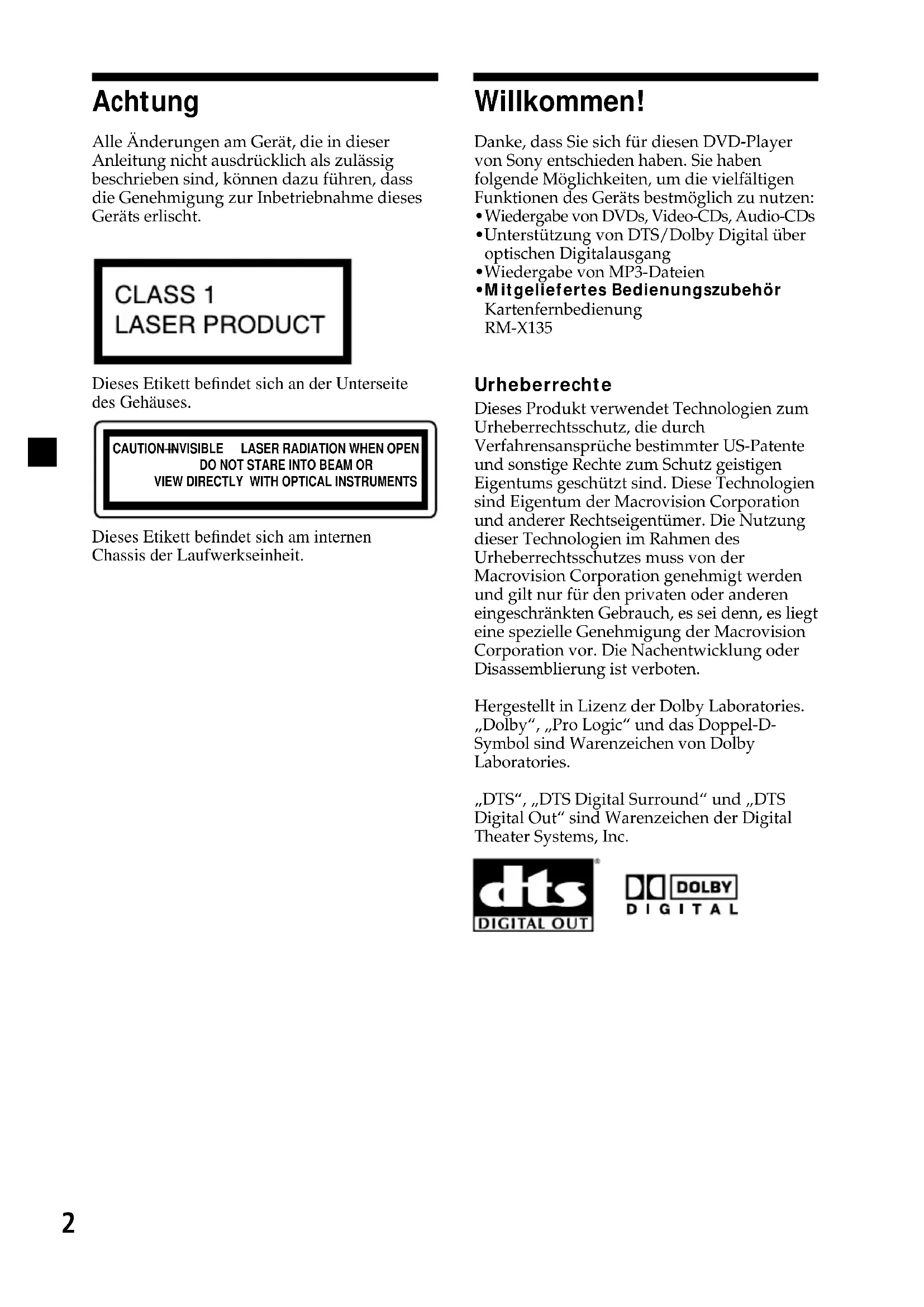 - Mitgeliefertes Bedienungszubehör Kartenfernbedienung RM-X135 Urheberrechte Dieses Produkt verwendet Technologien zum Urheberrechtsschutz, die durch Verfahrensansprüche bestimmter US-Patente und sonstige Rechte zum Schutz geistigen Eigentums geschützt sind. Diese Technologien sind Eigentum der Macrovision Corporation und anderer Rechtseigentümer. Die Nutzung dieser Technologien im Rahmen des Urheberrechtsschutzes muss von der Macrovision Corporation genehmigt werden und gilt nur für den privaten oder anderen eingeschränkten Gebrauch, es sei denn, es liegt eine spezielle Genehmigung der Macrovision Corporation vor. Die Nachentwicklung oder Disassemblierung ist verboten. Hergestellt in Lizenz der Dolby Laboratories. „Dolby“, „Pro Logic“ und das Doppel-D- Symbol sind Warenzeichen von Dolby Laboratories. „DTS“, „DTS Digital Surround“ und „DTS Digital Out“ sind Warenzeichen der Digital Theater Systems, Inc. Achtung Alle Änderungen am Gerät, die in dieser Anleitung nicht ausdrücklich als zulässig beschrieben sind, können dazu führen, dass die Genehmigung zur Inbetriebnahme dieses Geräts erlischt. Dieses Etikett befindet sich an der Unterseite des Gehäuses. CAUTION INVISIBLE