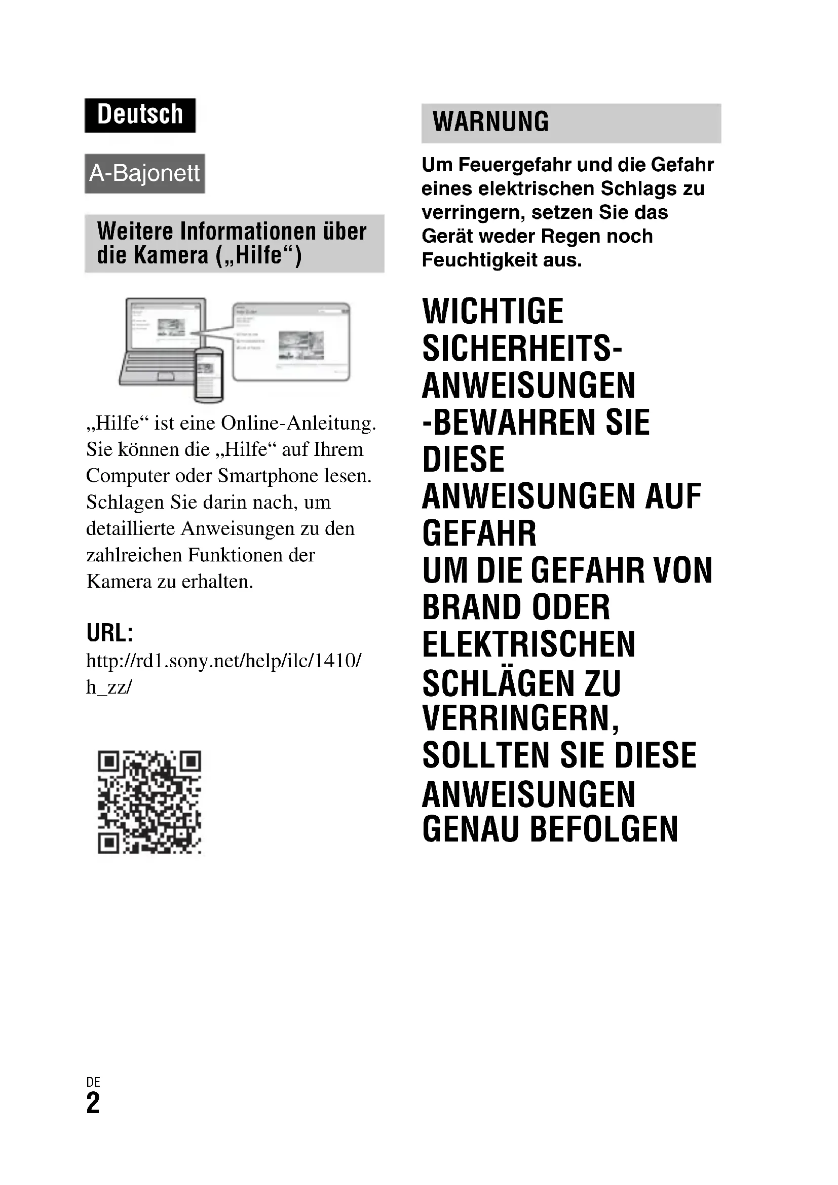 „Hilfe“ ist eine Online-Anleitung. Sie können die „Hilfe“ auf Ihrem Computer oder Smartphone lesen. Schlagen Sie darin nach, um detaillierte Anweisungen zu den zahlreichen Funktionen der Kamera zu erhalten. URL: http://rd1.sony.net/help/ilc/1410/ h_zz/ Um Feuergefahr und die Gefahr eines elektrischen Schlags zu verringern, setzen Sie das Gerät weder Regen noch Feuchtigkeit aus. WICHTIGE SICHERHEITS- ANWEISUNGEN -BEWAHREN SIE DIESE ANWEISUNGEN AUF GEFAHR