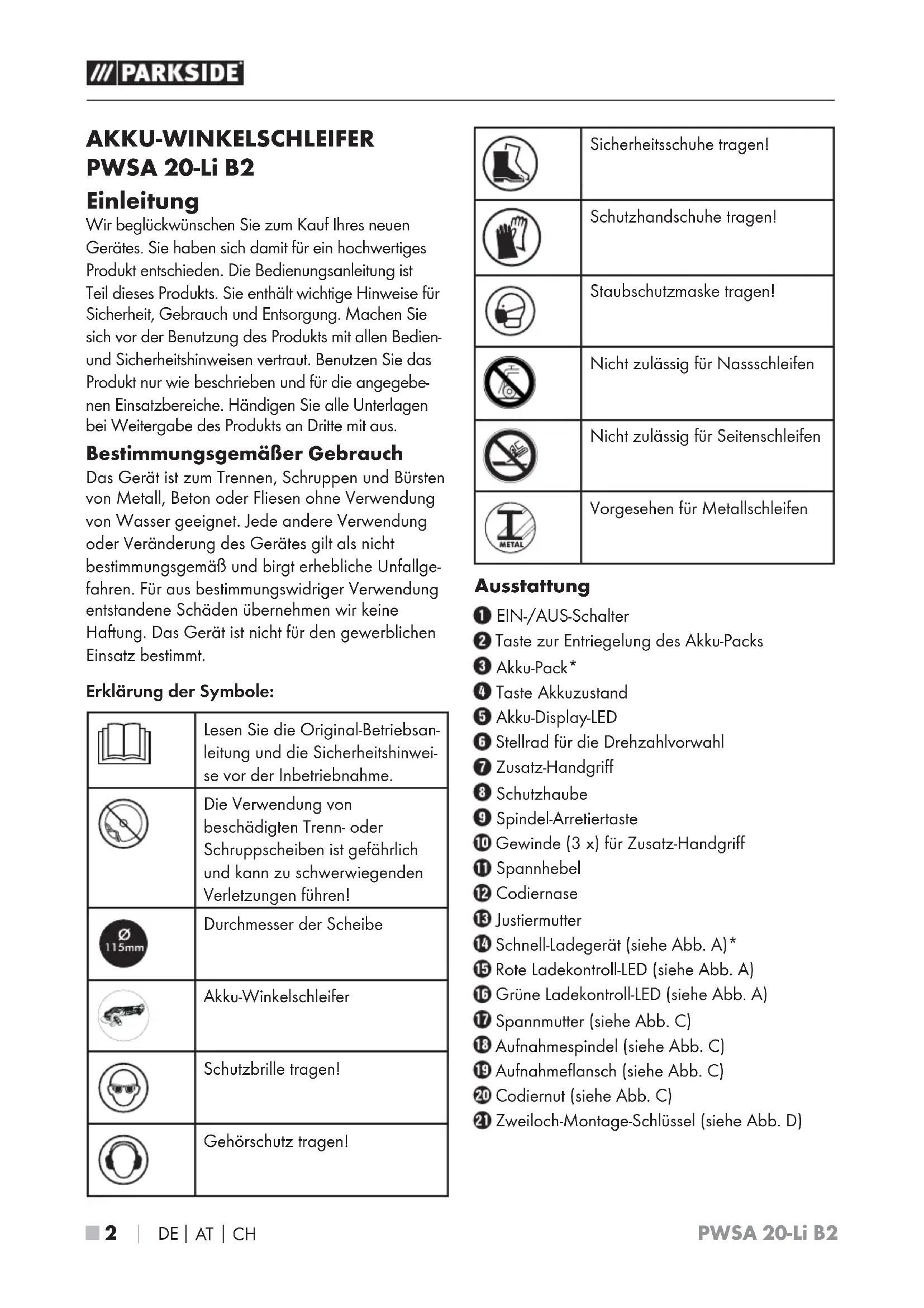 AKKU-WINKELSCHLEIFER PWSA 20-Li B2 Einleitung Wir beglückwünschen Sie zum Kauf Ihres neuen Gerätes. Sie haben sich damit für ein hochwertiges Produkt entschieden. Die Bedienungsanleitung ist Teil dieses Produkts. Sie enthält wichtige Hinweise für Sicherheit, Gebrauch und Entsorgung. Machen Sie sich vor der Benutzung des Produkts mit allen Bedien- und Sicherheitshinweisen vertraut. Benutzen Sie das Produkt nur wie beschrieben und für die angegebe- nen Einsatzbereiche. Händigen Sie alle Unterlagen bei Weitergabe des Produkts an Dritte mit aus. Bestimmungsgemäßer Gebrauch Das Gerät ist zum Trennen, Schruppen und Bürsten von Metall, Beton oder Fliesen ohne Verwendung von Wasser geeignet. Jede andere Verwendung oder Veränderung des Gerätes gilt als nicht bestimmungsgemäß und birgt erhebliche Unfallge- fahren. Für aus bestimmungswidriger Verwendung entstandene Schäden übernehmen wir keine Haftung. Das Gerät ist nicht für den gewerblichen Einsatz bestimmt. Erklärung der Symbole: Lesen Sie die Original-Betriebsan- leitung und die Sicherheitshinwei- se vor der Inbetriebnahme. Die Verwendung von beschädigten Trenn- oder Schruppscheiben ist gefährlich und kann zu schwerwiegenden Verletzungen führen! Durchmesser der Scheibe Akku-Winkelschleifer Schutzbrille tragen! Gehörschutz tragen! Sicherheitsschuhe tragen! Schutzhandschuhe tragen! Staubschutzmaske tragen! Nicht zulässig für Nassschleifen Nicht zulässig für Seitenschleifen Vorgesehen für Metallschleifen Ausstattung EIN-/AUS-Schalter Taste zur Entriegelung des Akku-Packs Akku-Pack* Taste Akkuzustand Akku-Display-LED Stellrad für die Drehzahlvorwahl Zusatz-Handgriff Schutzhaube Spindel-Arretiertaste Gewinde (3 x) für Zusatz-Handgriff Spannhebel Codiernase Justiermutter Schnell-Ladegerät (siehe Abb. A)* Rote Ladekontroll-LED (siehe Abb. A) Grüne Ladekontroll-LED (siehe Abb. A) Spannmutter (siehe Abb. C) Aufnahmespindel (siehe Abb. C) Aufnahmeflansch (siehe Abb. C) Codiernut (siehe Abb. C) Zweiloch-Montage-Schlüssel (siehe Abb. D)PWSA 20-Li B2