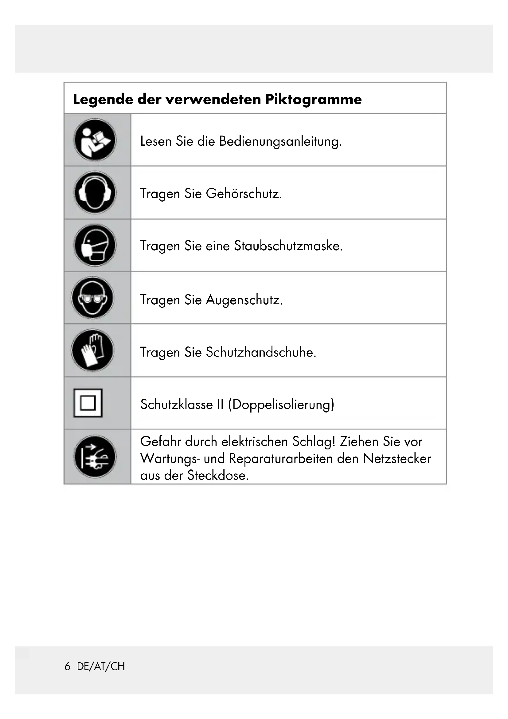 75 DE/AT/CH Legende der verwendeten Piktogramme ............................................................ Seite 6 Einleitung ...................................................................... Seite 7 Bestimmungsgemäße Verwendung ................................. Seite 7 Teilebeschreibung ............................................................ Seite 8 Lieferumfang ..................................................................... Seite 8 Technische Daten ............................................................. Seite 8 Allgemeine Sicherheitshinweise für Elektrowerkzeuge ....................................... Seite 10 Inbetriebnahme ...................................................... Seite 15 Ein- / Ausschalten.............................................................. Seite 16 Hubtiefe einstellen ............................................................ Seite 16 Gravierspitze auswechseln .............................................. Seite 17 Gravuren erstellen ............................................................ Seite 18 Wartung und Reinigung .................................. Seite 18 Entsorgung .................................................................. Seite 19 Service ............................................................................ Seite 20 Abwicklung im Garantiefall ............................................. Seite 20 Service .............................................................................. Seite 21 Garantie ........................................................................ Seite 22 Original-Konformitätserklärung .............. Seite 236 DE/AT/CH Legende der verwendeten Piktogramme Lesen Sie die Bedienungsanleitung. Tragen Sie Gehörschutz. Tragen Sie eine Staubschutzmaske. Tragen Sie Augenschutz. Tragen Sie Schutzhandschuhe. Schutzklasse II (Doppelisolierung) Gefahr durch elektrischen Schlag! Ziehen Sie vor Wartungs- und Reparaturarbeiten den Netzstecker aus der Steckdose.7 DE/AT/CH Graviergerät PGG 15 D3 Einleitung Wir beglückwünschen Sie zum Kauf Ihres neuen Produkts. Sie haben sich damit für ein hochwertiges Produkt entschieden. Die Bedienungsanleitung ist Teil dieses Produkts. Sie enthält wichtige Hinweise für Sicherheit, Gebrauch und Entsorgung. Machen Sie sich vor der Benutzung des Produkts mit allen Bedien- und Sicher- heitshinweisen vertraut. Benutzen Sie das Produkt nur wie beschrie- ben und für die angegebenen Einsatzbereiche. Händigen Sie alle Unterlagen bei Weitergabe des Produkts an Dritte mit aus. Bestimmungsgemäße Verwendung Dieses Produkt ist zum Gravieren oder Verzieren von Materialien wie Metall, Kunststoff, Glas, Keramik, Holz, und Leder vorgesehen. And ere Verwendungen oder Veränderungen des Produkts gelten als nicht bestimmungsgemäß und können zu Risiken wie Lebensgefahr