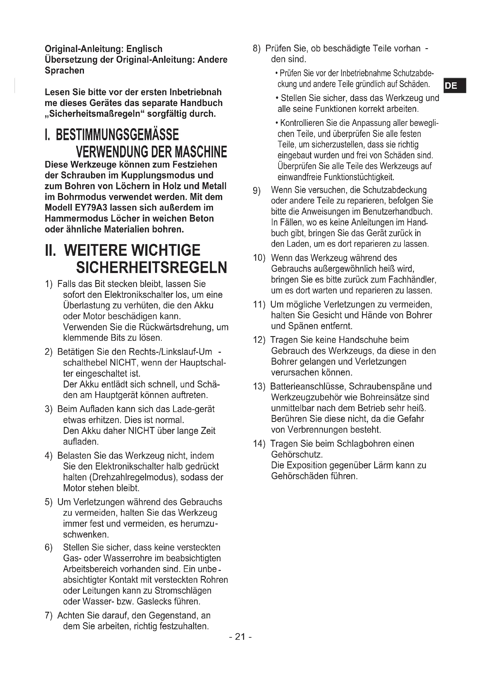 Original-Anleitung: Englisch Übersetzung der Original-Anleitung: Andere Sprachen Lesen Sie bitte vor der ersten Inbetriebnah me dieses Gerätes das separate Handbuch „Sicherheitsmaßregeln“ sorgfältig durch.