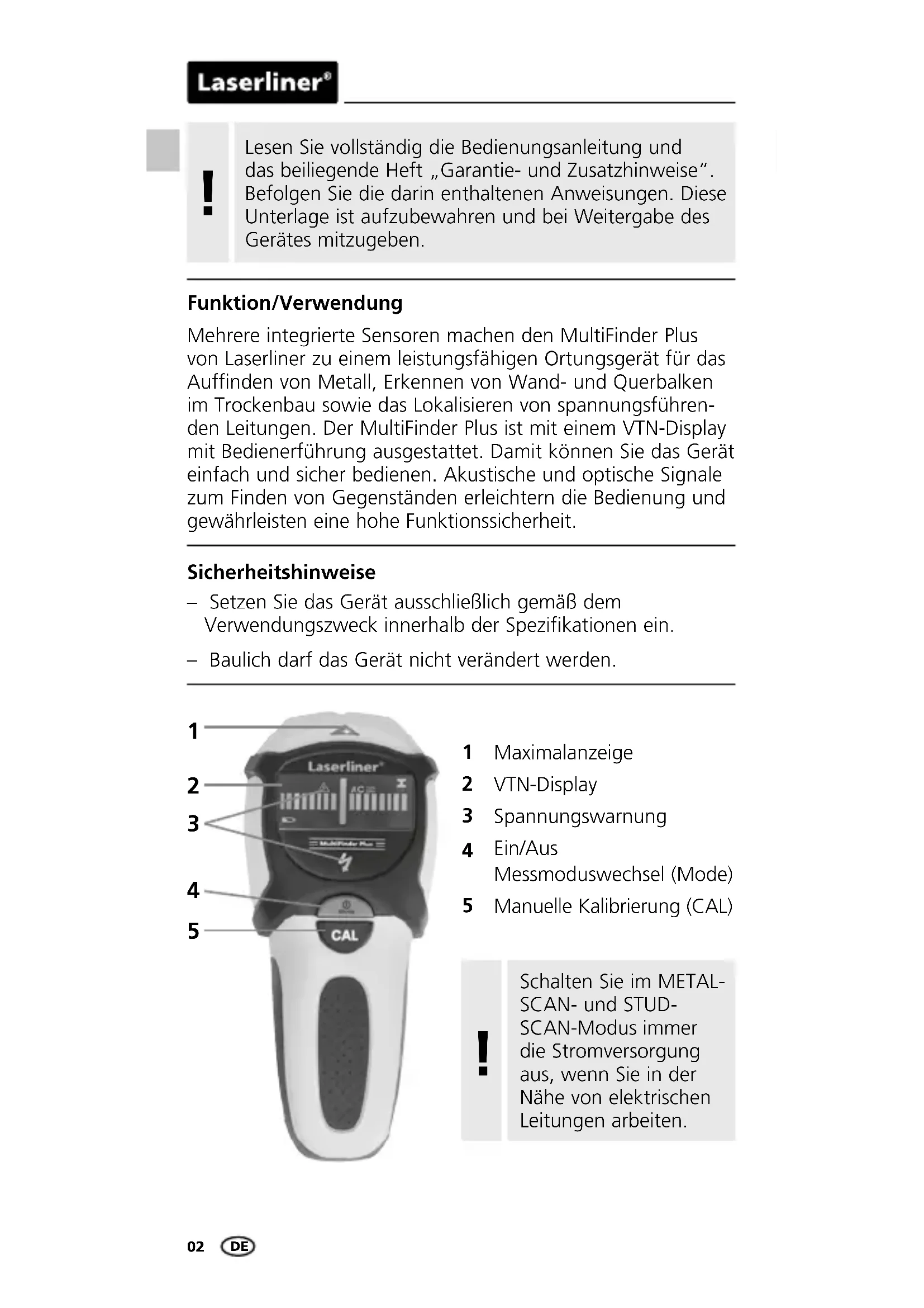 Maximalanzeige VTN-Display Spannungswarnung Ein/Aus Messmoduswechsel (Mode) Manuelle Kalibrierung (CAL) Mehrere integrierte Sensoren machen den MultiFinder Plus von Laserliner zu einem leistungsfähigen Ortungsgerät für das Auffinden von Metall, Erkennen von Wand- und Querbalken im Trockenbau sowie das Lokalisieren von spannungsführen- den Leitungen. Der MultiFinder Plus ist mit einem VTN-Display mit Bedienerführung ausgestattet. Damit können Sie das Gerät einfach und sicher bedienen. Akustische und optische Signale zum Finden von Gegenständen erleichtern die Bedienung und gewährleisten eine hohe Funktionssicherheit. Sicherheitshinweise – Setzen Sie das Gerät ausschließlich gemäß dem Verwendungszweck innerhalb der Spezifikationen ein. – Baulich darf das Gerät nicht verändert werden.DE