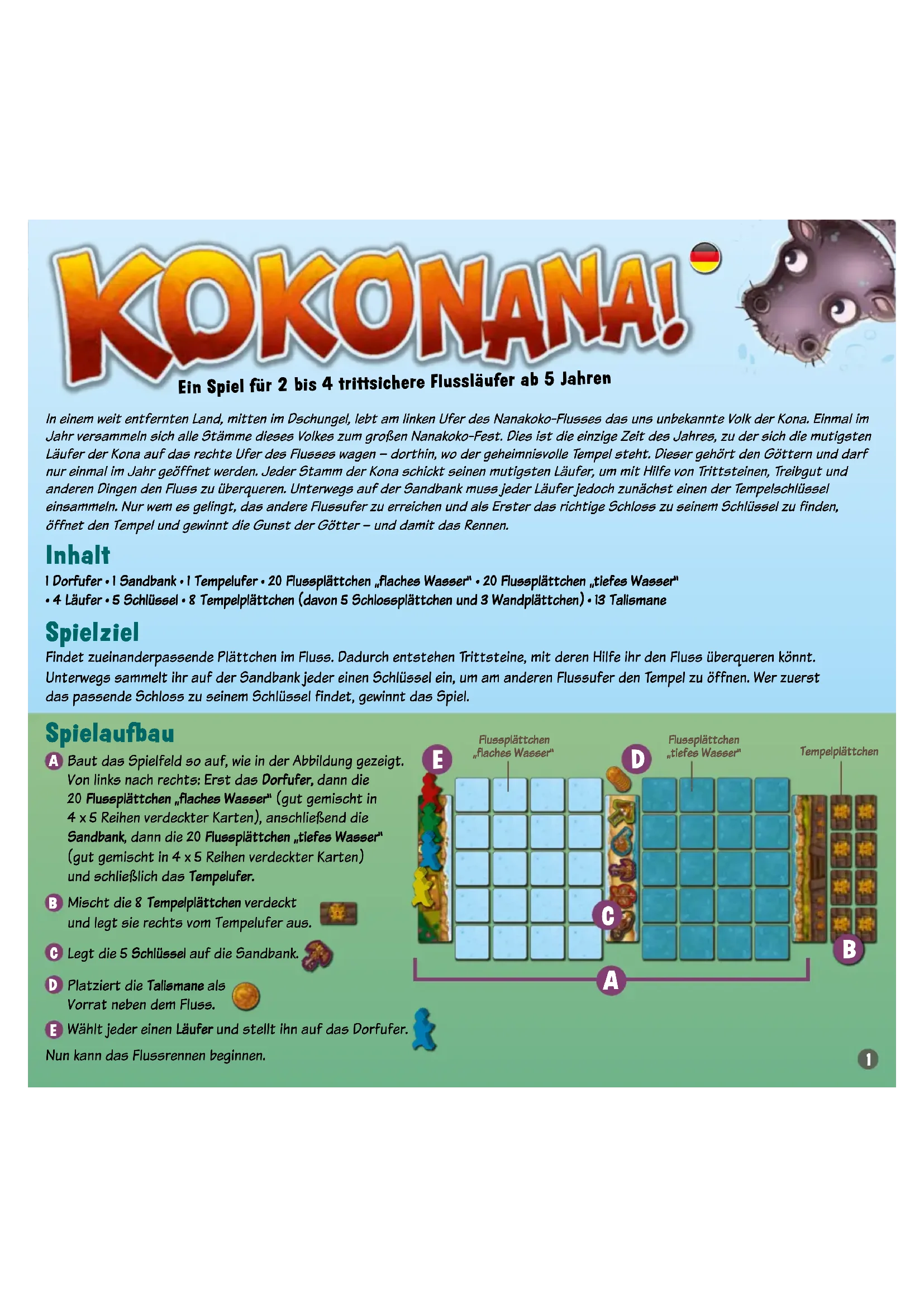 - 4 Läufer • 5 Schlüssel • 8 Tempelplättchen (davon 5 Schlossplättchen und 3 Wandplättchen) • 13 Talismane Findet zueinanderpassende Plättchen im Fluss. Dadurch entstehen Trittsteine, mit deren Hilfe ihr den Fluss überqueren könnt. Unterwegs sammelt ihr auf der Sandbank jeder einen Schlüssel ein, um am anderen Flussufer den Tempel zu öffnen. Wer zuerst das passende Schloss zu seinem Schlüssel findet, gewinnt das Spiel. Baut das Spielfeld so auf, wie in der Abbildung gezeigt. Von links nach rechts: Erst das Dorfufer, dann die 20 Flussplättchen „flaches Wasser“ (gut gemischt in 4 x 5 Reihen verdeckter Karten), anschließend die Sandbank, dann die 20 Flussplättchen „tiefes Wasser“ (gut gemischt in 4 x 5 Reihen verdeckter Karten) und schließlich das Tempelufer. Mischt die 8 Tempelplättchen verdeckt und legt sie rechts vom Tempelufer aus. Wählt jeder einen Läufer und stellt ihn auf das Dorfufer. Nun kann das Flussrennen beginnen. Platziert die Talismane als Vorrat neben dem Fluss. Legt die 5 Schlüssel auf die Sandbank. In einem weit entfernten Land, mitten im Dschungel, lebt am linken Ufer des Nanakoko-Flusses das uns unbekannte Volk der Kona. Einmal im Jahr versammeln sich alle Stämme dieses Volkes zum großen Nanakoko-Fest. Dies ist die einzige Zeit des Jahres, zu der sich die mutigsten Läufer der Kona auf das rechte Ufer des Flusses wagen – dorthin, wo der geheimnisvolle Tempel steht. Dieser gehört den Göttern und darf nur einmal im Jahr geöffnet werden. Jeder Stamm der Kona schickt seinen mutigsten Läufer, um mit Hilfe von Trittsteinen, Treibgut und anderen Dingen den Fluss zu überqueren. Unterwegs auf der Sandbank muss jeder Läufer jedoch zunächst einen der Tempelschlüssel einsammeln. Nur wem es gelingt, das andere Flussufer zu erreichen und als Erster das richtige Schloss zu seinem Schlüssel zu finden, öffnet den Tempel und gewinnt die Gunst der Götter – und damit das Rennen.Flussplättchen„flaches Wasser“Flussplättchen„tiefes Wasser“Tempelplättchen2 Spielablauf