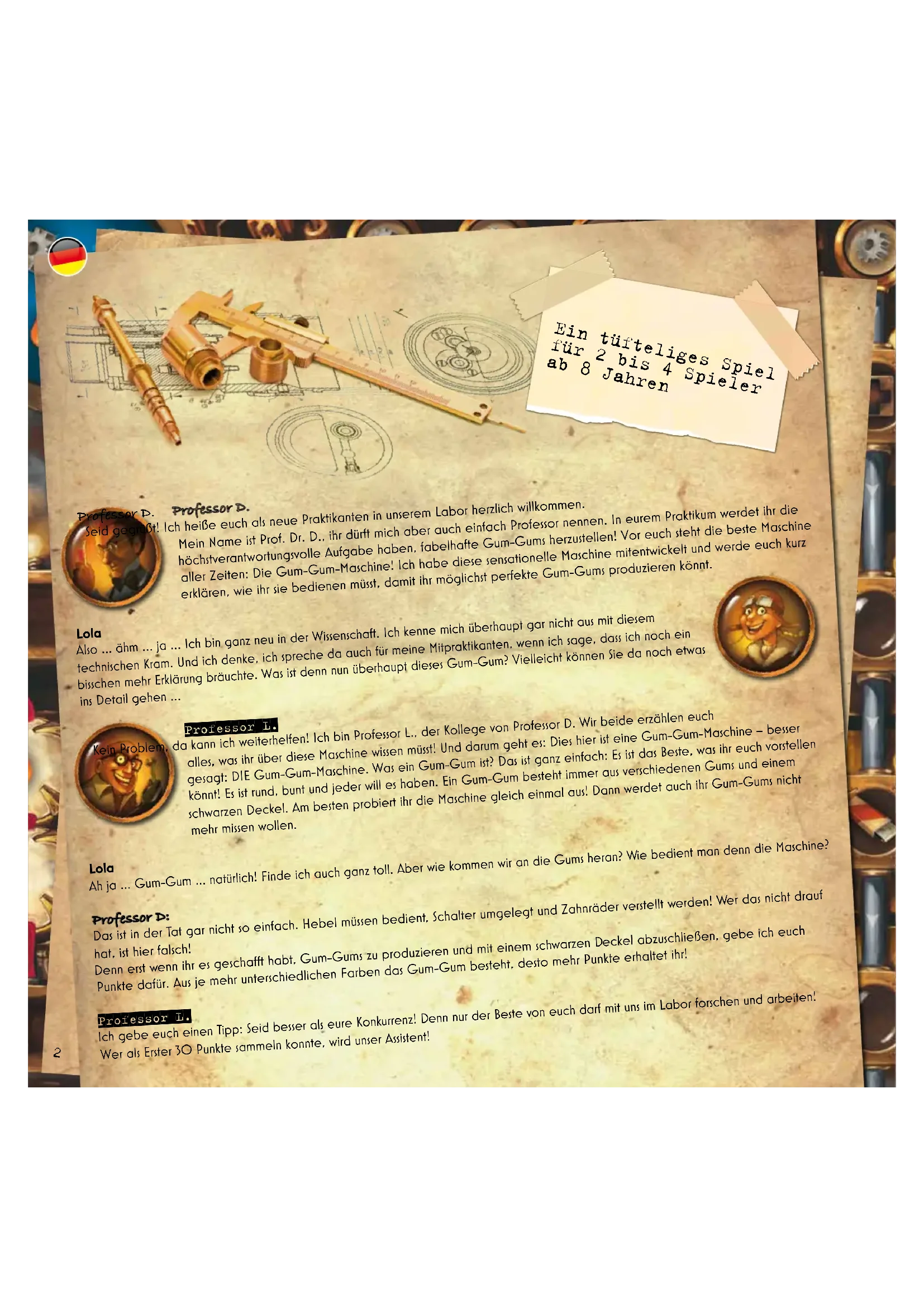 ne Rohr. Sie folgt dem Rohr bis zum ersten Gum-Speicher. Das erste Gum ist grün, das zweite gelb und das dritte lila. Grün hat sie bereits vor sich liegen. Gelb und lila fehlen ihr aber noch. Sie entscheidet sich für das gelbe Gum, nimmt es aus dem Fach und legt es auf ihr grünes Gum. In dem Fach kommt ein Zahnrad zum Vorschein. Lola springt nun zum Zahnrad und folgt dem neuen Rohr. Sie hätte auch das gelbe Gum liegen lassen können und das lilafarbene nehmen können. Unter dem lilafarbenen Gum befindet sich kein Symbol. Sie dürfte jetzt also weiter dem orangefarbenen Rohr folgen und die Drehscheibe bedienen. Sie dürfte jedoch nicht wieder zurück und das gelbe Gum nehmen. Lola hätte in keinem Fall z.B. das lilafarbene Gum nehmen und dann nach unten zum rosa Gum abbiegen dürfen, da sie dann die Rohrfarbe gewechselt hätte. Professor L. Nun aber wieder zurück zur Maschine. Ein paar Stationen müsst ihr noch kennenlernen: Symbole, die in der Maschine auftauchen Zahnrad, Kolben, Flamme Direkt unter dem Startschieber befinden sich die Maschinenteile Zahnrad, Kolben und Flamme. Mit diesen könnt ihr die darunter verlaufenden Rohre aktivieren. Um dies zu tun, müsst ihr irgendwo in der Maschine eins der entsprechenden Symbole für das Zahnrad, den Kolben oder die Flamme finden (z.B. unter einem Gum, in einem Kessel usw.). Sobald ihr ein solches Symbol gefunden habt, müsst ihr sofort zu dem entsprechenden Maschinenteil gehen und dem neuen Rohr folgen.9 Maschinenelemente Flüssige Veredelung Rühre im Kessel. Drehe die Abdeckung ein Viertel weiter in Pfeilrichtung. Führe das neue Symbol aus. Bildet das Symbol ein Maschinenteil ab, machst du sofort an der Stelle weiter, die das Symbol vorgibt. Bildet das Symbol ein doppeltes Gum ab, darfst du bei deinen Mitspielern einen Qualitätscheck durchführen! Schaue dir die Gum-Gum-Stapel deiner Mitspieler an. Jeder Mitspieler muss dir ein Gum einer der beiden abgebilde- ten Farben aus seinem Gum-Gum-Stapel geben, falls vorhanden. Du darfst bestim- men, welche der beiden Farben! Hast du die Farbe noch nicht, darfst du dieses Gum deinem Gum-Gum-Stapel hinzu- fügen und somit veredeln. Ist die Farbe bereits in deinem Stapel vorhanden, musst du sie zurück in den Vorrat legen. Weitere Symbole Während ihr die Maschine bedient, werdet ihr noch auf weitere Symbole stoßen. Ihr werdet Symbole finden, die einige Maschi- nenteile in klein abbilden. Sobald ihr auf so ein Symbol stoßt, lasst alles stehen und liegen und macht sofort an der Stelle weiter, die euch das Symbol vorgibt. Hier ein Beispiel: Lola hat Zahlenschalter 2 aktiviert und nimmt das dritte Gum (lila) aus dem Fach. Darunter kommt das Symbol des blauen Kessels zum Vorschein. Sie geht sofort zum blauen Kessel und dreht die Abdeckung um ein Viertel in Pfeilrichtung weiter und befolgt das nächste Symbol, das dort zum Vorschein kommt. Fliessband Ziehe 2 Gums aus dem Vorrat und schiebe sie von oben unter die Fließ- bandabdeckung. Unten kommen nun zwei Gums heraus. Hast du diese Farben noch nicht in deinem Gum-Gum vor dir liegen, darfst du beide Farben in dein Gum-Gum einbauen. Hast du eine oder beide Farben bereits in deinem Gum-Gum, nimmst du nur die Farbe, die du noch nicht hast. Die andere(n) gibst du in den Vorrat zurück. Hast du einen schwarzen Deckel gezogen, musst du dein Gum-Gum fertigstellen und werten. Nach dem Fließband endet in jedem Fall dein Zug. Kreuzschalter Verschiebe einen der beiden Schalter auf die gegenüberliegende Position und führe das Symbol aus, das nun zwi- schen den beiden Schaltern liegt. Die Schalter dürfen nicht um die Ecke gezo- gen werden und nicht in der Kreuzmitte stehen bleiben.10 Die Güteprüfung Hier kannst du zwischendurch schon mal testen, wie gut dein Gum-Gum ist. Schnip-pe den Pfeil. Die beiden Farben, auf denen der Zeiger stehen bleibt, haben eine besonders gute Qualität! Hast du die Gum-Farben, die angezeigt werden, bereits vor dir liegen, bekommst du für jede angezeigte Farbe einen Punkt. Trage die Punkte gleich mit deinem Zahnrad auf der Punkteleiste ab. Dein Zug ist nun zu Ende. Die Wartungsanzeige Schaue dir alle Gum-Felder der Maschine an und lege in jedes Feld, auf dem ein Symbol sichtbar ist, ein Gum aus dem Vorrat. Schnippe anschließend den Pfeil. Das Maschinenteil, dessen Symbol dir nun angezeigt wird, muss gewartet werden. Finde dieses Symbol unter den Gums. Zeigt der Zeiger z.B. auf die Flamme, musst du das Symbol Flamme finden. Hebe das Gum an, unter dem du dieses Symbol vermutest, und schaue nach, welches Symbol sich darunter befindet. Gelingt es dir beim ersten Mal nicht, das richtige Symbol zu finden, hast du noch einen zweiten Versuch!Hast du das richtige Symbol gefunden, darfst du sofort deinen Weg bei dem entsprechenden Maschinenteil fortsetzen.Hast du nicht das richtige Symbol gefunden, endet dein Zug. DruckAnzeiger Erreichst du den Druckanzeiger, wird der Druck in der Maschine berechnet. Zähle alle sichtbaren schwarzen Gum-Deckel. Stelle den Pfeil nun auf den entsprechen-den Wert ein. Anschließend musst du zu dem Schalter mit der passenden Zahl springen und deinen Zug dort fortsetzen, indem du den Schalter umlegst und dem Rohr folgst.Befinden sich mehr als 5 schwarze Deckel in der Maschine, herrscht Überdruck. Schnippe einmal gegen den Zeiger. Entferne an-schließend so viele schwarze Deckel aus der Maschine, dass sich nur noch so viele in der Maschine befinden, wie der Zeiger an-zeigt. Lege sie zurück in den Vorrat. Bleibt der Pfeil nach dem Schnippen auf dem braunen Überdruckfeld stehen, schnippe ihn einfach noch einmal. Anschließend endet dein Zug. Zufallsstichprobe Schnippe den Pfeil. Aktiviere den Schalter mit der Zahl, die der Pfeil anzeigt, und spiele von dort weiter. Hinweis: Wollt ihr viel Glück im Spiel, spielt am besten mit dem Drehrad „Zufallsstichprobe“ und verwendet viele Einlege- elemente, auf denen das Drehrad abgebildet ist. info