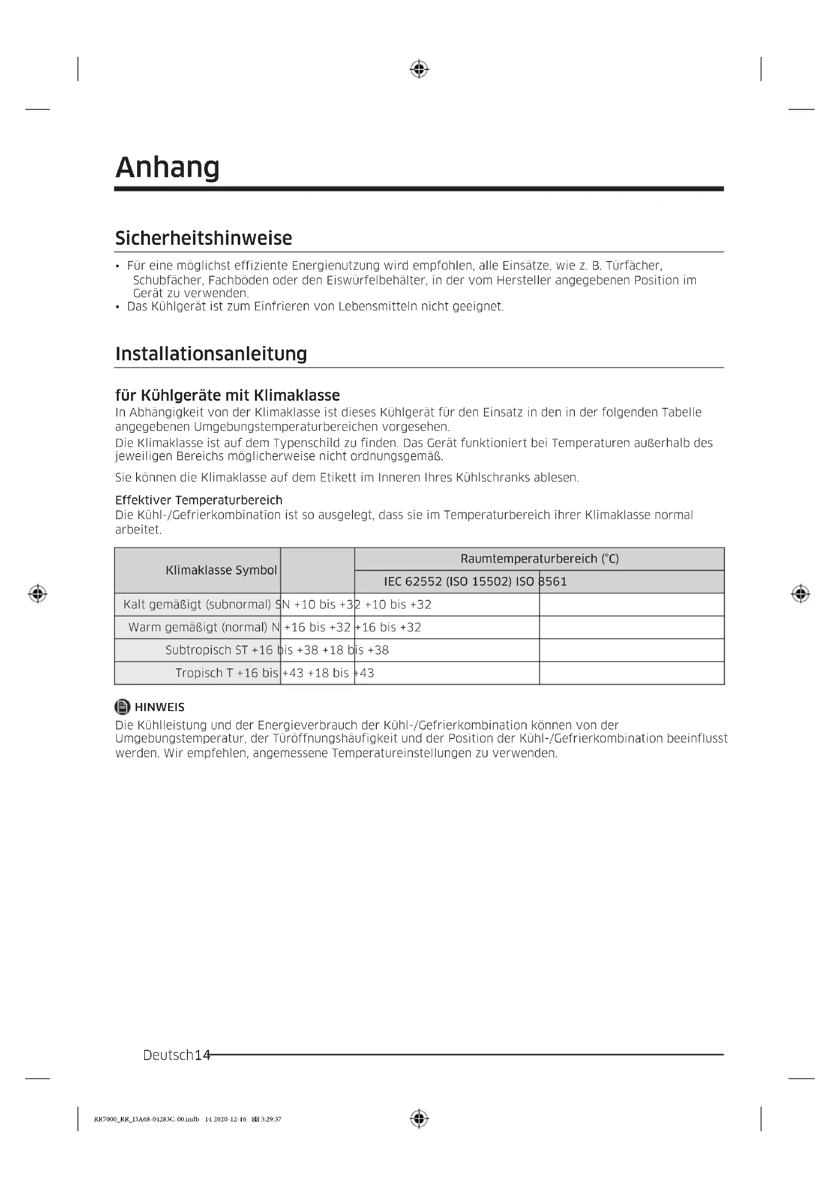 Kalt gemäßigt (subnormal) SN +10 bis +32 +10 bis +32 Warm gemäßigt (normal) N +16 bis +32 +16 bis +32 Subtropisch ST +16 bis +38 +18 bis +38 Tropisch T +16 bis +43 +18 bis +43 HINWEIS Die Kühlleistung und der Energieverbrauch der Kühl-/Gefrierkombination können von der Umgebungstemperatur, der Türöffnungshäufigkeit und der Position der Kühl-/Gefrierkombination beeinflusst werden. Wir empfehlen, angemessene Temperatureinstellungen zu verwenden. RR7000_RR_DA68-04283C-00.indb 14 2020-12-16 3:29:37Deutsch 15 Angaben zur Temperatur Empfohlene Temperatur Die optimale Temperatur für die Lagerung von Lebensmitteln: