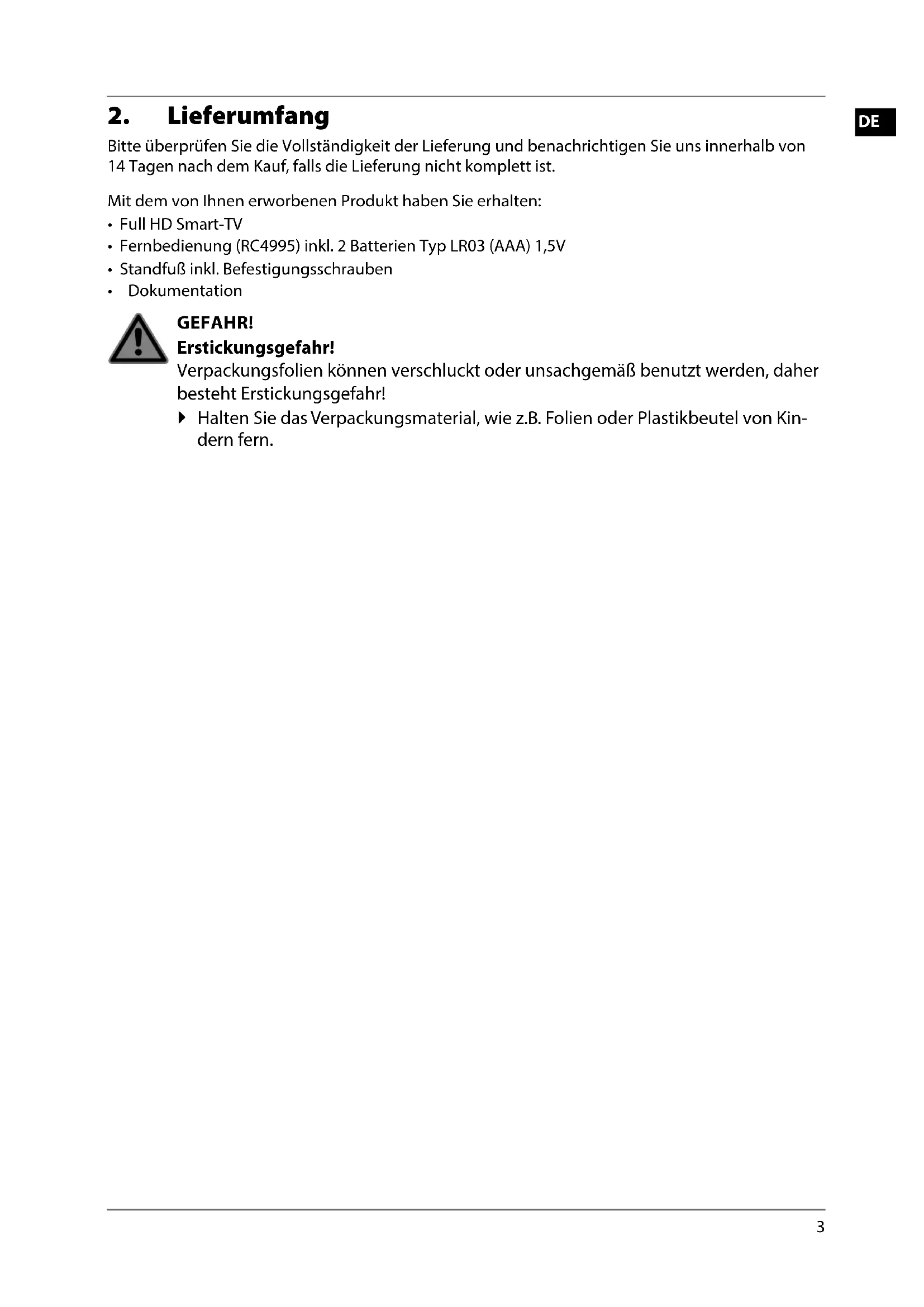 - Dokumentation GEFAHR! Erstickungsgefahr! Verpackungsfolien können verschluckt oder unsachgemäß benutzt werden, daher besteht Erstickungsgefahr! Halten Sie das Verpackungsmaterial, wie z.B. Folien oder Plastikbeutel von Kin- dern fern.
