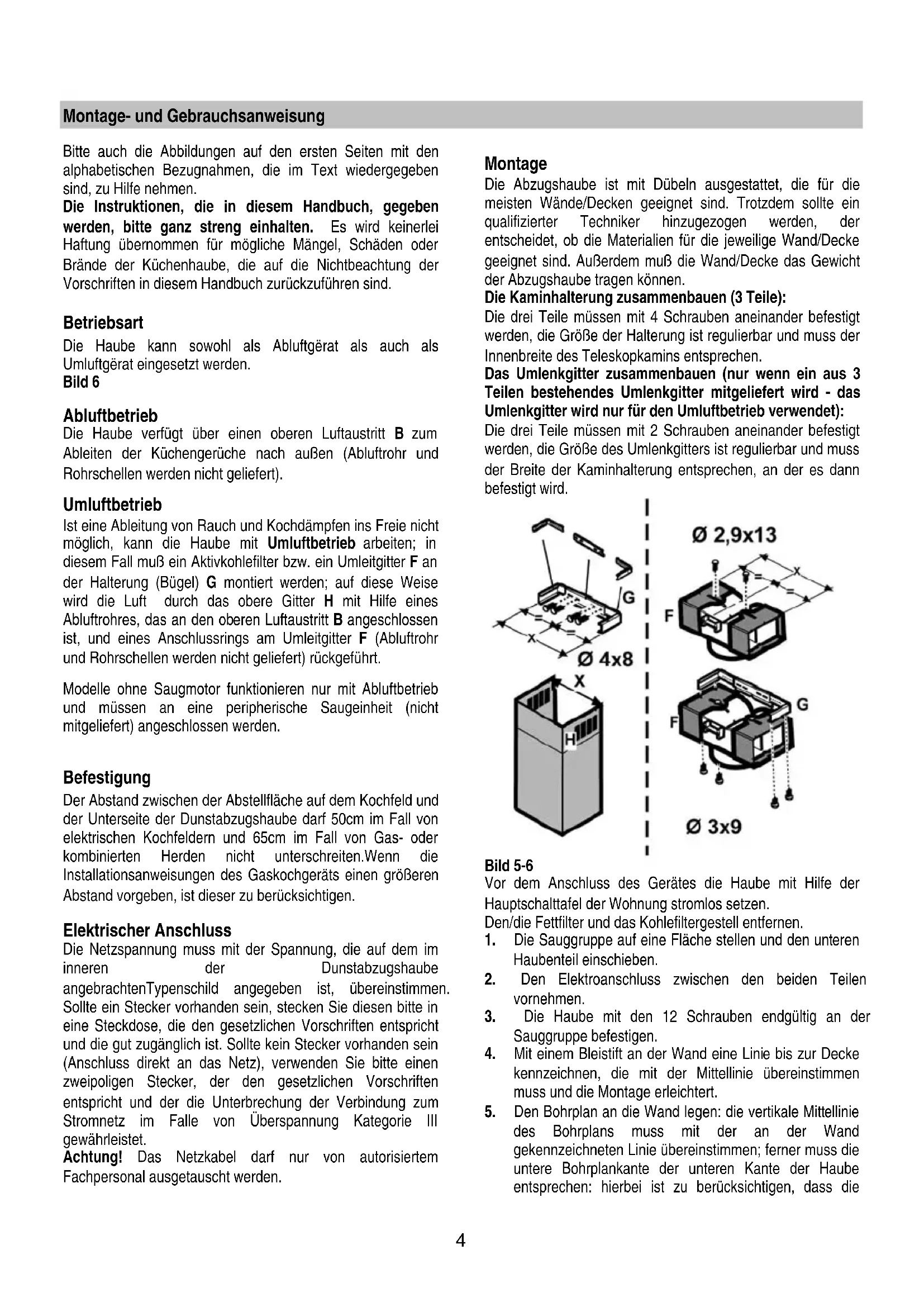 HHG 994 Montage- und Gebrauchsanweisung Instruction on mounting and use Prescriptions de montage et mode d’emploi Istruzioni di montaggio e d'uso Montaje y modo de empleo Instruções para montagem e utilização4 Montage- und Gebrauchsanweisung Bitte auch die Abbildungen auf den ersten Seiten mit den alphabetischen Bezugnahmen, die im Text wiedergegeben sind, zu Hilfe nehmen. Die Instruktionen, die in diesem Handbuch, gegeben werden, bitte ganz streng einhalten. Es wird keinerlei Haftung übernommen für mögliche Mängel, Schäden oder Brände der Küchenhaube, die auf die Nichtbeachtung der Vorschriften in diesem Handbuch zurückzuführen sind. Betriebsart Die Haube kann sowohl als Abluftgërat als auch als Umluftgërat eingesetzt werden. Bild 6 Abluftbetrieb Die Haube verfügt über einen oberen Luftaustritt B zum Ableiten der Küchengerüche nach außen (Abluftrohr und Rohrschellen werden nicht geliefert). Umluftbetrieb Ist eine Ableitung von Rauch und Kochdämpfen ins Freie nicht möglich, kann die Haube mit Umluftbetrieb arbeiten; in diesem Fall muß ein Aktivkohlefilter bzw. ein Umleitgitter F an der Halterung (Bügel) G montiert werden; auf diese Weise wird die Luft durch das obere Gitter H mit Hilfe eines Abluftrohres, das an den oberen Luftaustritt B angeschlossen ist, und eines Anschlussrings am Umleitgitter F (Abluftrohr und Rohrschellen werden nicht geliefert) rückgeführt. Modelle ohne Saugmotor funktionieren nur mit Abluftbetrieb und müssen an eine peripherische Saugeinheit (nicht mitgeliefert) angeschlossen werden. Befestigung Der Abstand zwischen der Abstellfläche auf dem Kochfeld und der Unterseite der Dunstabzugshaube darf 50cm im Fall von elektrischen Kochfeldern und 65cm im Fall von Gas- oder kombinierten Herden nicht unterschreiten.Wenn die Installationsanweisungen des Gaskochgeräts einen größeren Abstand vorgeben, ist dieser zu berücksichtigen. Elektrischer Anschluss Die Netzspannung muss mit der Spannung, die auf dem im inneren der Dunstabzugshaube angebrachtenTypenschild angegeben ist, übereinstimmen. Sollte ein Stecker vorhanden sein, stecken Sie diesen bitte in eine Steckdose, die den gesetzlichen Vorschriften entspricht und die gut zugänglich ist. Sollte kein Stecker vorhanden sein (Anschluss direkt an das Netz), verwenden Sie bitte einen zweipoligen Stecker, der den gesetzlichen Vorschriften entspricht und der die Unterbrechung der Verbindung zum Stromnetz im Falle von Überspannung Kategorie III gewährleistet. Achtung! Das Netzkabel darf nur von autorisiertem Fachpersonal ausgetauscht werden. Montage Die Abzugshaube ist mit Dübeln ausgestattet, die für die meisten Wände/Decken geeignet sind. Trotzdem sollte ein qualifizierter Techniker hinzugezogen werden, der entscheidet, ob die Materialien für die jeweilige Wand/Decke geeignet sind. Außerdem muß die Wand/Decke das Gewicht der Abzugshaube tragen können. Die Kaminhalterung zusammenbauen (3 Teile): Die drei Teile müssen mit 4 Schrauben aneinander befestigt werden, die Größe der Halterung ist regulierbar und muss der Innenbreite des Teleskopkamins entsprechen. Das Umlenkgitter zusammenbauen (nur wenn ein aus 3 Teilen bestehendes Umlenkgitter mitgeliefert wird - das Umlenkgitter wird nur für den Umluftbetrieb verwendet): Die drei Teile müssen mit 2 Schrauben aneinander befestigt werden, die Größe des Umlenkgitters ist regulierbar und muss der Breite der Kaminhalterung entsprechen, an der es dann befestigt wird. Bild 5-6 Vor dem Anschluss des Gerätes die Haube mit Hilfe der Hauptschalttafel der Wohnung stromlos setzen. Den/die Fettfilter und das Kohlefiltergestell entfernen.