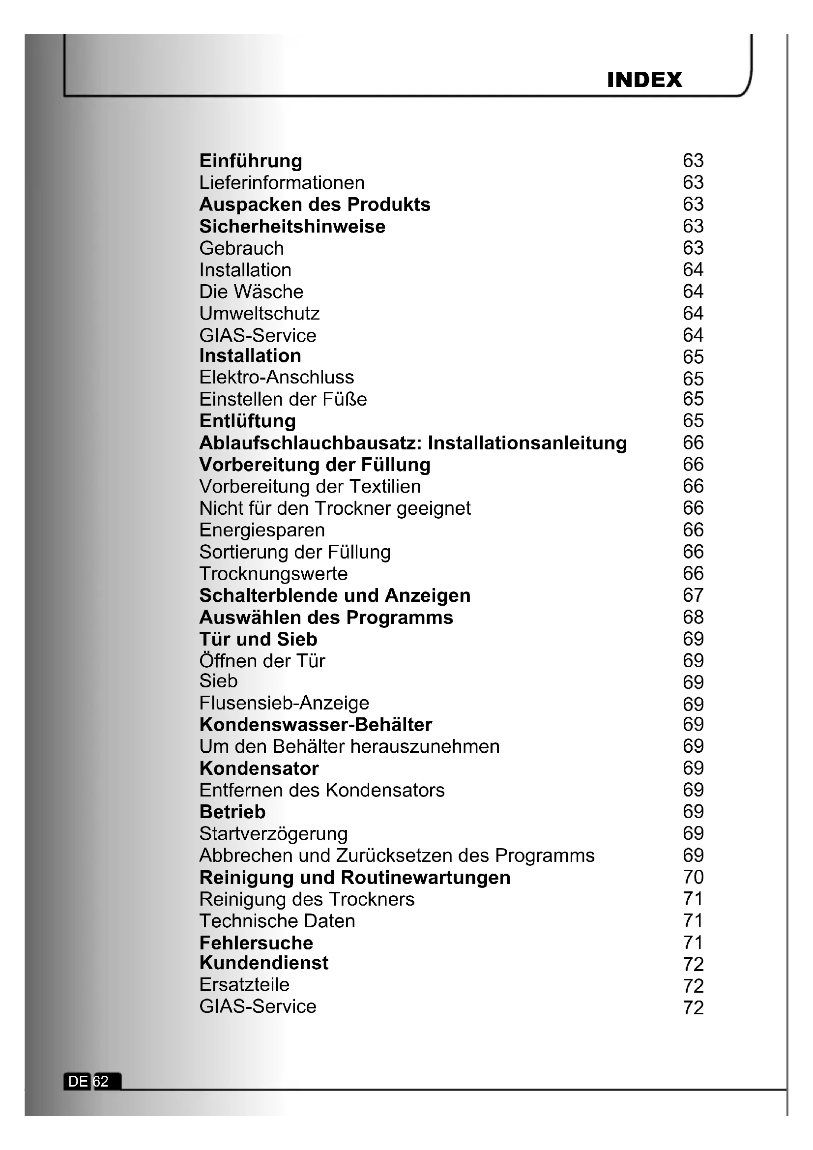 Ricambi Servizio GIAS IT 61INDEX Einführung Lieferinformationen Auspacken des Produkts Sicherheitshinweise Gebrauch Installation Die Wäsche Umweltschutz GIAS-Service Installation Elektro-Anschluss Einstellen der Füße Entlüftung Ablaufschlauchbausatz: Installationsanleitung Vorbereitung der Füllung Vorbereitung der Textilien Nicht für den Trockner geeignet Energiesparen Sortierung der Füllung Trocknungswerte Schalterblende und Anzeigen Auswählen des Programms Tür und Sieb Öffnen der Tür Sieb Flusensieb-Anzeige Kondenswasser-Behälter Um den Behälter herauszunehmen Kondensator Entfernen des Kondensators Betrieb Startverzögerung Abbrechen und Zurücksetzen des Programms Reinigung und Routinewartungen Reinigung des Trockners Technische Daten Fehlersuche Kundendienst Ersatzteile GIAS-Service DE 62
