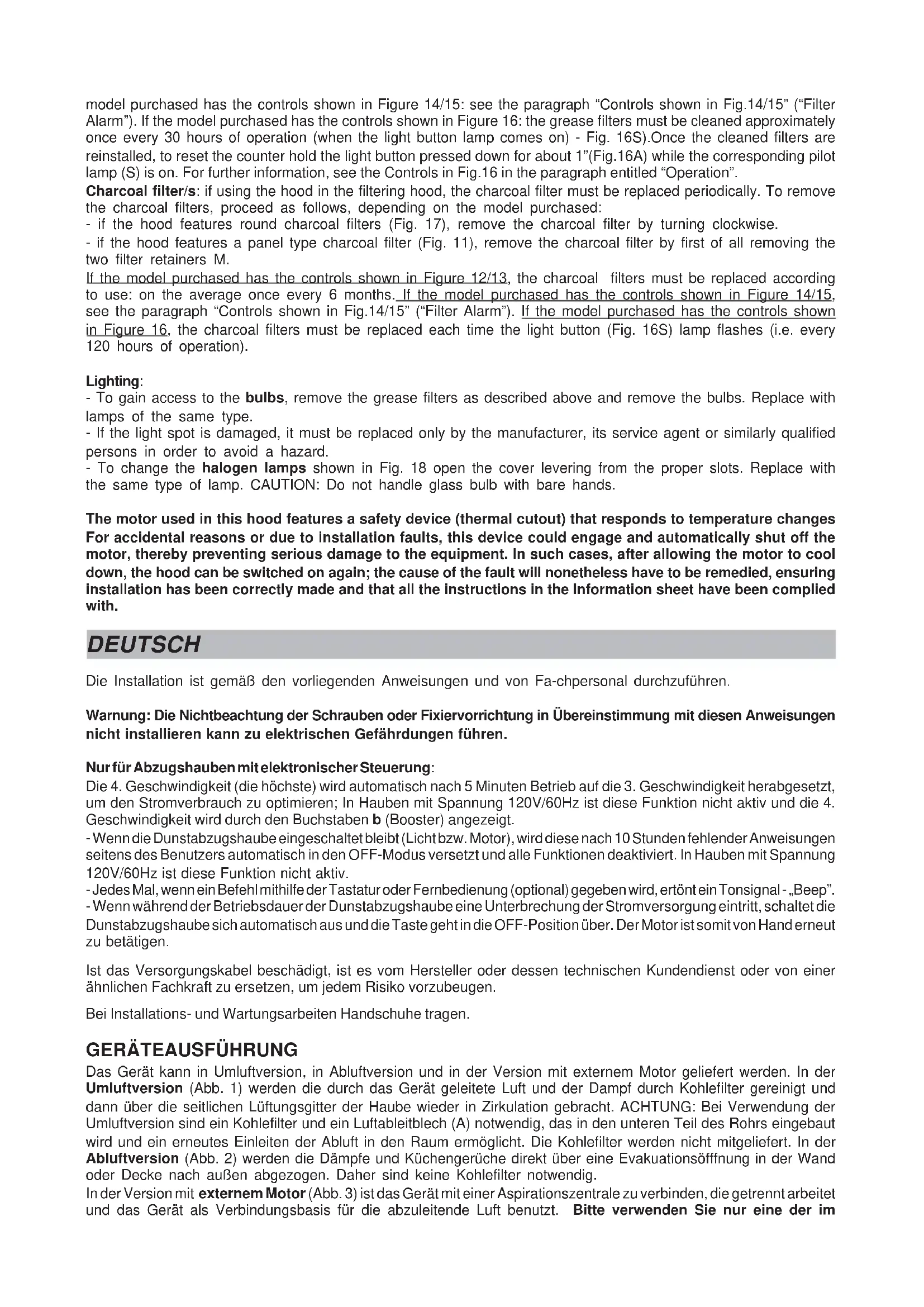 Vor den Montageoperationen muß/müssen zur leichteren Handhabung des Geräts die Fettfilter entfernt werden: Den Festhalter in der Nähe des Griffs nach innen drücken und den Filter nach unten ziehen (Abb. 4). Befestigung an der Wand (Abb. 5): Benutzen Sie die Bohrschablone, um die Dübel in der Wand anzubringen, wobei der Abstand zwischen der Haube und dem Kochfeld mindestens 65 cm betragen muß. Nun kann das Gerät mit den Schlüssellochöffnungen in der Geräterückwand in die Schrauben eingehängt werden (die Oeffnungen A benutzen; wenn in der Haube die Oeffnungen A und C vorhanden sind, dann muessen nur die Oeffnungen C benutzt werden). Zusätzlich wird das Gerät durch die Sicherungslöcher fest mit der Wand verschraubt (B). Um das Gerät nicht zu beschädigen, dürfen nur die vom Hersteller vorgesehenen Bohrungen benutzt werden. Befestigung der Teleskoprohre: Mindestanforderungen für die Montage: – Stromversorgungsanschluß innerhalb der Außenabmessungen des Teleksoprohres vornehmen. – Wird ein Gerät in Abluftversion oder in der Version mit externem Motor installiert, ist eine Luftaustrittsöffnung vorzusehen. Positionieren Sie die Halterung (W) 50 mm von der Decke entfernt, vertikal oberhalb der Haube unter Zuhilfenahme der Schlitze in der Mitte der Halterung (Abb. 6). Markieren Sie mit einem Filzstift die beiden Bohrlöcher an der Wand. Führen Sie die Bohrungen aus und stecken Sie die mitgelieferten Dübel in die Bohrlöcher. Befestigen Sie die Halterung mit den beiden mitgelieferten Schrauben. Abluftversion und Version mit externem Motor: Das Luftabführungsrohr an die Austrittsöffnung der Haube anschließen; dazu einen Schlauch verwenden und ihn an der Luftaustrittsöffnung der Haube mit einer Metallschelle befestigen (Schlauch und Schelle werden nicht mitgeliefert). Nur bei der Version mit externem Motor (Abb. 7) wird die Haube über die entsprechenden Klemmleisten elektrisch mit der externen Zentrale verbunden: Entfernen Sie den Kabelfeststeller A und den Deckel B vom Anschlußkasten. Befestigen Sie das Verbindungskabel der Zentrale an der Klemmleiste C. Den Kabelfeststeller A und den Deckel B des Schaltkastens wieder montieren. Das andere Kabelende ist an der Klemmleiste der externen Zentrale zu befestigen. Schließen Sie die Haube mittels Stromkabel an die Stromversorgung an. Legen Sie die beiden vormontierten Rohre auf den vorderen Teil der Haube. Heben Sie das obere Rohr bis zur Decke an und bestigen Sie es mittels 2 Schrauben an der Halterung (Abb. 8). Umluftversion: Schließen Sie die Haube mittels Stromkabel an die Stromversorgung an. Befestigen Sie das Ableitblech an dem unteren Rohr wie in Abbildung 9 gezeigt. Benutzen Sie hierzu 2 Schrauben. Legen Sie die beiden vormontierten Rohre auf den vorderen Teil der Haube. Heben Sie das obere Rohr bis zur Decke an und bestigen Sie es mittels 2 Schrauben an der Halterung (Abb. 8). Beachten Sie, dass bei der Umluftversion der Gebrauch von Kohlefiltern erforderlich ist; uberprüfen Sie, ob die Filter bereits installiert sind; falls erforderlich, montieren Sie diese wie nachstehend beschrieben ist, entsprechend dem von Ihnen erworbenen Modell: - wenn die Haube mit runden Kohlefiltern ausgestattet ist (Abb. 10), hängen Sie den Kohlefilter durch Drehen desselben im Gegenuhrzeigersinn ein. - wenn die Haube mit einem Kohlefilterpaneel ausgestattet ist (Abb. 11), entfernen Sie die beiden Metallfilterhalter (M) und positionieren Sie den Kohlenfilter im Innern des Fettfilter; setzen Sie anschließend die beiden Festhalter wieder ein, um den Kohlefilter zu arretieren. FUNKTIONSWEISE Je nach Version ist das Gerät mit folgenden Bedienung ausgestattet: Bedienung gemäß Abb. 12: Taste A: Beleuchtung. Taste B: Ein- (erste Betriebstufe), Aus- Schalter. Taste C: zweite Betriebstufe. Taste D: dritte Betriebstufe. E: Motorkontrolleuchte. EINIGE MODELLE SIND OHNE DAS MOTORKONTROLLEUCHTE (E). Bedienung gemäß Abb. 13: Taste A: Schalter für die Beleuchtung; Stellung 0: Beleuchtung aus; Stellung 1: Beleuchtung ein. Taste B: Motorschalter; Stellung 0: Motor aus; Stellung 1-2-3: erste, zweite und dritte Schaltstufe. C: Led Motorbetrieb. Bedienung gemäß Abb. 14: Taste A: LICHT einschalten. Taste B: LICHT ausschalten. Taste C: Drosselt die Geschwindigkeit auf ein Minimum. Bei 2 Sek. langem Drücken wird der Motor abgeschaltet. Taste D: Betätigung des Motors (mit der zuletzt verwendeten Geschwindigkeit) und Erhöhen der Geschwindigkeit bis zum Maximum. Taste E: RESET FILTERALARM / TIMER: Wird diese Taste während der Anzeige des Filteralarms (bei abgeschaltetem Motor) gedrückt, wird der Stundenzähler nullgestellt. Wird die Taste hingegen bei laufendem Motor gedrückt, wird der TIMER aktiviert, der die Abzughaube nach 5 Minuten automatisch abschaltet. L1) Die vier GRÜNEN LEDs zeigen die momentane Geschwindigkeit an. L2) Wenn die LED rot ist (bei abgeschaltetem Motor), zeigt sie FILTERALARM an. Wenn die LED grün ist und blinkt, zeigt sie an, dass der TIMER über die Taste E aktiviert worden ist. FILTERALARM: Nach einer Betriebszeit von 30h leuchtet LED L2 stets ROT, um anzuzeigen, dass die Fettfilter gereinigt werden müssen. Nach einer Betriebszeit von 120h blinkt LED L2 ROT, um anzuzeigen, dass die Fettfilter gereinigt und die Kohlenfilter ausgetauscht werden müssen. Nach der Reinigung den Fettfiltern (und/oder dem Austausch der Kohlenfilter)ist zur Rückstellung des Stundenzählers die Taste E (RESET) während der Anzeige des Filteralarms zu drücken. Bedienung gemäß Abb. 15: Taste A: Beleuchtung ausschalten; Taste B: Beleuchtung einschalten; Taste C: Vermindert die Motorgeschwindigkeit bis zur Mindestgeschwindigkeit. Bei Betätigung für 2" schaltet sich der Motor aus. Durch Betätigung für 2" wird bei ausgelöstem Filteralarm der Stundenzähler auf null gestellt. Taste D: Schaltet den Motor ein und erhöht die Geschwindigkeit des Motors bis zur Höchstgeschwindigkeit. Taste E: Aktiviert/deaktiviert den Sensor (AUTOMATISCHER