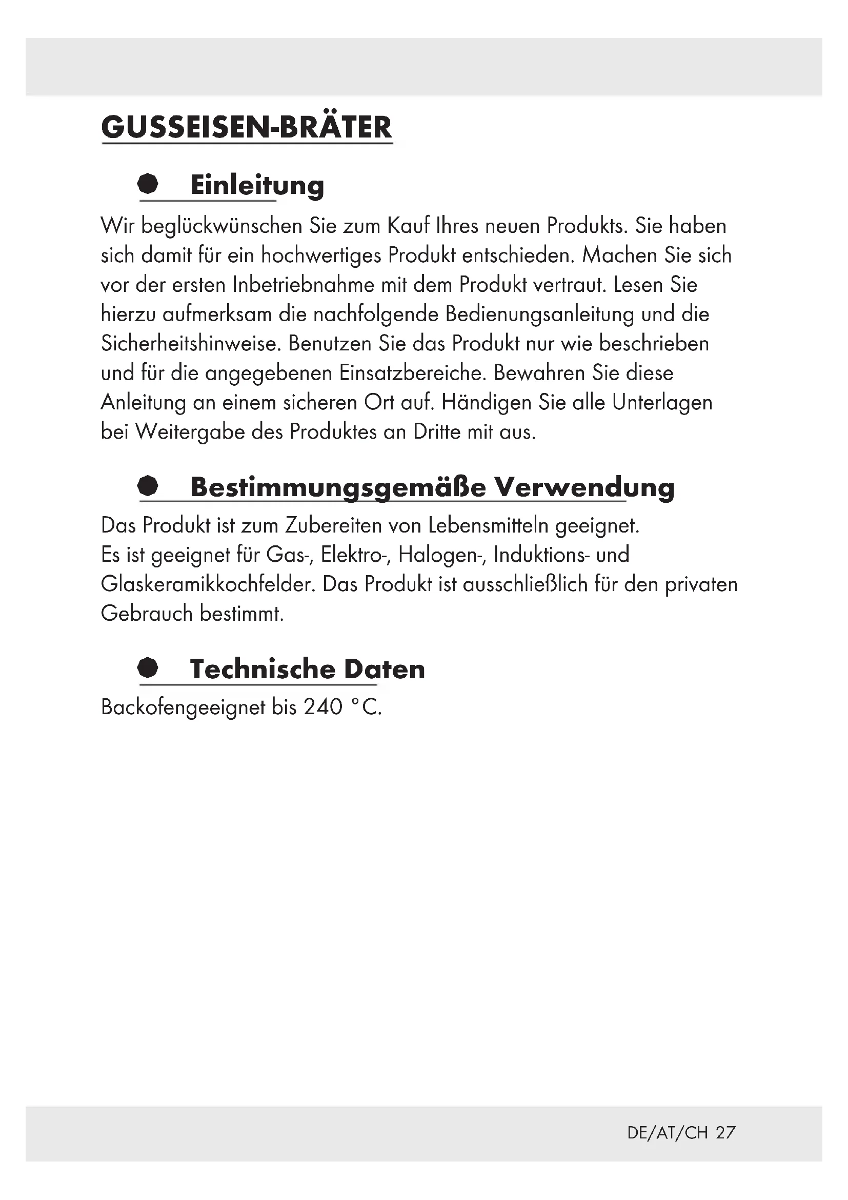 Bitte beachten Sie, dass die Griffe beim Kochen heiß werden können. Verwenden Sie daher zu Ihrem Schutz Topflappen oder Grillhandschuhe. Stellen Sie das heiße Produkt immer auf einem hitzebeständigen Untersatz ab und nicht auf die ungeschützte Arbeitsfläche. Beim Kochen ist es sehr wichtig, dass Sie das Produkt, in dem Fett erhitzt wird, nicht aus den Augen lassen. Fett kann sich schnell überhitzen und entzünden. Wenn das Fett einmal brennen sollte, löschen Sie es niemals mit Wasser! Ersticken Sie die Flammen mit einem Deckel oder einer dichten Wolldecke. Achten Sie darauf, das Produkt nicht in leerem Zustand zu erwärmen. Es kann sonst zu Absplitterung der Emaille kommen. Um die Emaillebeschichtung nicht zu beschädigen, verwenden Sie nur Küchenhelfer aus hitzebeständigem Kunststoff oder Holz. Schneiden Sie das Gargut nicht direkt im Produkt. Legen Sie kein tropfnasses Fleisch in heißes Fett. Durch das auf eine glühende Herdplatte spritzende Fett kann leicht ein Brand entstehen. Achtung! Heben Sie das Produkt immer an, wenn Sie auf Herdplatten mit Glasoberfläche (z. B. Glaskeramik-, Halogen-, Induktionskochfelder) oder im Ofen kochen. Schieben Sie das Produkt NIEMALS auf solchen Oberflächen, weil dies die Unterseite des Produkts, des Kochfelds oder des Ofen beschädigen könnte. Gasflammen müssen immer der Grundfläche des Produkts angepasst werden und dürfen NIE über die Seitenwände hinaus brennen. Das Produkt ist nicht mikrowellengeeignet.29 DE/AT/CH Das Produkt ist backofengeeignet! Stellen Sie das Produkt auf den dafür vorgesehenen Rost und nicht auf den Ofenboden. Das Produkt ist nicht spülmaschinengeeignet. Verwenden Sie den Deckel nicht, wenn der Griff lose ist. Ziehen Sie ggf. die Verschraubung am Deckel nach.