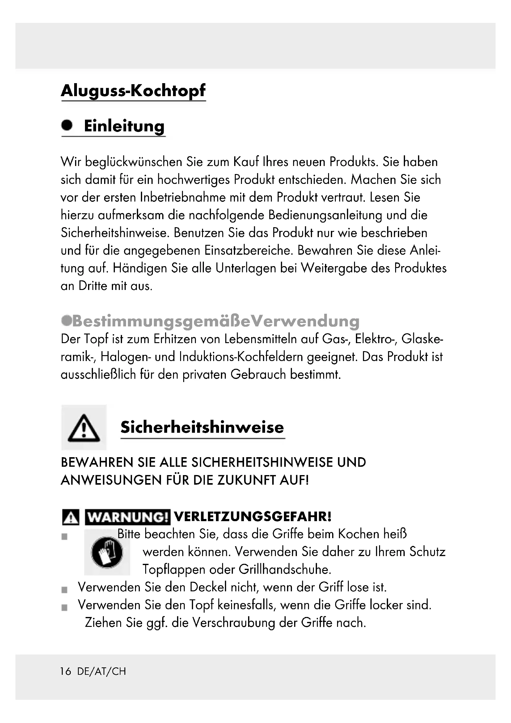 ANWEISUNGEN FÜR DIE ZUKUNFT AUF! VERLETZUNGSGEFAHR! Bitte beachten Sie, dass die Griffe beim Kochen heiß werden können. Verwenden Sie daher zu Ihrem Schutz Topflappen oder Grillhandschuhe. Verwenden Sie den Deckel nicht, wenn der Griff lose ist. Verwenden Sie den Topf keinesfalls, wenn die Griffe locker sind. Ziehen Sie ggf. die Verschraubung der Griffe nach.17 DE/AT/CH GEFAHR DER SACHBESCHÄDIGUNG! Beim Kochen ist es sehr wichtig, dass Sie Töpfe und Pfannen, in denen Fett erhitzt wird, nicht aus den Augen lassen. Fett kann sich schnell überhitzen und entzünden. Wenn das Fett einmal brennen sollte, löschen Sie es niemals mit Wasser! Ersticken Sie die Flammen mit einem Topfdeckel oder einer dichten Wolldecke. Um die Antihaftbeschichtung nicht zu beschädigen, verwenden Sie nur Küchenhelfer aus hitzebeständigem Kunststoff oder Holz. Schneiden Sie das Gargut nicht direkt im Topf. Legen Sie kein tropfnasses Fleisch in heißes Fett. Durch das auf eine glühende Herdplatte spritzende Fett kann leicht ein Brand entstehen. Wählen Sie die dem Durchmesser des Topfbodens entsprechende Kochplatte aus, um einen Hitzeverlust zu vermeiden. Der Artikel ist zum Warmhalten von Speisen im Backofen geeignet (max. 150 °C für 1 Stunde). Hohe Temperaturen können zu Verfärbungen an der Außenseite des Produkts führen. Dies ist kein Materialfehler und beeinträchtigt nicht die Qualität oder Funktion des Produkts. Das heiße Produkt niemals unter laufendes kaltes Wasser halten. Die Unterseite des Produkts könnte dadurch beschädigt werden oder vom Produkt abfallen. Das Produkt ist für die Spülmaschine geeignet. Die häufige Reinigung mit scharfen Reinigungsmitteln kann zu einer Beschädigung und / oder Verfärbung des Topfes führen. Die Reinigung in der Spülmaschine kann zu Verfärbungen der Aluminium-Teile führen. ACHTUNG! Der Glasdeckel ist zerbrechlich / nicht stoßfest! Beim Spülen von Hand reinigen Sie den Topf mit heißem Wasser und handelsüblichem Spülmittel. Vermeiden Sie dabei den Gebrauch von scharfen und spitzen Gegenständen, um das Material nicht zu beschädigen.18 DE/AT/CH Ziehen oder schieben Sie das Produkt nicht über die Glaskeramik- und Halogen-Kochfelder. Bei Nichtbeachtung kann es zu Beschädi- gungen durch Kratzer kommen. Bitte beachten Sie, dass es bei der Verwendung dieses Produkts aufgrund der hellen Farbe zu leichten Verfärbungen kommen kann. Diese Verfärbungen sind als Gebrauchsspuren anzusehen und stellen keine Beeinträchtigung der Qualität der Beschichtung und ihrer Gebrauchstauglichkeit dar. Hinweis für Induktionskochfelder Hinweis: Unter bestimmten Umständen kann ein Geräusch auf- treten, dass auf die elektromagnetischen Eigenschaften der Heiz- quelle und des Topfs / der Pfanne zurückzuführen ist. Dies ist normal und deutet nicht auf einen Defekt Ihres Induktions- kochfeldes oder des Kochgeschirrs hin. Der Topf / die Pfanne ist mittig auf dem Induktionskochfeld anzu- ordnen. ACHTUNG! Hohe Aufheizgeschwindigkeit! Kochgeschirr beim Vorheizen nicht überhitzen. Im Fall einer Überhitzung, muss der Raum gründlich gelüftet werden. Gebrauch Bitte entfernen Sie vor dem ersten Gebrauch eventuelle Aufkleber von dem Artikel und spülen Sie ihn mit heißem Wasser aus. Kochen Sie den Topf vor dem ersten Gebrauch 2 bis 3 mal mit Wasser aus, um eventuelle Produktionsrückstände vollständig zu entfernen. Leeren oder mit Bratgut gefüllten Topf nicht überhitzen, da sonst der Antihafteffekt nachlässt, bzw. die Beschichtung beschädigt wird.19 DE/AT/CH Entsorgung Die Verpackung besteht aus umweltfreundlichen Materialien, die Sie über die örtlichen Recyclingstellen entsorgen können. Möglichkeiten zur Entsorgung des ausgedienten Produktes erfahren Sie bei Ihrer Gemeinde- oder Stadtverwaltung. Garantie Das Produkt wurde nach strengen Qualitätsrichtlinien sorgfältig produzier