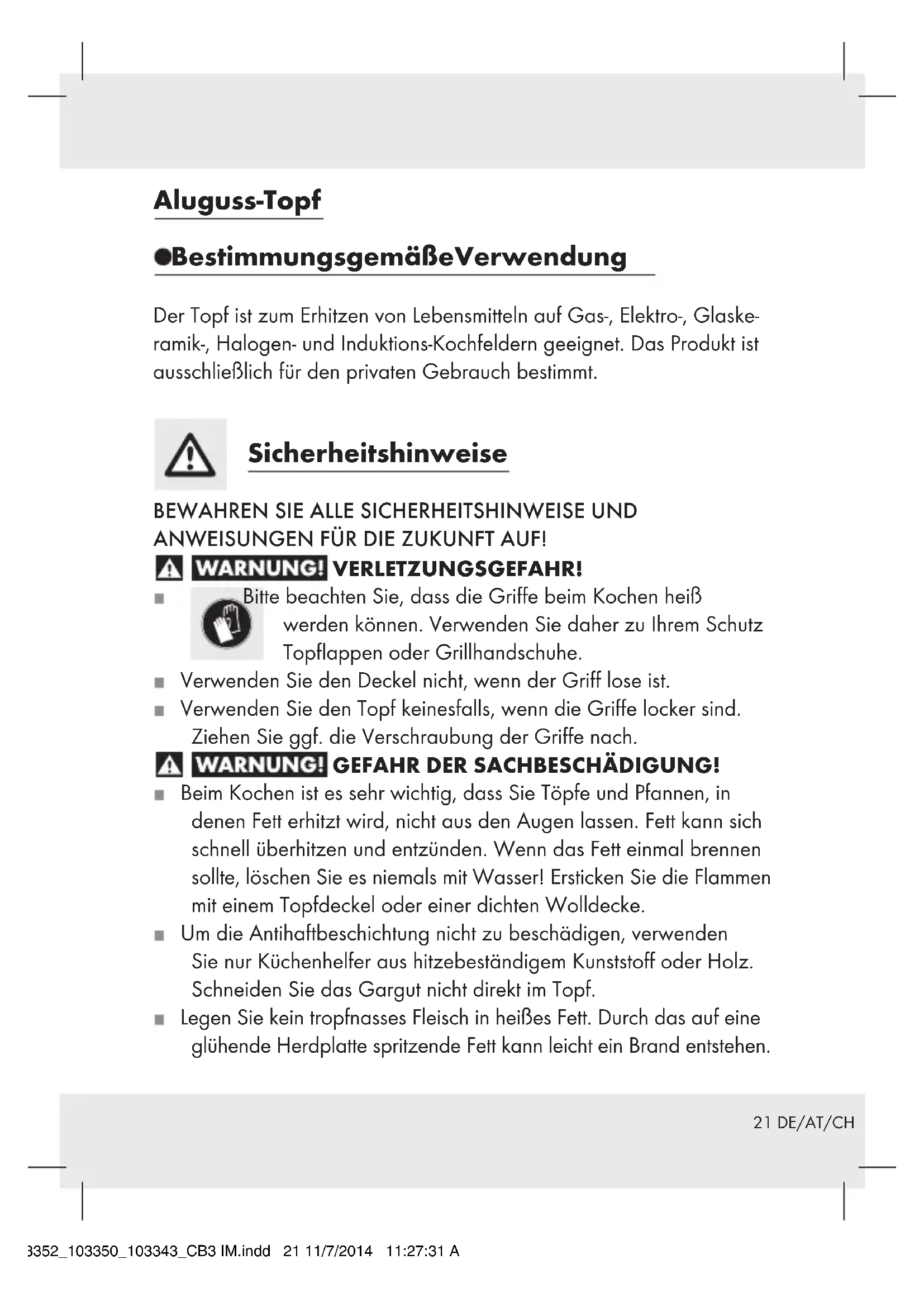 ANWEISUNGEN FÜR DIE ZUKUNFT AUF! VERLETZUNGSGEFAHR! Bitte beachten Sie, dass die Griffe beim Kochen heiß werden können. Verwenden Sie daher zu Ihrem Schutz Topflappen oder Grillhandschuhe. Verwenden Sie den Deckel nicht, wenn der Griff lose ist. Verwenden Sie den Topf keinesfalls, wenn die Griffe locker sind. Ziehen Sie ggf. die Verschraubung der Griffe nach. GEFAHR DER SACHBESCHÄDIGUNG! Beim Kochen ist es sehr wichtig, dass Sie Töpfe und Pfannen, in denen Fett erhitzt wird, nicht aus den Augen lassen. Fett kann sich schnell überhitzen und entzünden. Wenn das Fett einmal brennen sollte, löschen Sie es niemals mit Wasser! Ersticken Sie die Flammen mit einem Topfdeckel oder einer dichten Wolldecke. Um die Antihaftbeschichtung nicht zu beschädigen, verwenden Sie nur Küchenhelfer aus hitzebeständigem Kunststoff oder Holz. Schneiden Sie das Gargut nicht direkt im Topf. Legen Sie kein tropfnasses Fleisch in heißes Fett. Durch das auf eine glühende Herdplatte spritzende Fett kann leicht ein Brand entstehen. 103352_103350_103343_CB3 IM.indd 21 11/7/2014 11:27:31 AM22 DE/AT/CH Wählen Sie die dem Durchmesser des Topfbodens entsprechende Kochplatte aus, um einen Hitzeverlust zu vermeiden. Der Artikel ist zum Warmhalten von Speisen im Backofen geeignet (max. 180 °C für 1 Stunde). Das Produkt ist für die Spülmaschine geeignet. Die häufige Reinigung mit scharfen Reinigungsmitteln kann zu einer Beschädigung und / oder Verfärbung des Topfes führen. Die Reinigung in der Spülmaschine kann zu Verfärbungen der Aluminium-Teile führen. ACHTUNG! Der Glasdeckel ist zerbrechlich / nicht stoßfest! Beim Spülen von Hand reinigen Sie den Topf mit heißem Wasser und handelsüblichem Spülmittel. Vermeiden Sie dabei den Gebrauch von scharfen und spitzen Gegenständen, um das Material nicht zu beschädigen. Ziehen oder schieben Sie das Produkt nicht über die Glaskeramik- und Halogen-Kochfelder. Bei Nichtbeachtung kann es zu Beschädi- gungen durch Kratzer kommen. Bitte beachten Sie, dass es bei der Verwendung dieses Produkts aufgrund der hellen Farbe zu leichten Verfärbungen kommen kann. Diese Verfärbungen sind als Gebrauchsspuren anzusehen und stel- len keine Beeinträchtigung der Qualität der Beschichtung und ihrer Gebrauchstauglichkeit dar. P Hinweis für Induktionskochfelder J Hinweis: Unter bestimmten Umständen kann ein Geräusch auftreten, dass auf die elektromagnetischen Eigenschaften der Heizquelle und des Topfs / der Pfanne zurückzuführen ist. J Dies ist normal und deutet nicht auf einen Defekt Ihres Induktionskochfeldes oder des Kochgeschirrs. J Der Topf / die Pfanne ist mittig auf dem Induktionskochfeld 103352_103350_103343_CB3 IM.indd 22 11/7/2014 11:27:31 AM23 DE/AT/CH anzuordnen. J ACHTUNG! Hohe Aufheizgeschwindigkeit! Kochgeschirr beim Vorheizen nicht überhitzen. J Im Fall einer Überhitzung, muss der Raum gründlich gelüftet werden. Gebrauch Bitte entfernen Sie vor dem ersten Gebrauch eventuelle Aufkleber von dem Artikel und spülen Sie ihn mit heißem Wasser aus. Kochen Sie den Topf vor dem ersten Gebrauch 2 bis 3 mal mit Wasser aus, um eventuelle Produktionsrückstände vollständig zu entfernen. Leeren oder mit Bratgut gefüllten Topf nicht überhitzen, da sonst der Antihafteffekt nachlässt, bzw. die Beschichtung beschädigt wird. Entsorgung Die Verpackung besteht aus umweltfreundlichen Materialien, die Sie über die örtlichen Recyclingstellen entsorgen können. Möglichkeiten zur Entsorgung des ausgedienten Produktes erfahren Sie bei Ihrer Gemeinde- oder Stadtverwaltung. 103352_103350_103343_CB3 IM.indd 23 11/7/2014 11:27:31 AMOWIM GmbH & Co. KG Stiftsbergstraße 1 D-74167 Neckarsulm