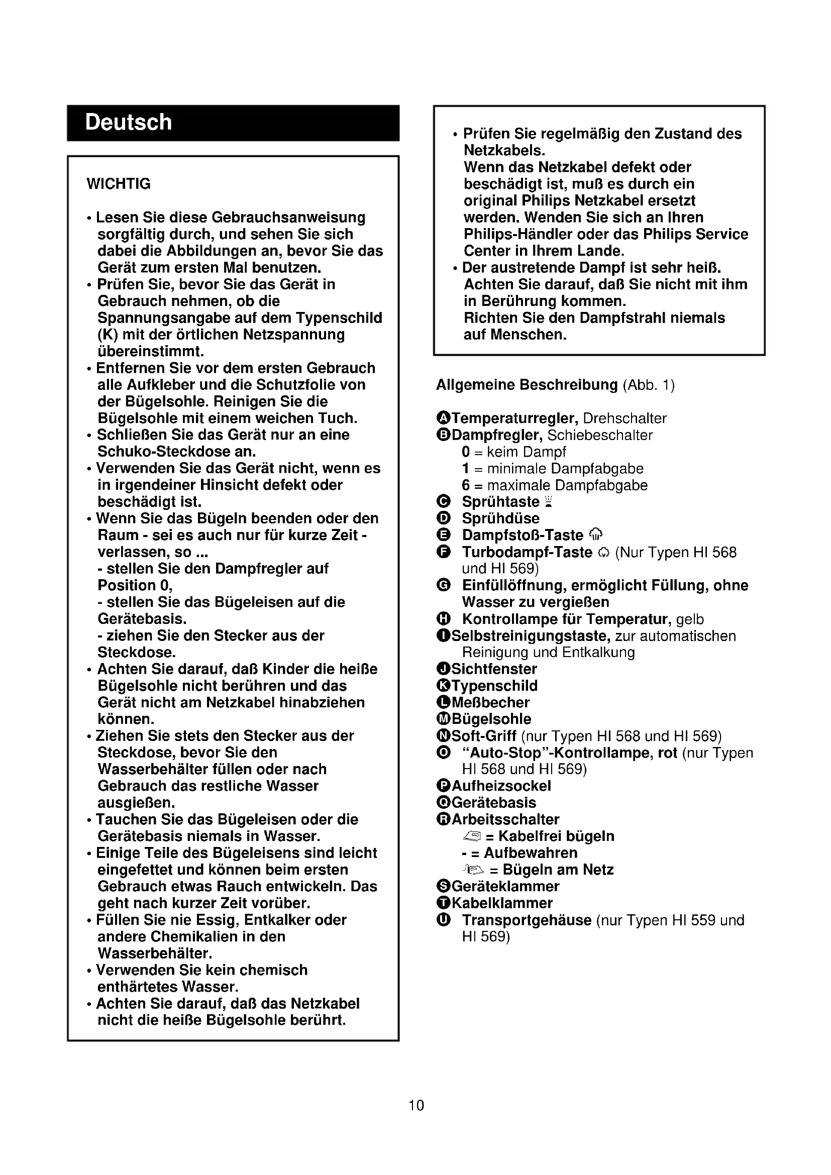 CLICKDeutsch Allgemeine Beschreibung (Abb. 1) A Temperaturregler, Drehschalter B Dampfregler, Schiebeschalter 0 = keim Dampf 1 = minimale Dampfabgabe 6 = maximale Dampfabgabe C Sprühtaste T D Sprühdüse E Dampfstoß-Taste 9 F Turbodampf-Taste 0 (Nur Typen HI 568 und HI 569) G Einfüllöffnung, ermöglicht Füllung, ohne Wasser zu vergießen H Kontrollampe für Temperatur, gelb I Selbstreinigungstaste, zur automatischen Reinigung und Entkalkung J Sichtfenster K Typenschild L Meßbecher M Bügelsohle N Soft-Griff (nur Typen HI 568 und HI 569) O “Auto-Stop”-Kontrollampe, rot (nur Typen HI 568 und HI 569) P Aufheizsockel Q Gerätebasis R Arbeitsschalter ∫ = Kabelfrei bügeln - = Aufbewahren ª = Bügeln am Netz S Geräteklammer T Kabelklammer U Transportgehäuse (nur Typen HI 559 und HI 569)