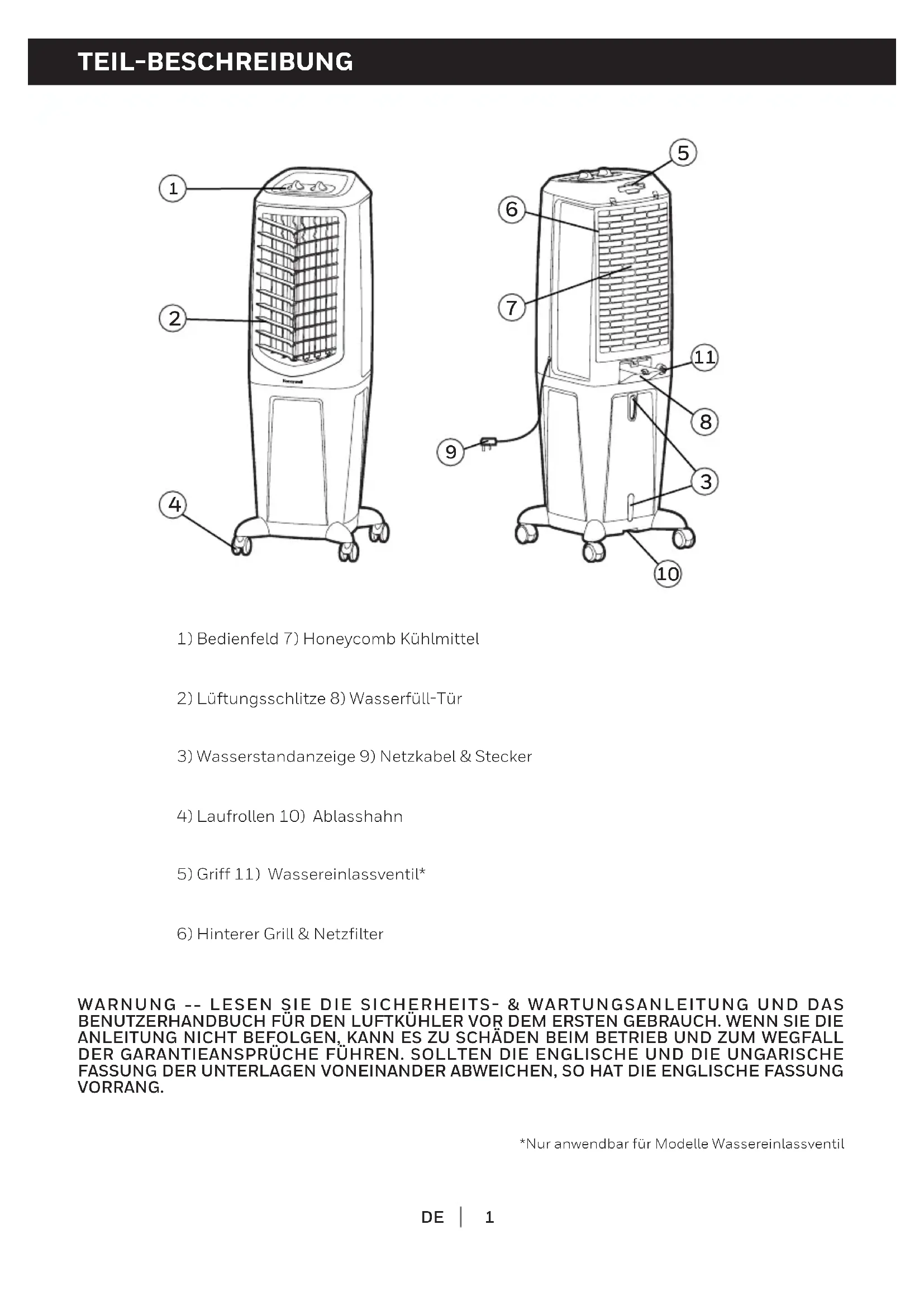*Nur anwendbar für Modelle Wassereinlassventil WARNUNG -- LESEN SIE DIE SICHERHEITS & WARTUNGSANLEITUNG UND DAS BENUTZERHANDBUCH FÜR DEN LUFTKÜHLER VOR DEM ERSTEN GEBRAUCH. WENN SIE DIE ANLEITUNG NICHT BEFOLGEN, KANN ES ZU SCHÄDEN BEIM BETRIEB UND ZUM WEGFALL DER GARANTIEANSPRÜCHE FÜHREN. SOLLTEN DIE ENGLISCHE UND DIE UNGARISCHE FASSUNG DER UNTERLAGEN VONEINANDER ABWEICHEN, SO HAT DIE ENGLISCHE FASSUNG VORRANG.