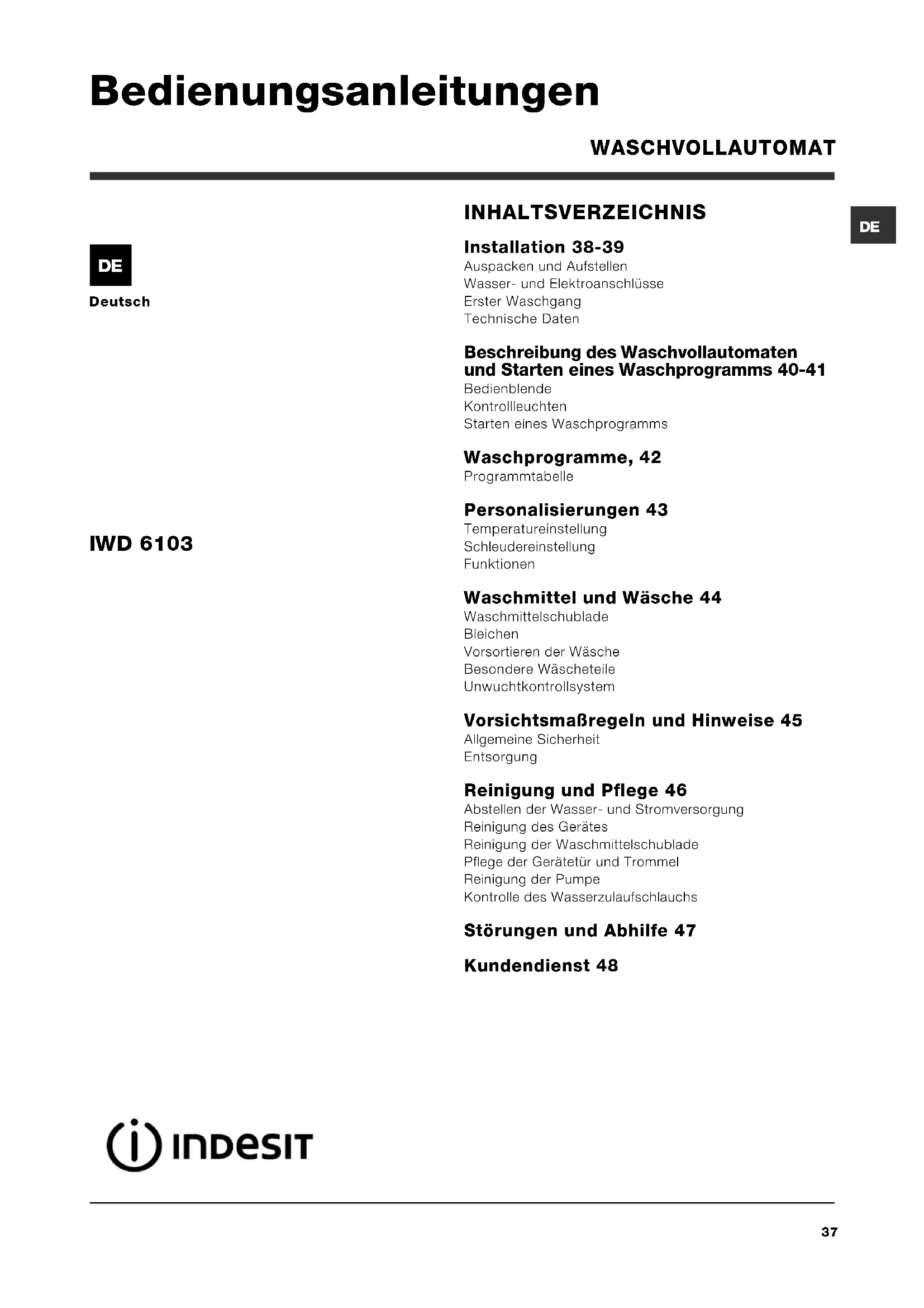 Deutsch INHALTSVERZEICHNIS Installation 38-39 Auspacken und Aufstellen Wasser- und Elektroanschlüsse Erster Waschgang Technische Daten Beschreibung des Waschvollautomaten und Starten eines Waschprogramms 40-41 Bedienblende Kontrollleuchten Starten eines Waschprogramms Waschprogramme, 42 Programmtabelle Personalisierungen 43 Temperatureinstellung Schleudereinstellung Funktionen Waschmittel und Wäsche 44 Waschmittelschublade Bleichen Vorsortieren der Wäsche Besondere Wäscheteile Unwuchtkontrollsystem Vorsichtsmaßregeln und Hinweise 45 Allgemeine Sicherheit Entsorgung Reinigung und Pflege 46 Abstellen der Wasser- und Stromversorgung Reinigung des Gerätes Reinigung der Waschmittelschublade Pflege der Gerätetür und Trommel Reinigung der Pumpe Kontrolle des Wasserzulaufschlauchs Störungen und Abhilfe 47 Kundendienst 48