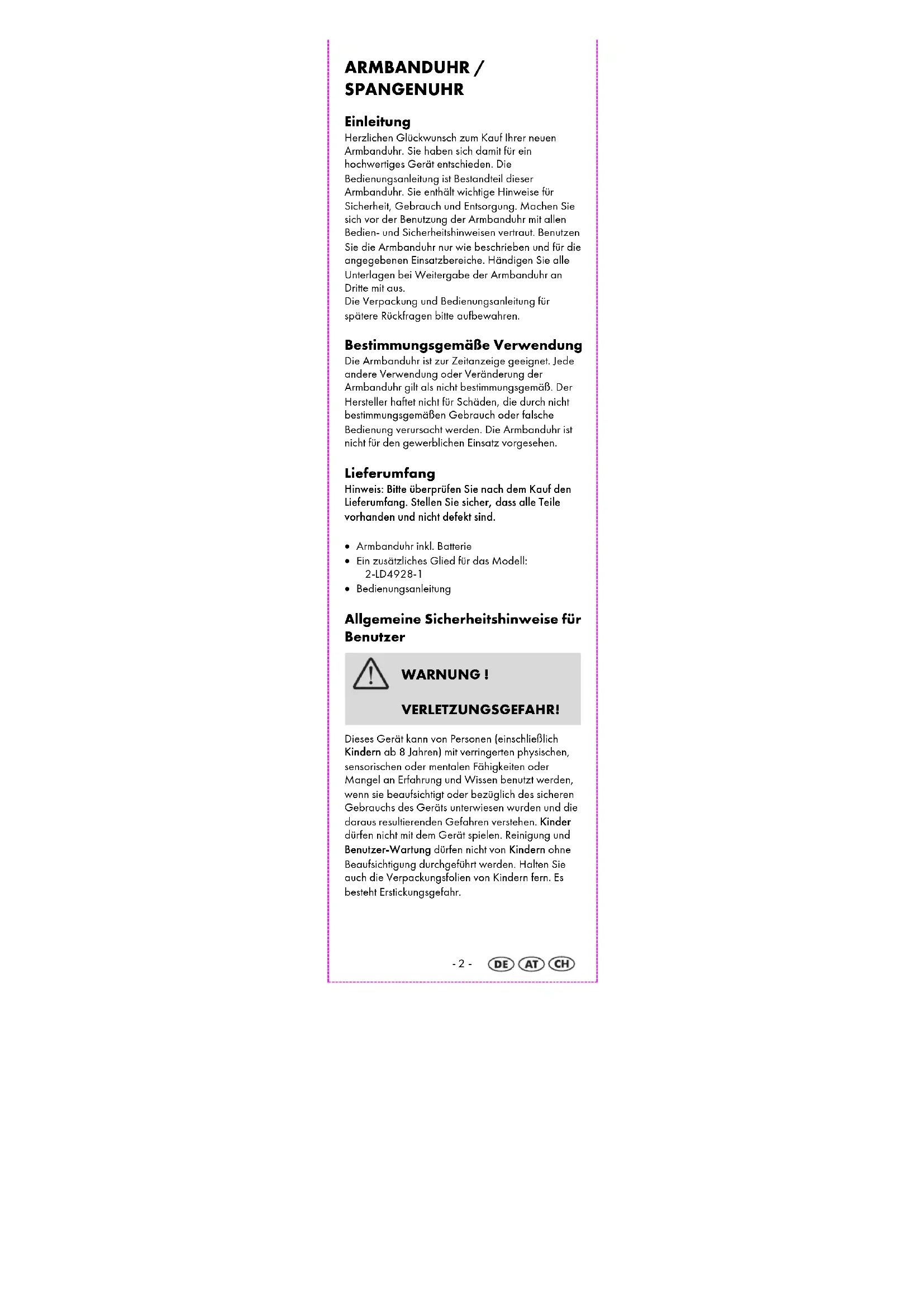 ARMBANDUHR / SPANGENUHR Einleitung Herzlichen Glückwunsch zum Kauf Ihrer neuen Armbanduhr. Sie haben sich damit für ein hochwertiges Gerät entschieden. Die Bedienungsanleitung ist Bestandteil dieser Armbanduhr. Sie enthält wichtige Hinweise für Sicherheit, Gebrauch und Entsorgung. Machen Sie sich vor der Benutzung der Armbanduhr mit allen Bedien- und Sicherheitshinweisen vertraut. Benutzen Sie die Armbanduhr nur wie beschrieben und für die angegebenen Einsatzbereiche. Händigen Sie alle Unterlagen bei Weitergabe der Armbanduhr an Dritte mit aus. Die Verpackung und Bedienungsanleitung für spätere Rückfragen bitte aufbewahren. Bestimmungsgemäße Verwendung Die Armbanduhr ist zur Zeitanzeige geeignet. Jede andere Verwendung oder Veränderung der Armbanduhr gilt als nicht bestimmungsgemäß. Der Hersteller haftet nicht für Schäden, die durch nicht bestimmungsgemäßen Gebrauch oder falsche Bedienung verursacht werden. Die Armbanduhr ist nicht für den gewerblichen Einsatz vorgesehen. Lieferumfang Hinweis: Bitte überprüfen Sie nach dem Kauf den Lieferumfang. Stellen Sie sicher, dass alle Teile vorhanden und nicht defekt sind. Armbanduhr inkl. Batterie Ein zusätzliches Glied für das Modell: 2-LD4928-1 Bedienungsanleitung Allgemeine Sicherheitshinweise für Benutzer