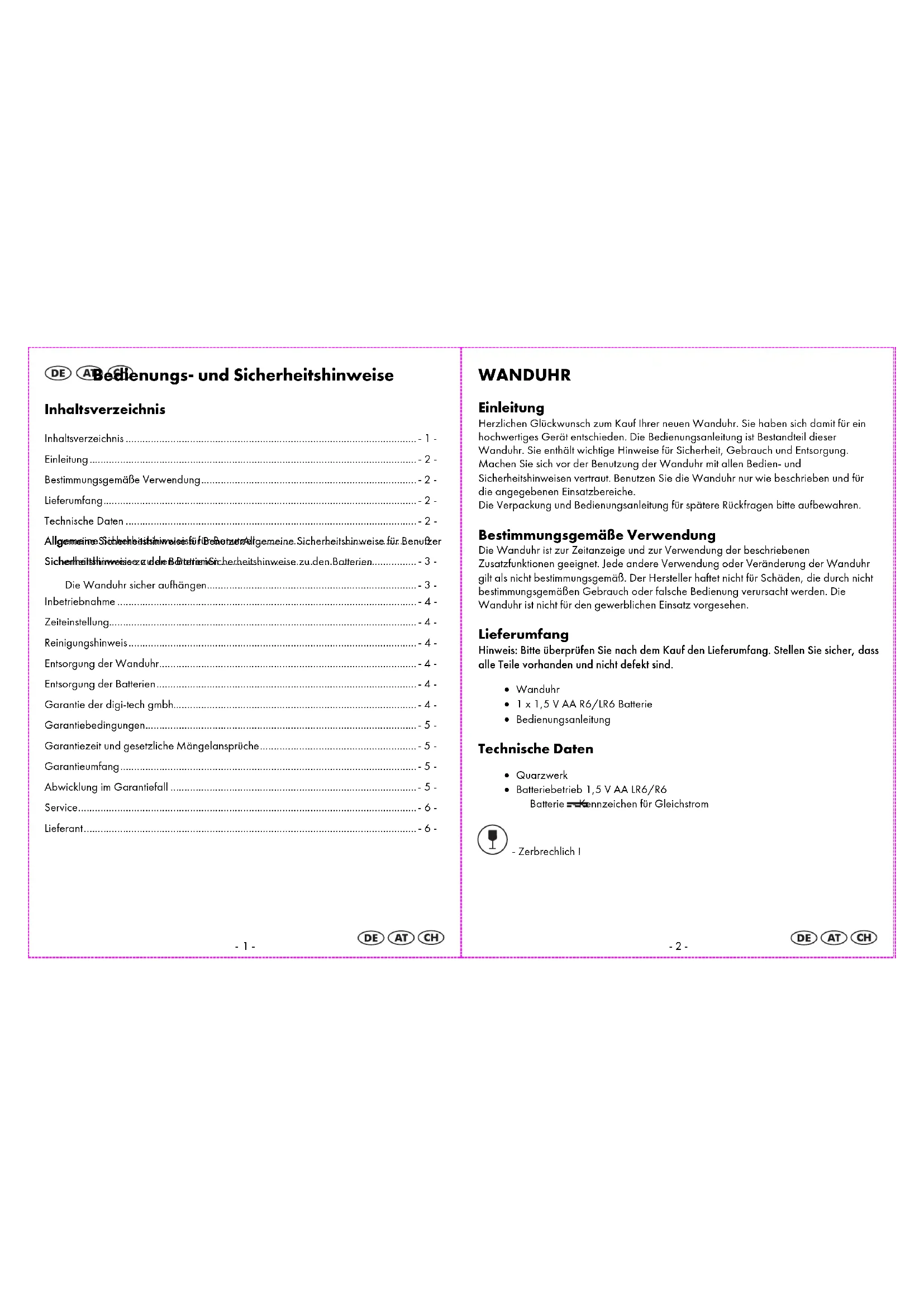 - Kerzen und andere offene Flammen zu jeder Zeit von der Wanduhr ferngehalten werden müssen, um das Ausbreiten von Feuer zu verhindern. Inbetriebnahme Setzen Sie eine 1,5 V AA R6/LR6 Batterie polrichtig in das Batteriefach auf der Rückseite der Wanduhr ein. Zeiteinstellung Drehen Sie das Einstellrädchen zum Einstellen der Uhrzeit auf der Rückseite der Wanduhr. Reinigungshinweis Reinigen Sie die Wanduhr nur mit einem trockenen, fusselfreien Tuch, wie es z.B. zur Reinigung von Brillengläsern verwendet wird. Entsorgung der Wanduhr Diese Wanduhr darf nicht im normalen Hausmüll entsorgt werden. Entsorgen Sie die Wanduhr über einen zugelassenen Entsorgungsbetrieb oder über Ihre kommunale Entsorgungseinrichtung. Beachten Sie die aktuell geltenden Vorschriften. Setzen Sie sich im Zweifelsfall mit Ihrer Entsorgungseinrichtung in Verbindung. Entsorgung der Batterien Bitte entsorgen Sie Ihre Batterien sachgerecht in extra hierfür aufgestellten Gefäßen im Handel. Batterien gehören nicht in den Hausmüll. Entsorgen Sie Batterien bitte über einen zugelassenen Entsorgungsbetrieb oder über Ihre kommunale Entsorgungseinrichtung. Beachten Sie die aktuell geltenden Vorschriften. Setzen Sie sich im Zweifelsfall mit Ihrer Entsorgungseinrichtung in Verbindung. Garantie der digi-tech gmbh Sie erhalten auf diese Wanduhr 3 Jahre Garantie ab Kaufdatum. Im Falle von Mängeln dieser Wanduhr stehen Ihnen gegen den Verkäufer des Produkts gesetzliche Rechte zu. Diese gesetzlichen Rechte werden durch unsere im Folgenden dargestellte Garantie nicht eingeschränkt.-