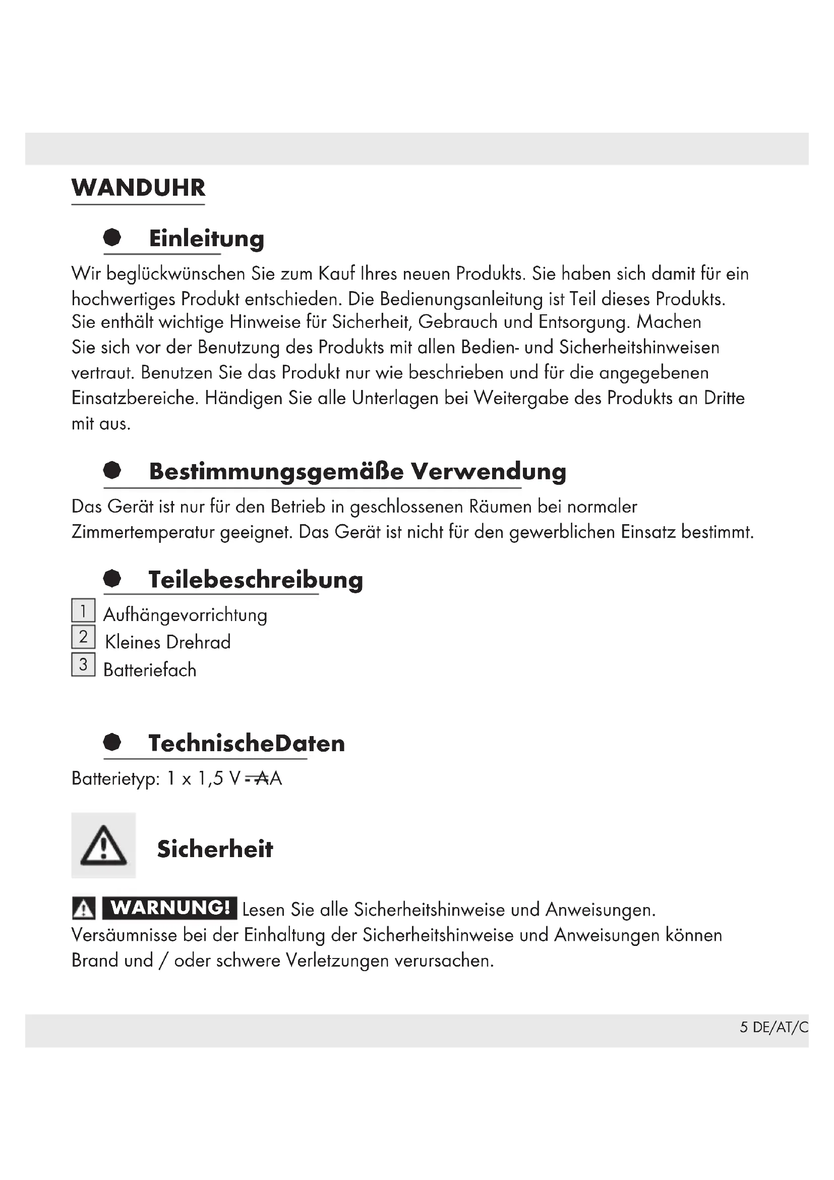 Pokyny pro obsluhu a bezpečnostní pokyny Strana 25 ES Instrucciones de utilización y de seguridad Página 30 PT Instruções de utilização e de segurança Página 352 35 DE/AT/CH WANDUHR § Einleitung Wir beglückwünschen Sie zum Kauf Ihres neuen Produkts. Sie haben sich damit für ein hochwertiges Produkt entschieden. Die Bedienungsanleitung ist Teil dieses Produkts. Sie enthält wichtige Hinweise für Sicherheit, Gebrauch und Entsorgung. Machen Sie sich vor der Benutzung des Produkts mit allen Bedien- und Sicherheitshinweisen vertraut. Benutzen Sie das Produkt nur wie beschrieben und für die angegebenen Einsatzbereiche. Händigen Sie alle Unterlagen bei Weitergabe des Produkts an Dritte mit aus. § Bestimmungsgemäße Verwendung Das Gerät ist nur für den Betrieb in geschlossenen Räumen bei normaler Zimmertemperatur geeignet. Das Gerät ist nicht für den gewerblichen Einsatz bestimmt. § Teilebeschreibung