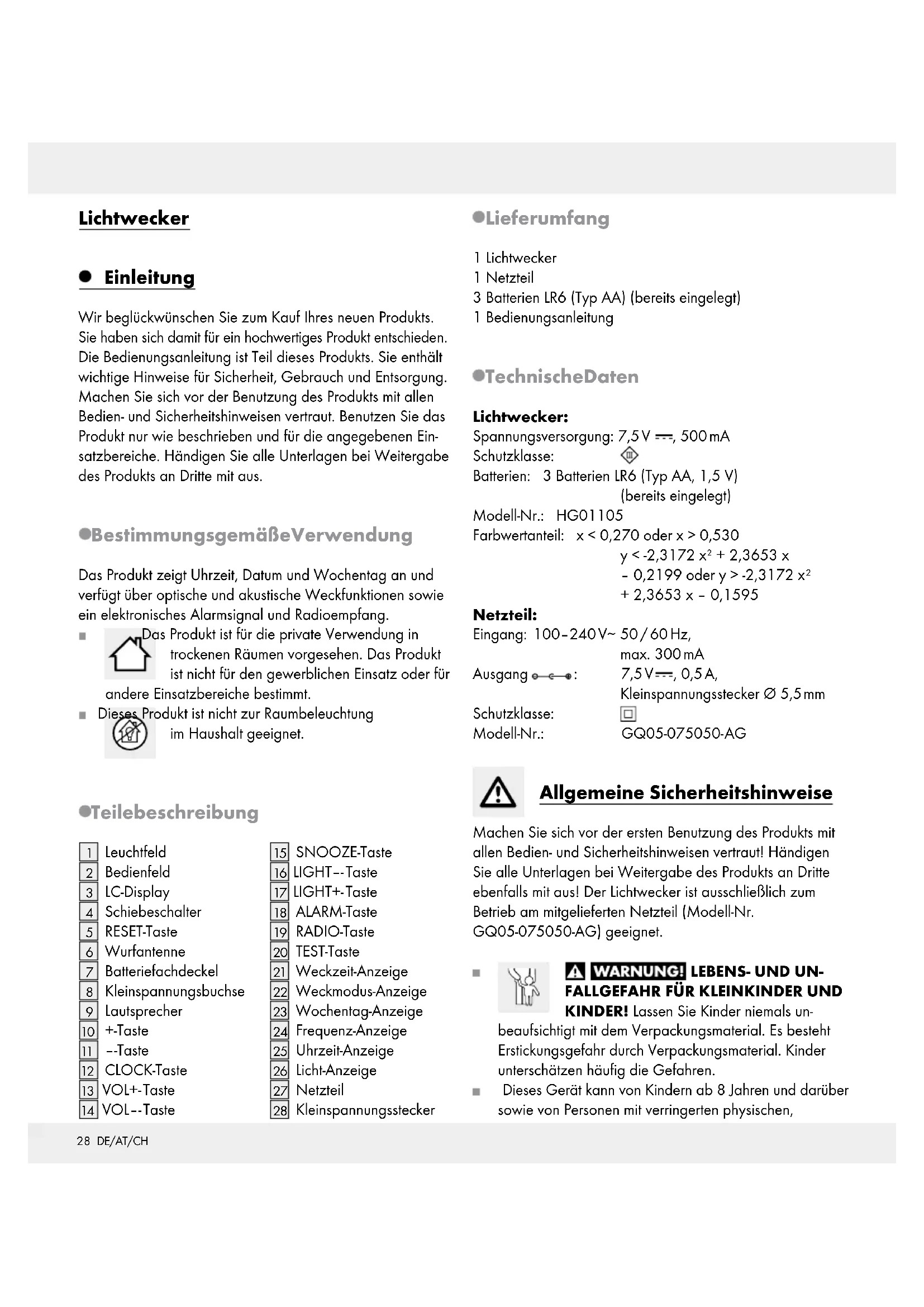 KINDER! Lassen Sie Kinder niemals un- beaufsichtigt mit dem Verpackungsmaterial. Es besteht Erstickungsgefahr durch Verpackungsmaterial. Kinder unterschätzen häufig die Gefahren. Dieses Gerät kann von Kindern ab 8 Jahren und darüber sowie von Personen mit verringerten physischen,29 DE/AT/CH sensorischen oder mentalen Fähigkeiten oder Mangel an Erfahrung und Wissen benutzt werden, wenn sie beaufsichtigt oder bezüglich des sicheren Gebrauchs des Gerätes unterwiesen wurden und die daraus resul- tierenden Gefahren verstehen. Kinder dürfen nicht mit dem Gerät spielen. Reinigung und Benutzerwartung dür- fen nicht von Kindern ohne Beaufsichtigung durch- geführt werden. Vergewissern Sie sich vor der Benutzung, dass die vorhandene Netzspannung mit der benötigten Betriebs- spannung des Netzteils übereinstimmt (100–240 V∼ 50 / 60 Hz)! Vergewissern Sie sich vor der Inbetriebnahme, dass der Lichtwecker und das Netzteil sowie die Kabelverbind- ung unbeschädigt sind! Nehmen Sie ein beschädigtes Gerät niemals in Betrieb! Der Stecker des Gerätes muss in eine leicht zugängliche Steckdose gesteckt werden, damit das Gerät im Notfall leicht vom Stromnetz getrennt werden kann. Dieser Artikel enthält keine Teile, die vom Verbraucher gewartet werden können. Die Leuchtmittel können nicht ausgetauscht werden. Platzieren Sie kein offenes Feuer (z. B. Kerze) auf dem Gerät. Das Produkt ist ausschließlich zum Betrieb am mitgelieferten Netzteil (GQ05-075050-AG) geeignet. Zum vollständigen Ausschalten des Produkts entfernen Sie das Netzteil aus der Steckdose. Sicherheitshinweise für Batterien LEBENSGEFAHR! Batterien gehören nicht in Kinderhände. Suchen Sie im Falle eines Ver- schluckens sofort einen Arzt auf! VORSICHT! EXPLOSIONSGEFAHR! Laden Sie nicht aufladbare Batterien niemals wieder auf, schließen Sie sie nicht kurz und / oder öffnen Sie sie nicht! Werfen Sie Batterien niemals in Feuer oder Wasser! Setzen Sie Batterien keiner mechanischen Belastung aus! Gefahr des Auslaufens der Batterien! Im Falle eines Auslaufens der Batterien entfernen Sie diese sofort aus dem Gerät, um Beschädigungen zu vermeiden! Vermeiden Sie den Kontakt mit Haut, Augen und Schleim- häuten! Spülen Sie bei Kontakt mit Batteriesäure die be- troffenen Stellen sofort mit klarem Wasser und suchen Sie umgehend einen Arzt auf! Verwenden Sie nur Batterien des gleichen Typs! Alte Batterien nicht mit neuen mischen! Vermeiden Sie extreme Bedingungen und Temperaturen, die auf Batterien einwirken können z. B. auf Heizkörpern! Entfernen Sie die Batterien, wenn sie längere Zeit nicht verwendet worden sind, aus dem Gerät! Gefahr der Gerätebeschädigung! Ausschließlich den angegebenen Batterietyp verwenden! Achten Sie beim Einlegen auf die richtige Polarität! Diese wird im Batteriefach angezeigt! Reinigen Sie Batterie- und Gerätekontakt vor dem Einlegen falls erforderlich! Entfernen Sie verbrauchte Batterien umgehend aus dem Gerät! Vor der Inbetriebnahme Hinweis: Der Lichtwecker verfügt ohne Netzanschluss lediglich über zwei Notfunktionen (Uhrzeitanzeige und elek- tronisches Wecksignal). Aus diesem Grund ist zur Inbetrieb- nahme unbedingt ein Netzanschluss erforderlich. Ziehen Sie zunächst die Schutzfolie vom LC-Display