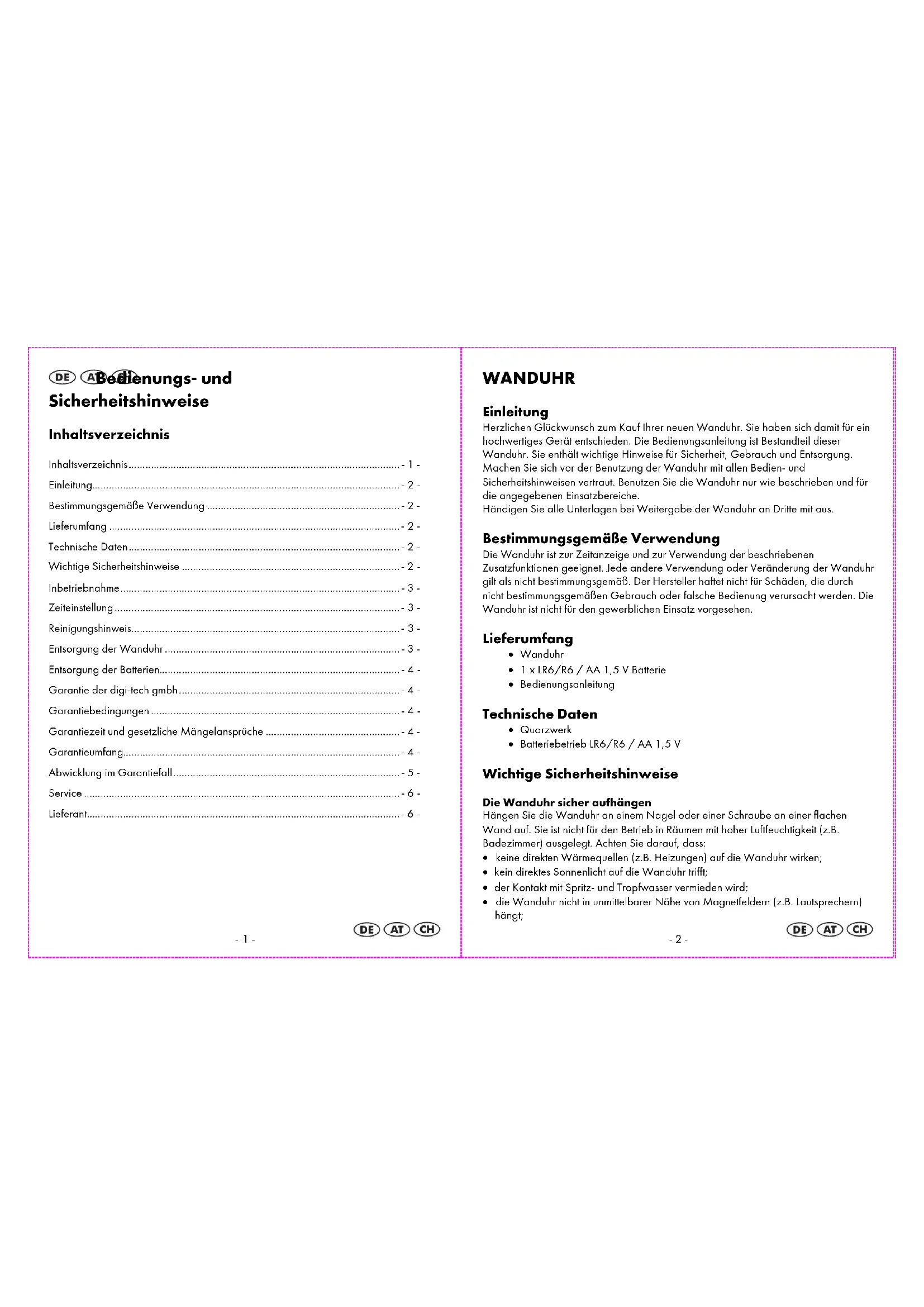 Entsorgung der Batterien Bitte entsorgen Sie Ihre Batterien sachgerecht in extra hierfür aufgestellten Gefäßen im Handel. Batterien gehören nicht in den Hausmüll. Entsorgen Sie Batterien bitte über einen zugelassenen Entsorgungsbetrieb oder über Ihre kommunale Entsorgungseinrichtung. Beachten Sie die aktuell geltenden Vorschriften. Setzen Sie sich im Zweifelsfall mit Ihrer Entsorgungseinrichtung in Verbindung. Garantie der digi-tech gmbh Sie erhalten auf diese Wanduhr 3 Jahre Garantie ab Kaufdatum. Im Falle von Mängeln dieser Wanduhr stehen Ihnen gegen den Verkäufer des Produkts gesetzliche Rechte zu. Diese gesetzlichen Rechte werden durch unsere im Folgenden dargestellte Garantie nicht eingeschränkt. Garantiebedingungen Die Garantiefrist beginnt mit dem Kaufdatum. Bitte bewahren Sie den Original Kassenbon gut auf. Diese Unterlage wird als Nachweis für den Kauf benötigt. Tritt innerhalb von drei Jahren ab dem Kaufdatum dieser Wanduhr ein Material- oder Fabrikationsfehler auf, wird die Wanduhr von uns – nach unserer Wahl – für Sie kostenlos repariert oder ersetzt. Diese Garantieleistung setzt voraus, dass innerhalb der Drei-Jahres-Frist die defekte Wanduhr und der Kaufbeleg (Kassenbon) vorgelegt und schriftlich kurz beschrieben wird, worin der Mangel besteht und wann er aufgetreten ist. Wenn der Defekt von unserer Garantie gedeckt ist, erhalten Sie die reparierte oder eine neue Wanduhr zurück. Mit Reparatur oder Austausch des Produkts beginnt kein neuer Garantiezeitraum. Garantiezeit und gesetzliche Mängelansprüche Die Garantiezeit wird durch die Gewährleistung nicht verlängert. Dies gilt auch für ersetzte und reparierte Teile. Eventuell schon beim Kauf vorhandene Schäden und Mängel müssen sofort nach dem Auspacken gemeldet werden. Nach Ablauf der Garantiezeit anfallende Reparaturen sind kostenpflichtig. Garantieumfang Die Wanduhr wurde nach strengen Qualitätsrichtlinien sorgfältig produziert und vor Anlieferung gewissenhaft geprüft. Die Garantieleistung gilt für Material- oder Fabrikationsfehler. Diese Garantie erstreckt sich nicht auf Produktteile, die normaler Abnutzung ausgesetzt sind und daher als Verschleißteile angesehen werden können oder für Beschädigungen an zerbrechlichen Teilen, z. B. Schalter, Akkus oder die aus Glas gefertigt sind.-