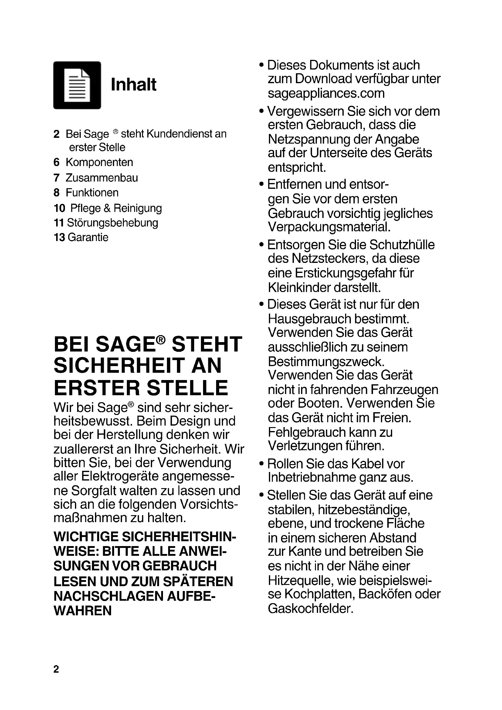 steht Kundendienst an erster Stelle 6 Komponenten 7 Zusammenbau 8 Funktionen 10 Pege & Reinigung 11 Störungsbehebung 13 Garantie BEI SAGE