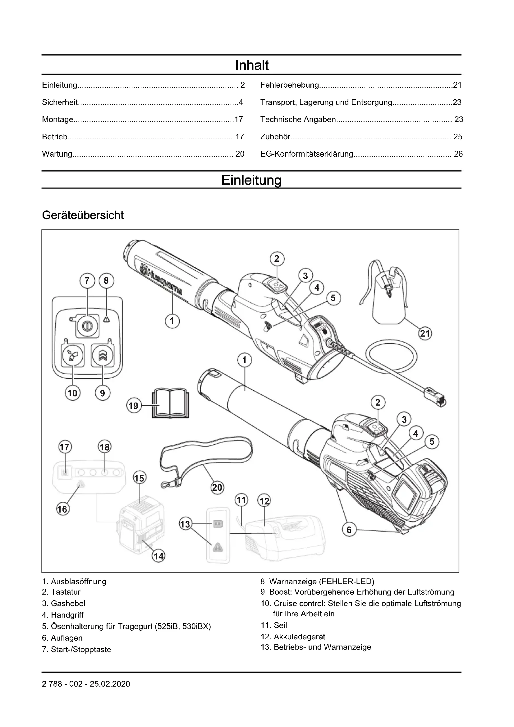 1. Ausblasöffnung2. Tastatur3. Gashebel4. Handgriff5. Ösenhalterung für Tragegurt (525iB, 530iBX)6. Auflagen7. Start-/Stopptaste8. Warnanzeige (FEHLER-LED)9. Boost: Vorübergehende Erhöhung der Luftströmung10. Cruise control: Stellen Sie die optimale Luftströmungfür Ihre Arbeit ein11. Seil12. Akkuladegerät13. Betriebs- und Warnanzeige2 788 - 002 - 25.02.202014. Akkuentriegelungstaste