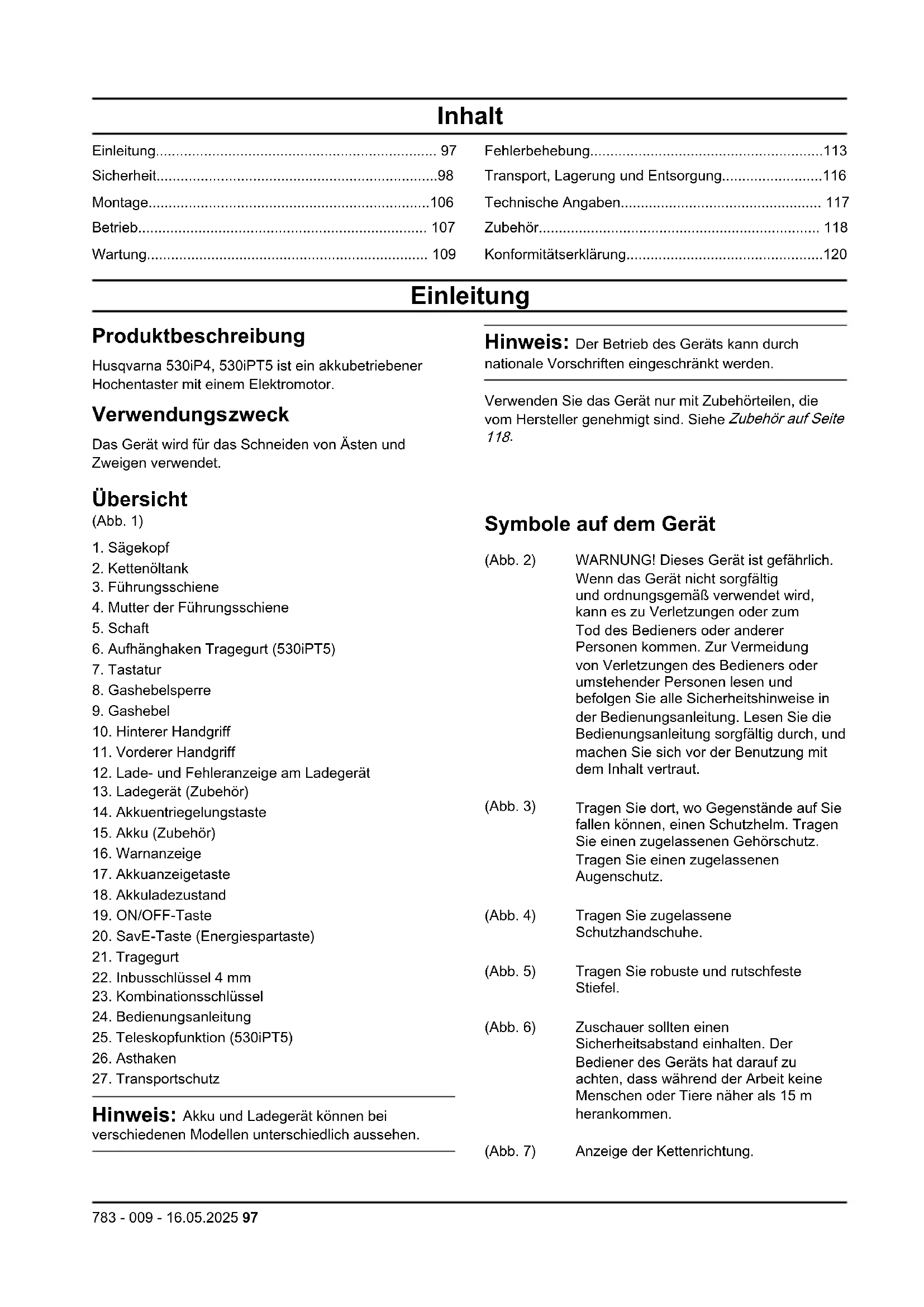 - Tekniske data på side 94 vedr. oplysninger om støjemission. Huskvarna, 2025-04-15 Stefan Holmberg, R&D Director, Technology Management, Husqvarna AB Ansvarlig for teknisk dokumentation 96 783 - 009 - 16.05.2025Inhalt Einleitung p. 97