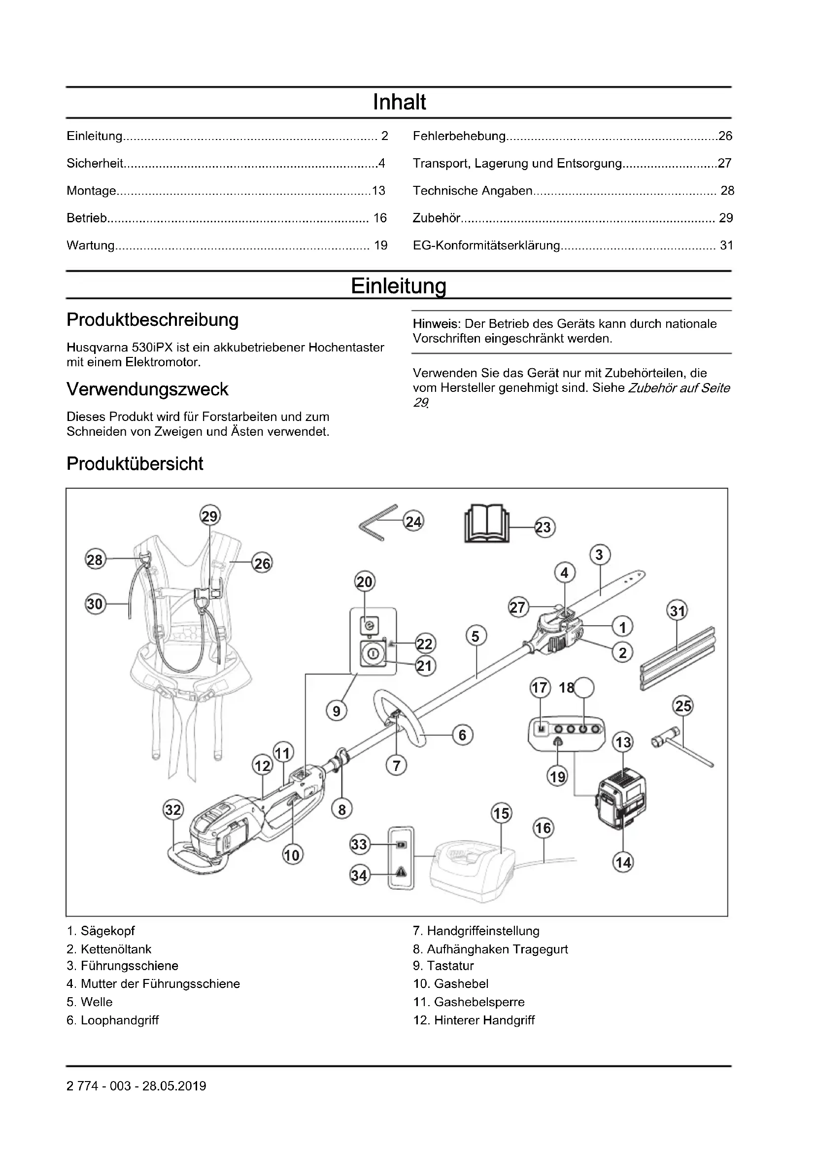 - EG-Konformitätserklärung Einleitung Produktbeschreibung Husqvarna 530iPX ist ein akkubetriebener Hochentaster mit einem Elektromotor. Verwendungszweck Dieses Produkt wird für Forstarbeiten und zum Schneiden von Zweigen und Ästen verwendet. Hinweis: Der Betrieb des Geräts kann durch nationale Vorschriften eingeschränkt werden. Verwenden Sie das Gerät nur mit Zubehörteilen, die vom Hersteller genehmigt sind. Siehe Zubehör auf Seite p. 31