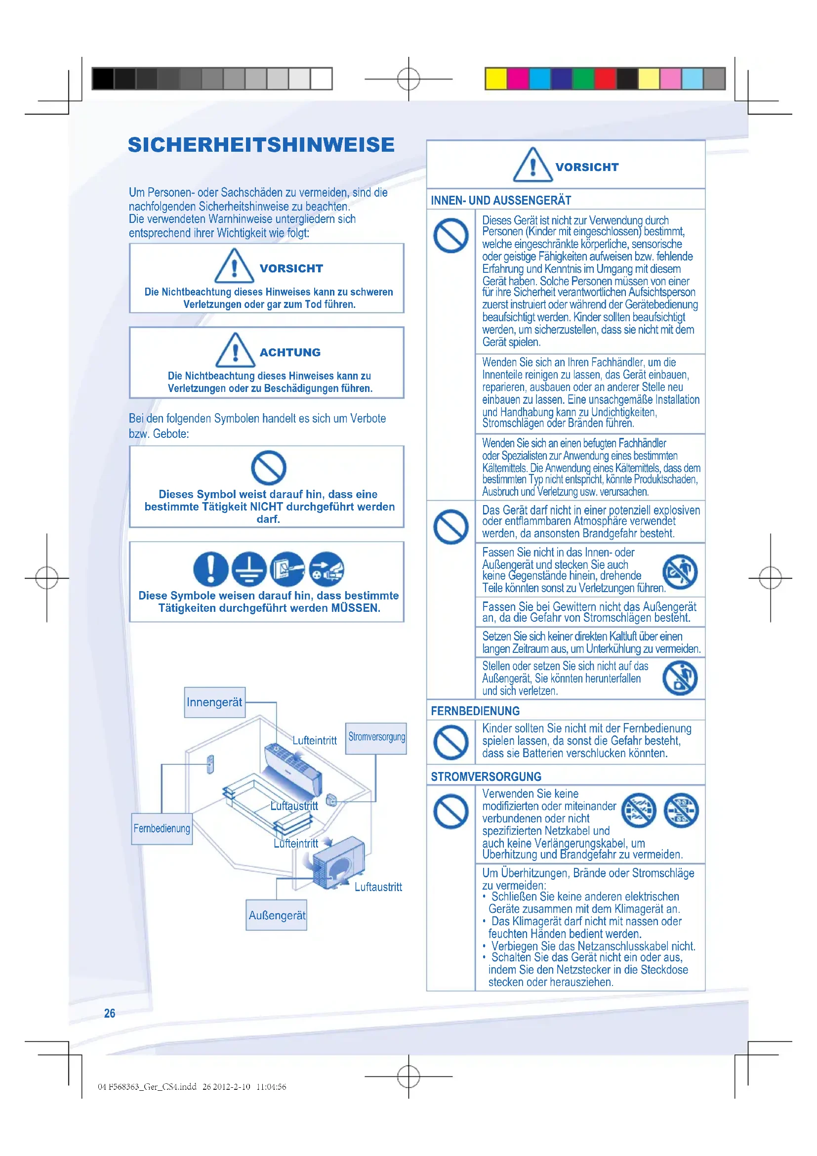 - Schalten Sie das Gerät nicht ein oder aus, indem Sie den Netzstecker in die Steckdose stecken oder herausziehen. Luftaustritt Lufteintritt Fernbedienung Stromversorgung Innengerät Außengerät Lufteintritt Luftaustritt Luftaustritt 04 F568363_Ger_CS4.indd 26 2012-2-10 11:04:56DEUTSCH