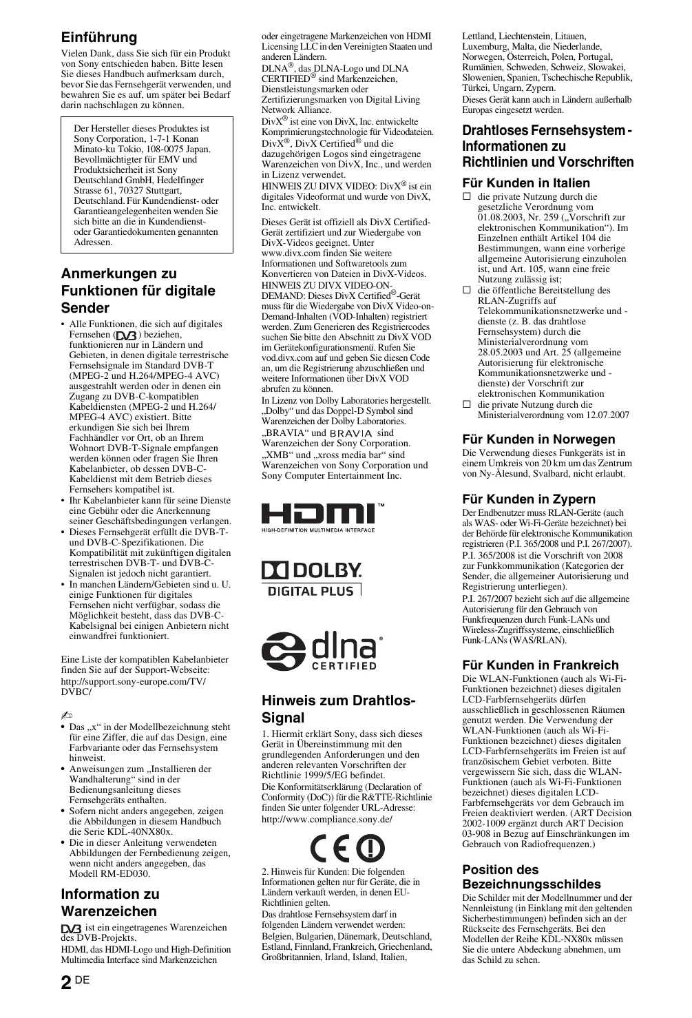 - Die in dieser Anleitung verwendeten Abbildungen der Fernbedienung zeigen, wenn nicht anders angegeben, das Modell RM-ED030. Information zu Warenzeichen ist ein eingetragenes Warenzeichen des DVB-Projekts. HDMI, das HDMI-Logo und High-Definition Multimedia Interface sind Markenzeichen 2 DE oder eingetragene Markenzeichen von HDMI Licensing LLC in den Vereinigten Staaten und anderen Ländern. DLNA®, das DLNA-Logo und DLNA CERTIFIED® sind Markenzeichen, Dienstleistungsmarken oder Zertifizierungsmarken von Digital Living Network Alliance. DivX® ist eine von DivX, Inc. entwickelte Komprimierungstechnologie für Videodateien. DivX®, DivX Certified® und die dazugehörigen Logos sind eingetragene Warenzeichen von DivX, Inc., und werden in Lizenz verwendet. HINWEIS ZU DIVX VIDEO: DivX® ist ein digitales Videoformat und wurde von DivX, Inc. entwickelt. Dieses Gerät ist offiziell als DivX CertifiedGerät zertifiziert und zur Wiedergabe von DivX-Videos geeignet. Unter www.divx.com finden Sie weitere Informationen und Softwaretools zum Konvertieren von Dateien in DivX-Videos. HINWEIS ZU DIVX VIDEO-ONDEMAND: Dieses DivX Certified®-Gerät muss für die Wiedergabe von DivX Video-onDemand-Inhalten (VOD-Inhalten) registriert werden. Zum Generieren des Registriercodes suchen Sie bitte den Abschnitt zu DivX VOD im Gerätekonfigurationsmenü. Rufen Sie vod.divx.com auf und geben Sie diesen Code an, um die Registrierung abzuschließen und weitere Informationen über DivX VOD abrufen zu können. In Lizenz von Dolby Laboratories hergestellt. „Dolby“ und das Doppel-D Symbol sind Warenzeichen der Dolby Laboratories. „BRAVIA“ und sind Warenzeichen der Sony Corporation. „XMB“ und „xross media bar“ sind Warenzeichen von Sony Corporation und Sony Computer Entertainment Inc. Lettland, Liechtenstein, Litauen, Luxemburg, Malta, die Niederlande, Norwegen, Österreich, Polen, Portugal, Rumänien, Schweden, Schweiz, Slowakei, Slowenien, Spanien, Tschechische Republik, Türkei, Ungarn, Zypern. Dieses Gerät kann auch in Ländern außerhalb Europas eingesetzt werden. Drahtloses Fernsehsystem Informationen zu Richtlinien und Vorschriften Für Kunden in Italien s die private Nutzung durch die gesetzliche Verordnung vom